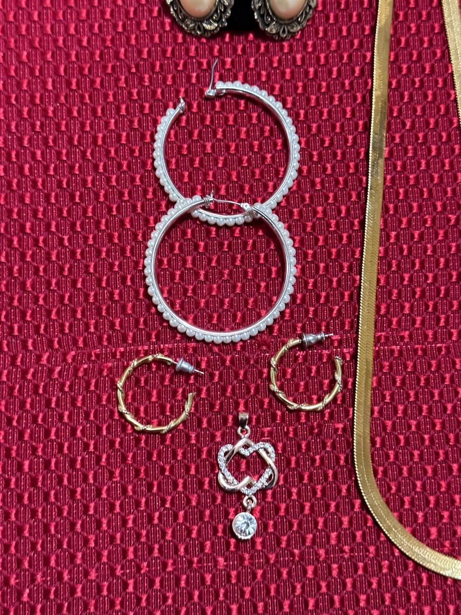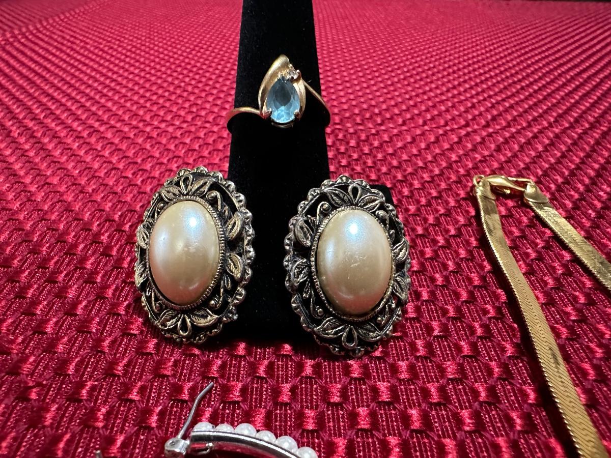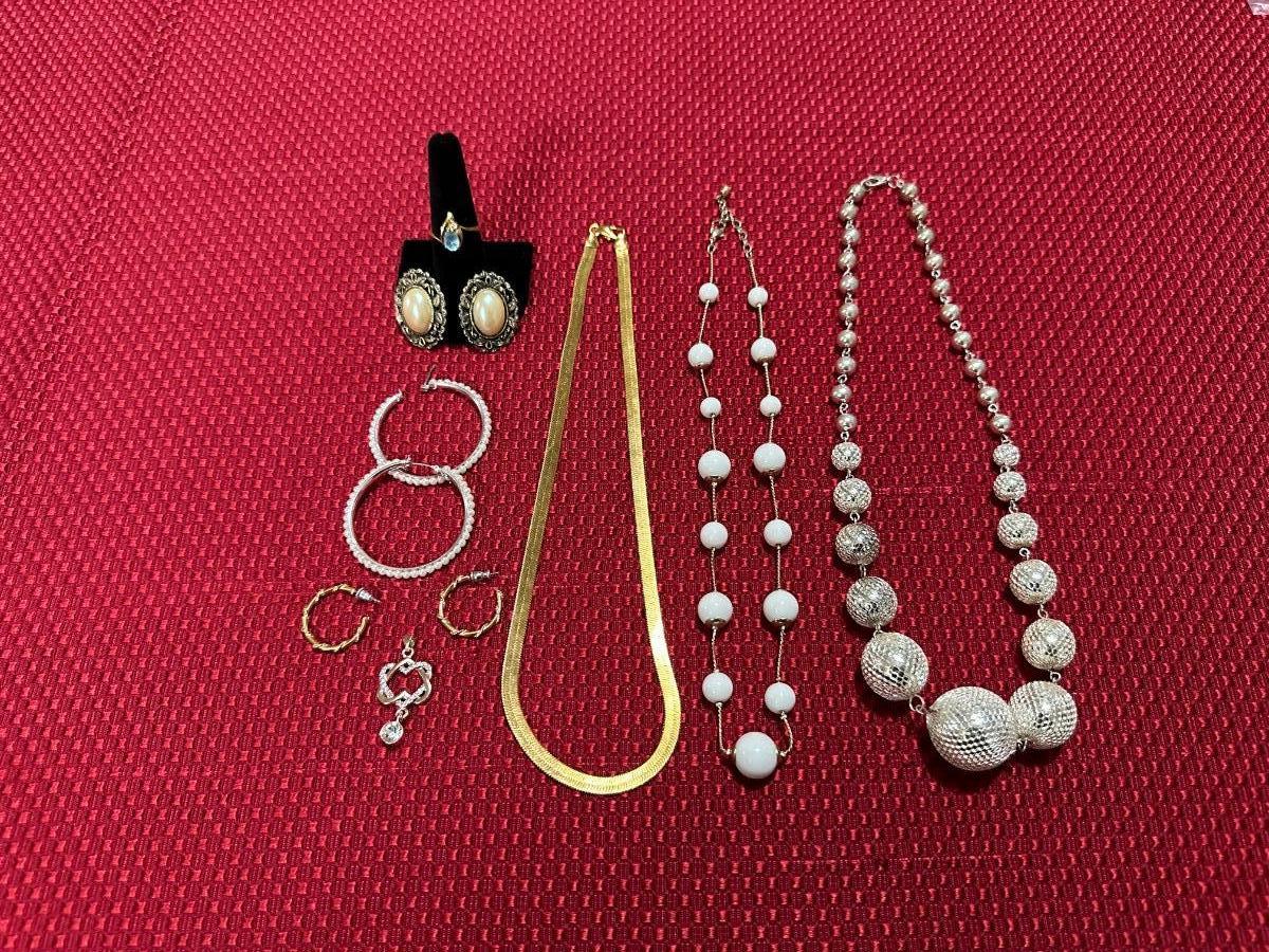 Lot contains 3 necklaces, 3 sets of beautiful earrings, 1 pendant and a size 7-1/2 ring.