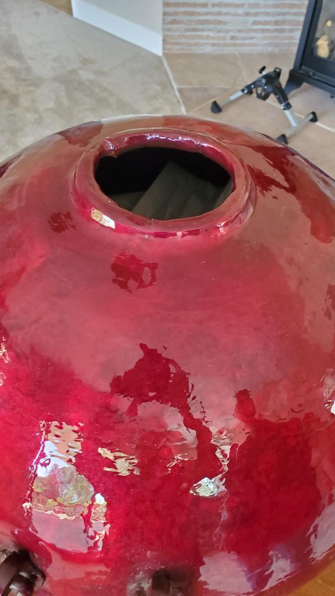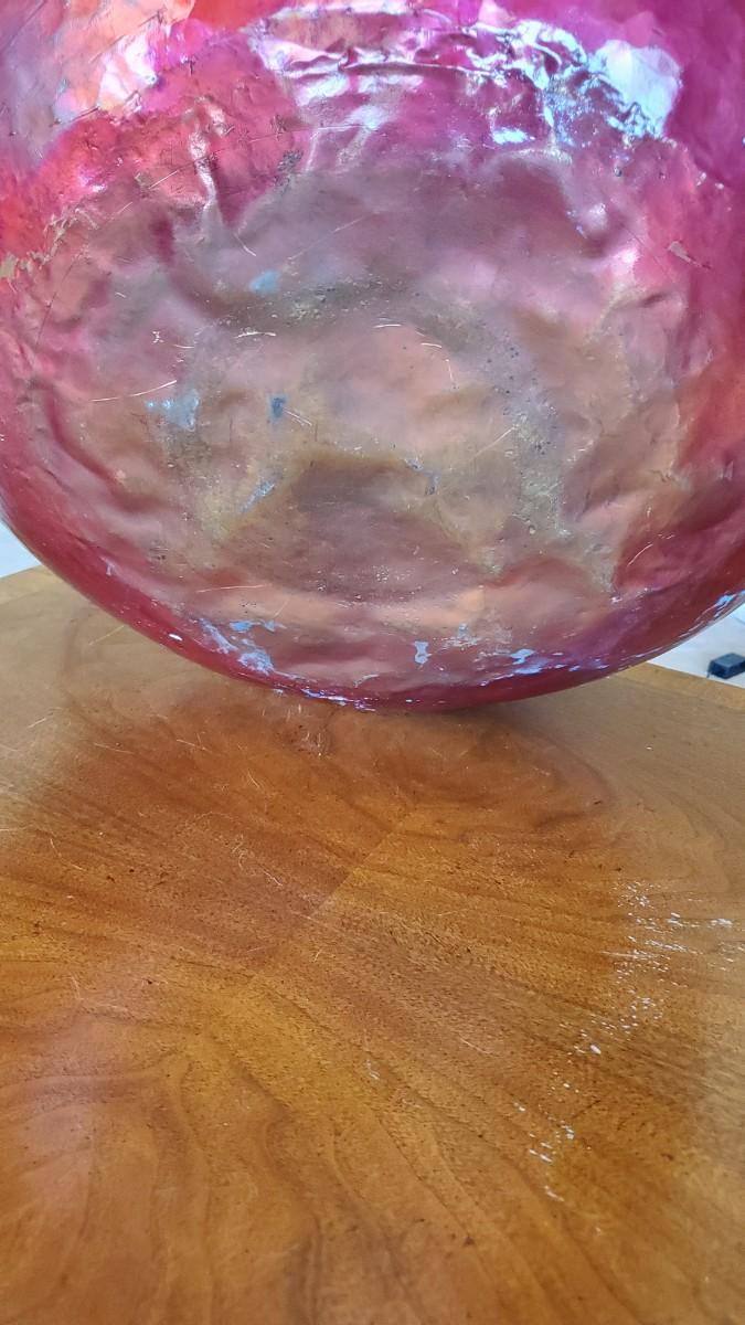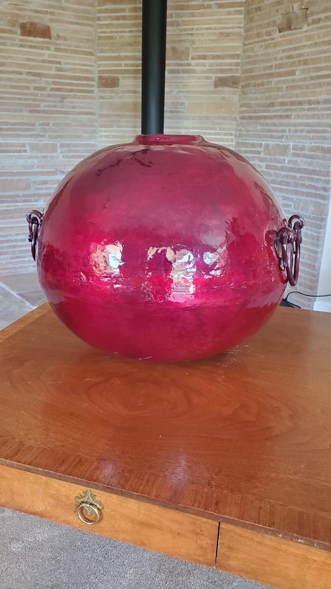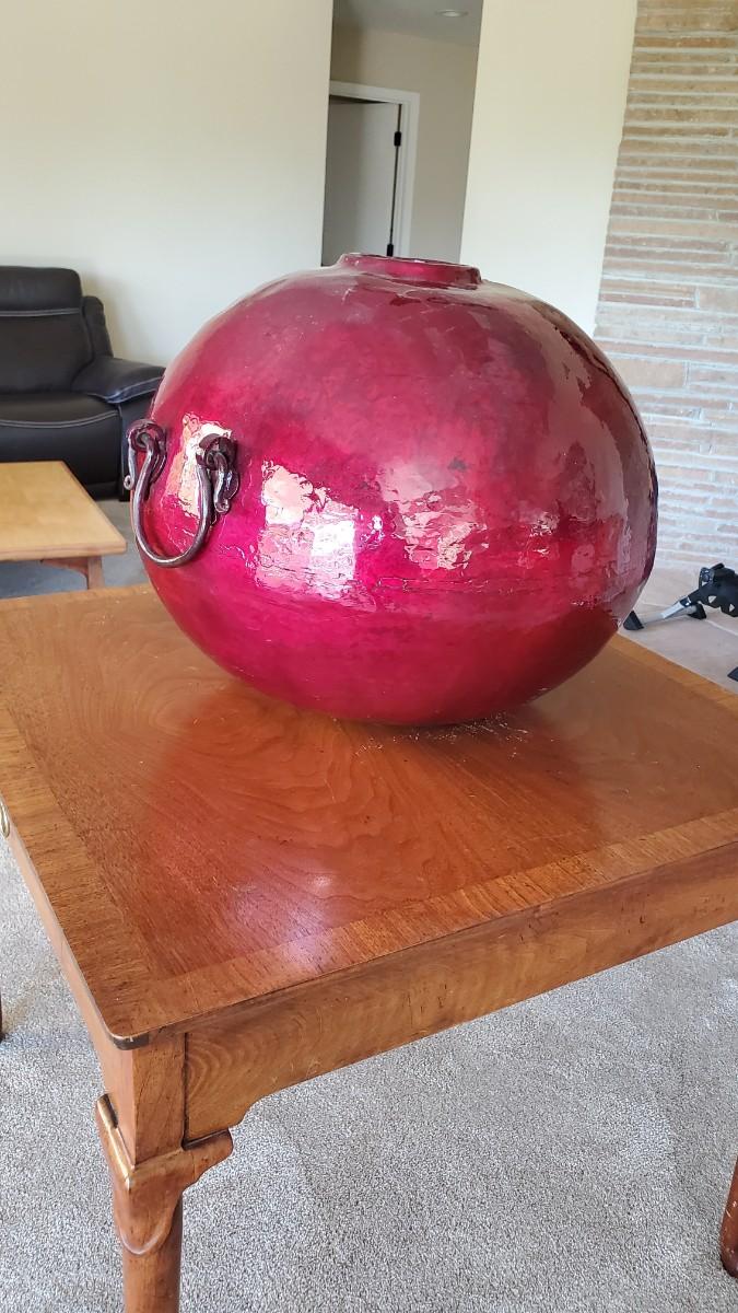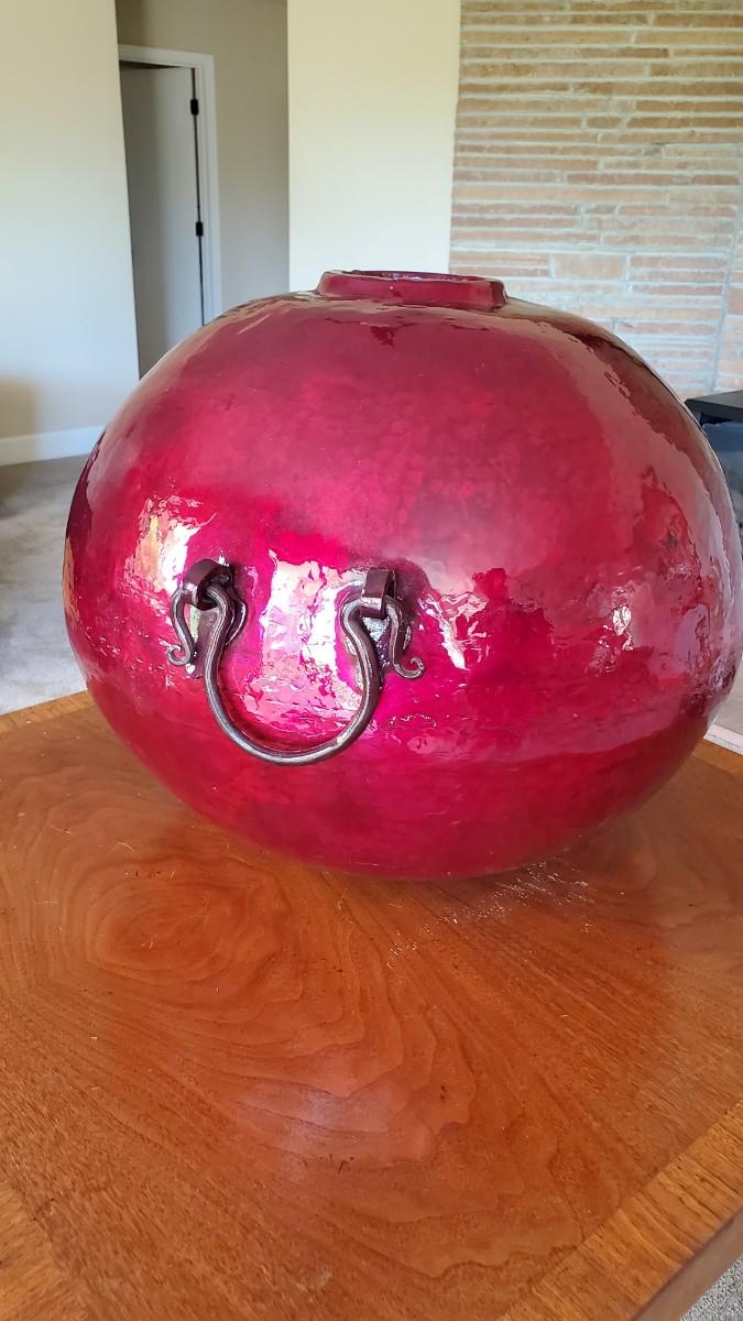 Vibrant palace size enameled heavy Copper Vase with hand forged handles
