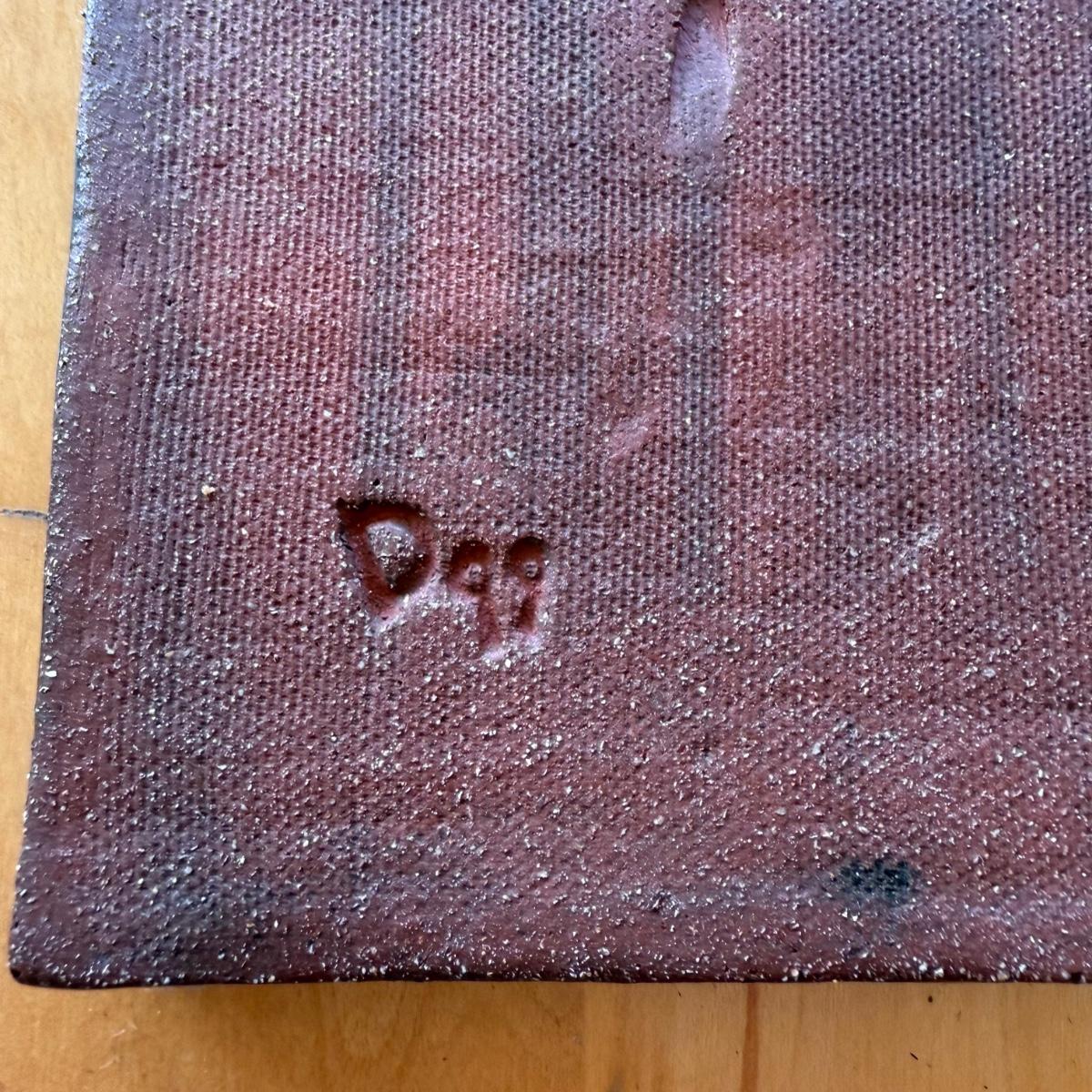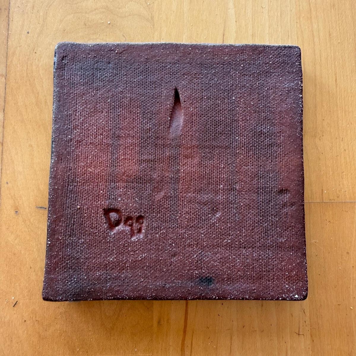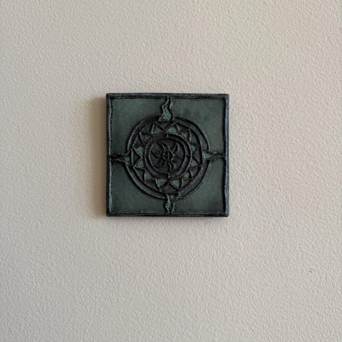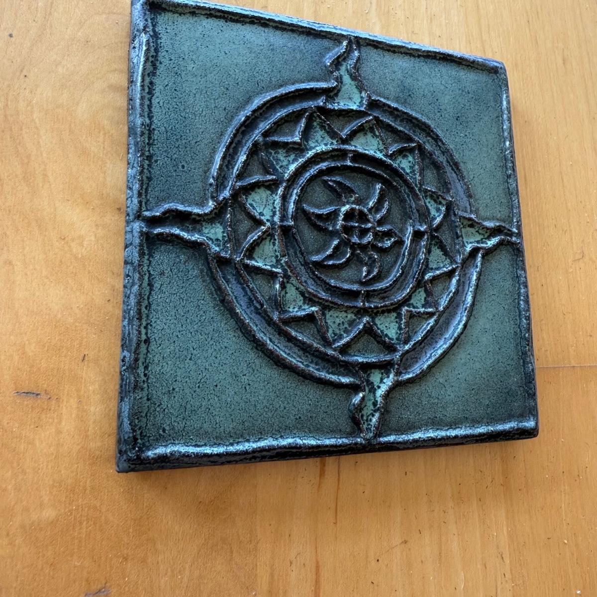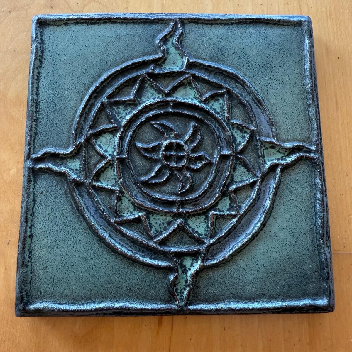 This lot contains a handmade piece of ceramic tile art. The piece measures 4” x 4” and features a vibrant sun on a teal background. There is an indent on the back to be hung and it is signed ‘D 99’. Shipping available.