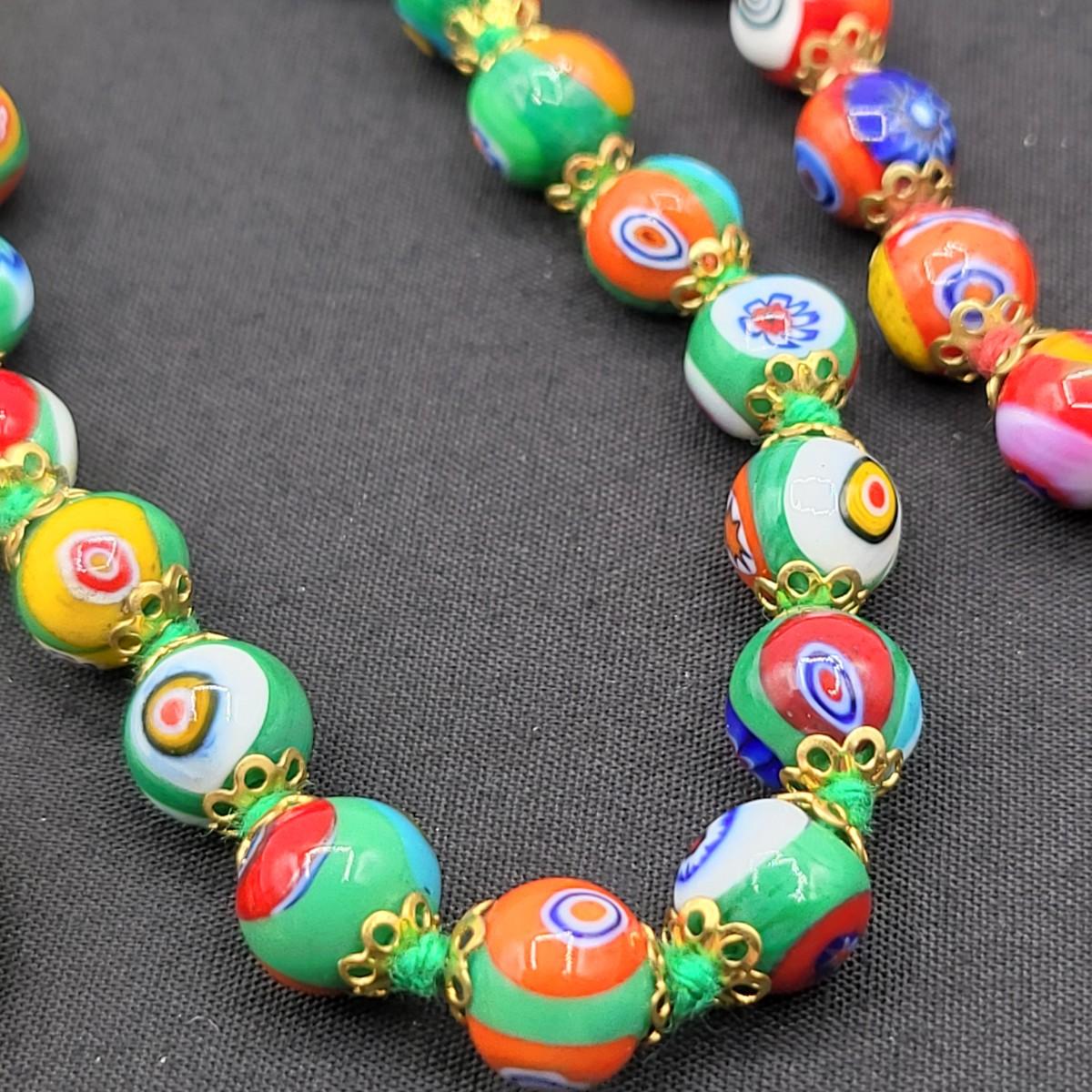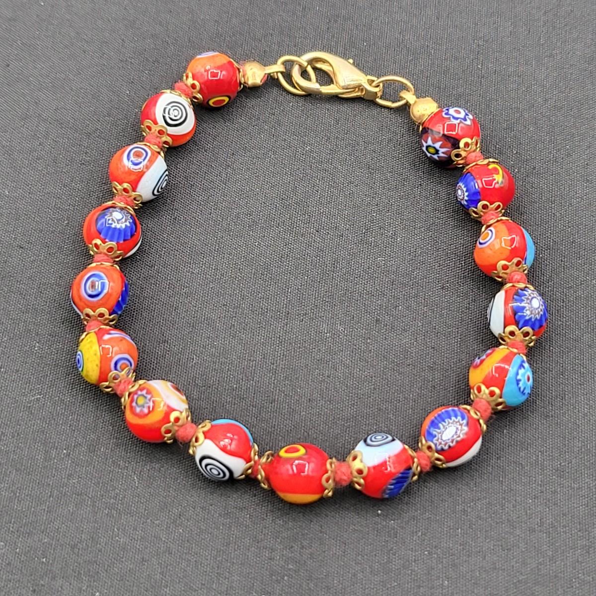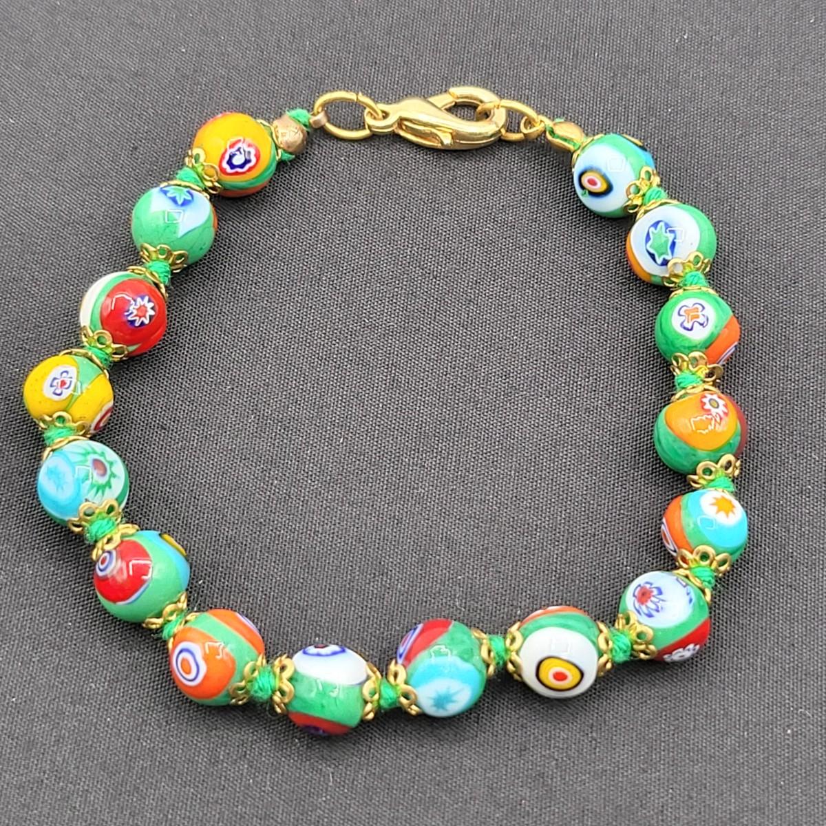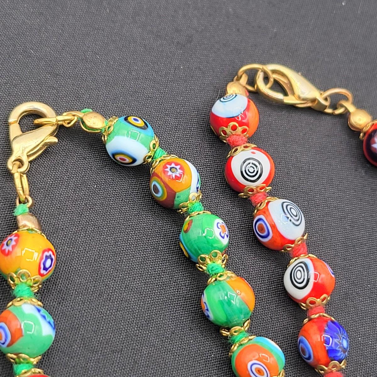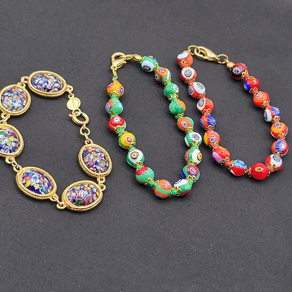 Three vintage Italian Murano/Millefiori/Venitian art multi-colored glass bead bracelets, measuring 7" and 7.5”. All are set in gold tone metal. The oval link bracelet is marked Accessocraft N.Y.C. Each glass bead is unique in it's design pattern.