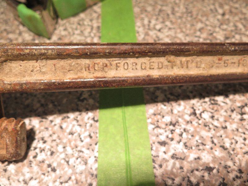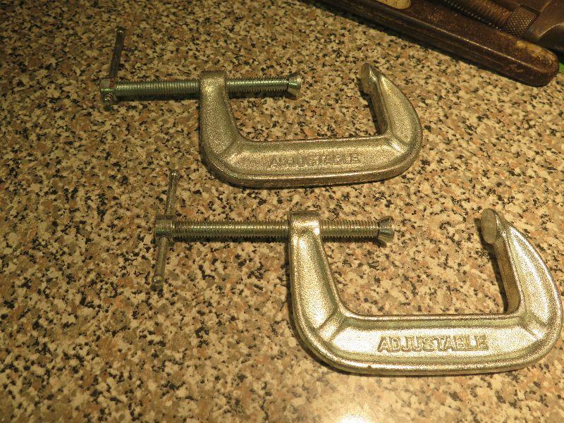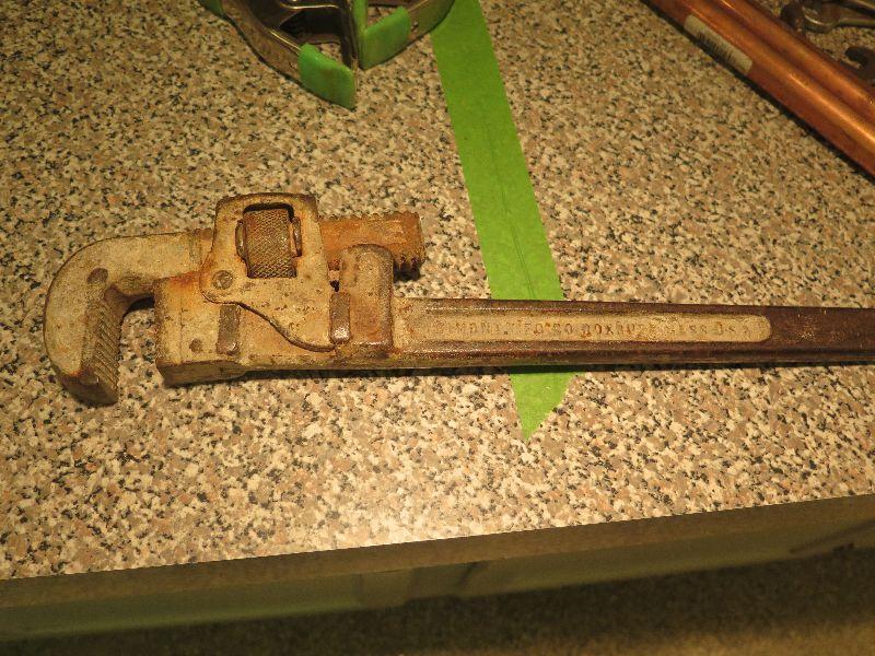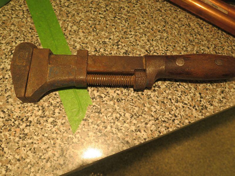 Small vice grip, clamps, wooden handle adjustable monkey/hammer Pexio wrench tool, and another vintage monkey/hammer. Bring box to remove from basement. Wooden Handle Adjustable Monkey/Hammer Pexio Wrench Tool