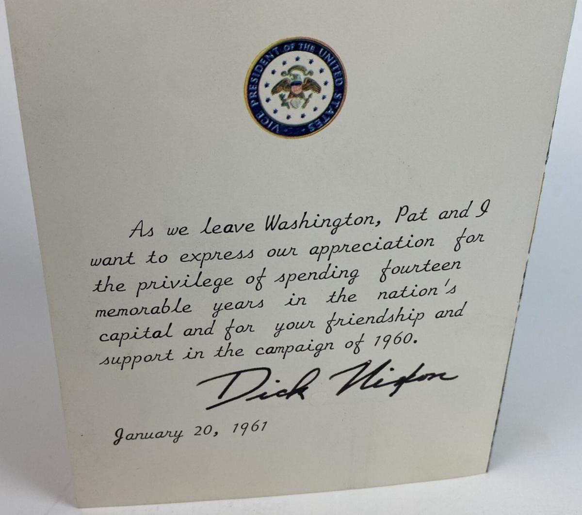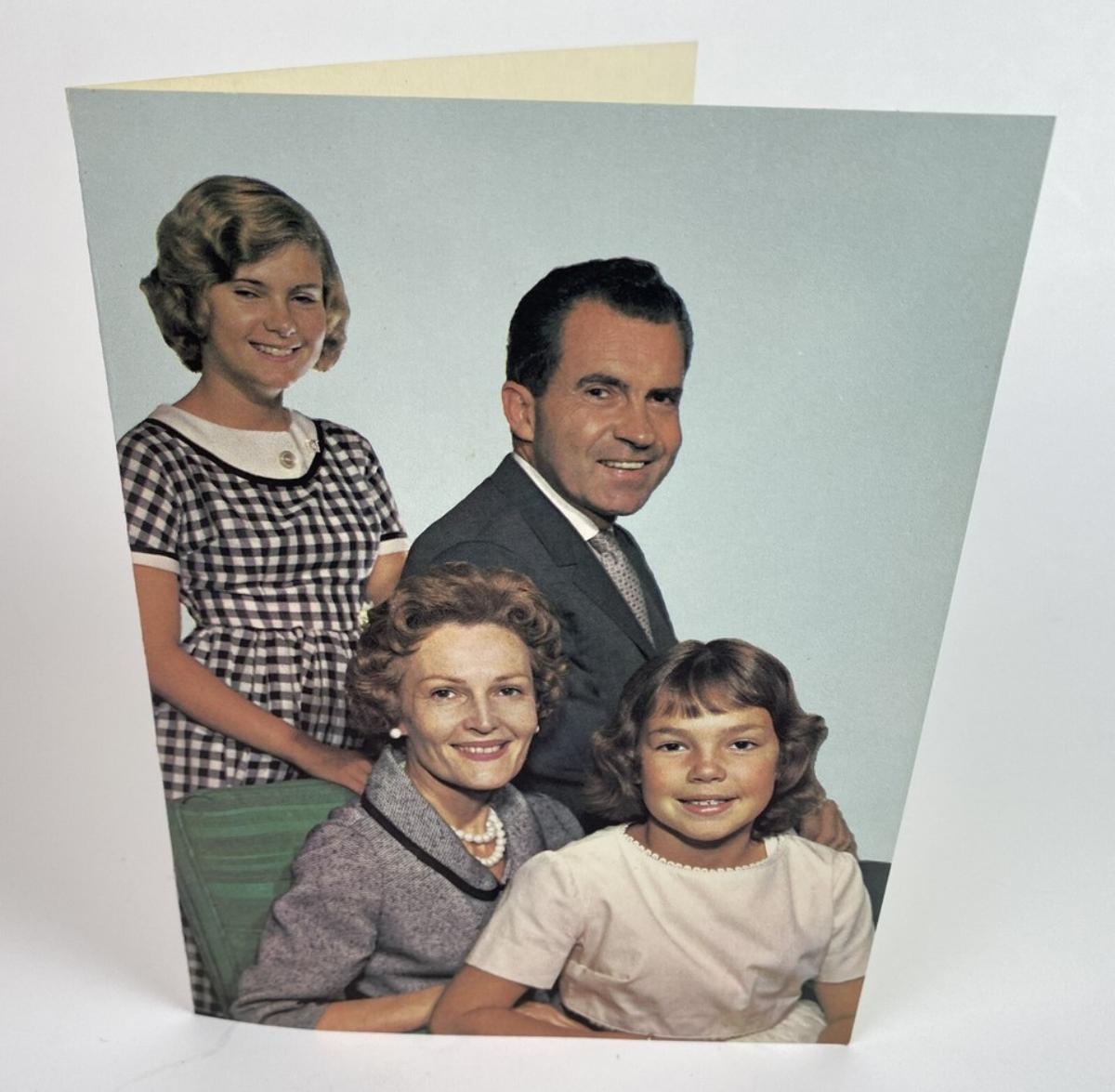 Here is an original 6 x 4.5" folded farewell card to supporters from then Vice President Richard M. Nixon and family upon his loss in the 1960 Presidential Campaign.
