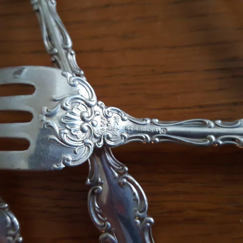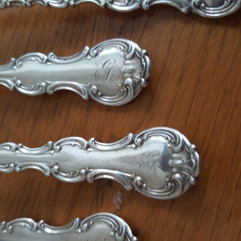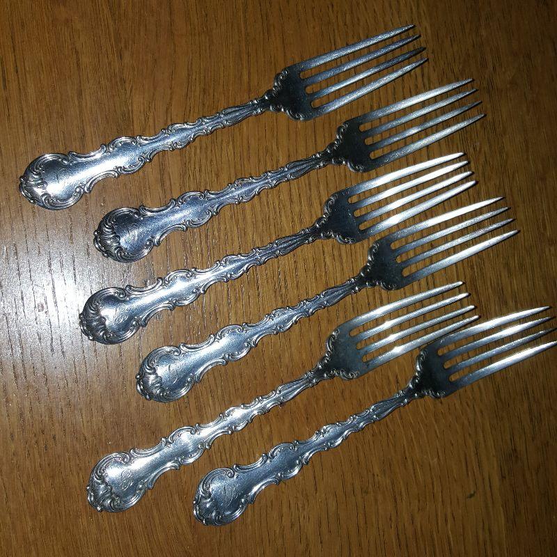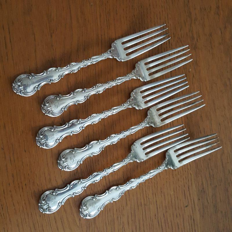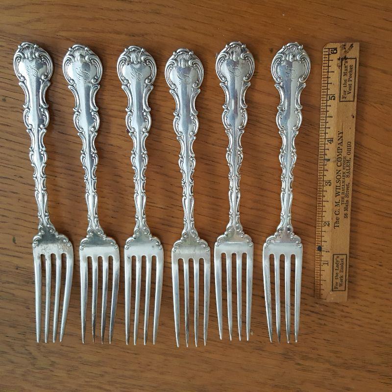 This auction lot is for a set of six Victor Lorch Sterling Silver Dessert Forks. This antique sterling silver forks are engraved with the letter "G." The total weight of the six forks is about 7.447ozt on our scale. The forks are marked sterling and four of the six have the Victor Lorch mark. The starting price is the reserve price for this item.
