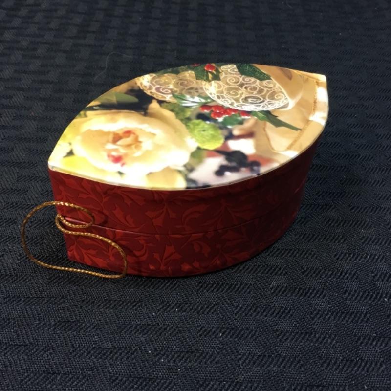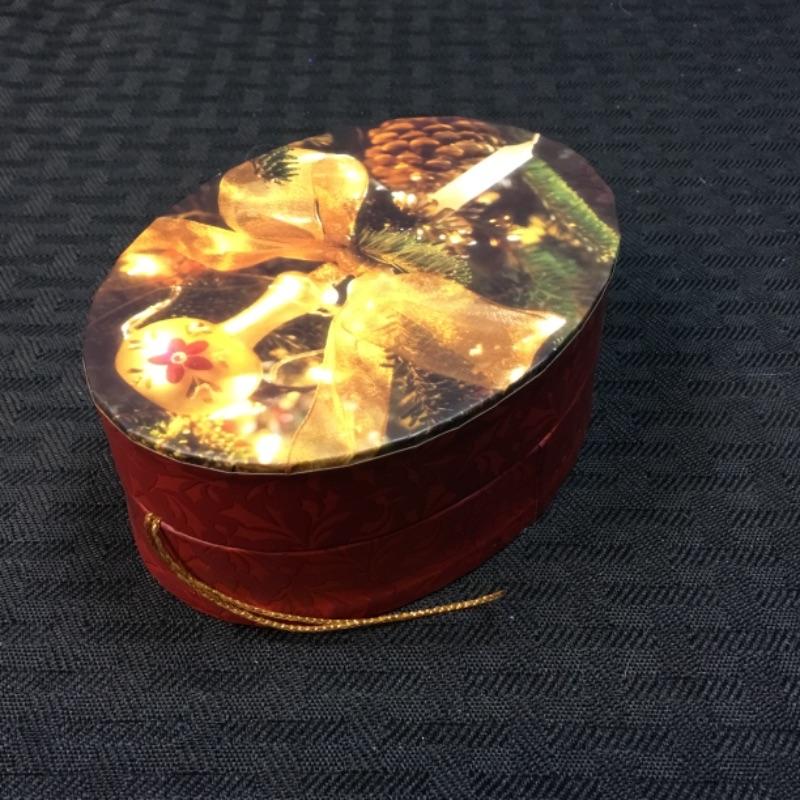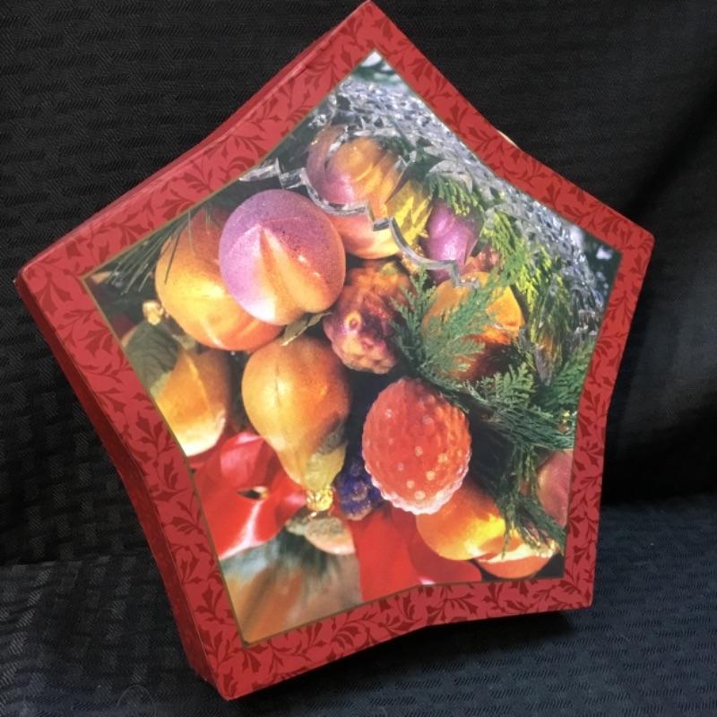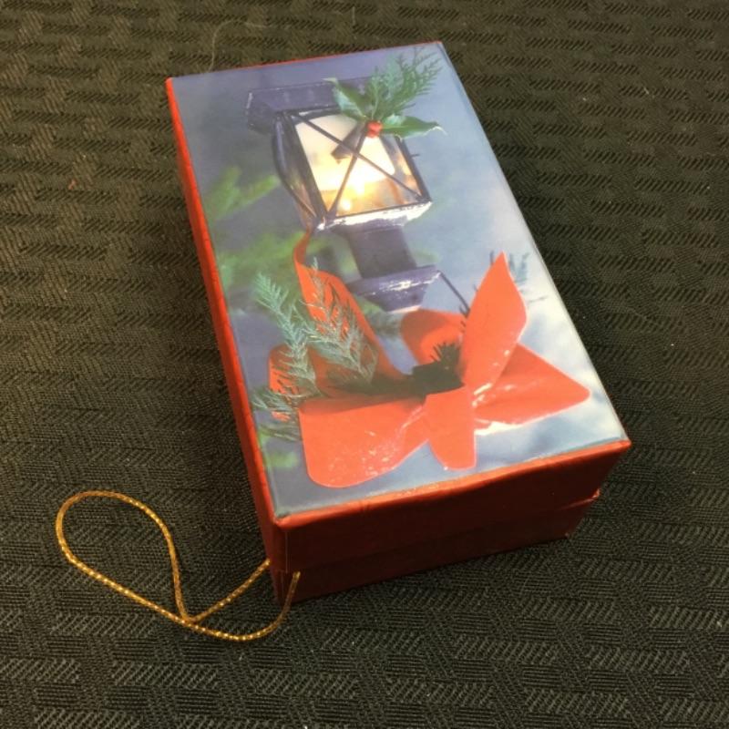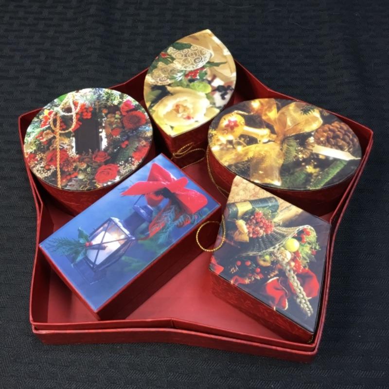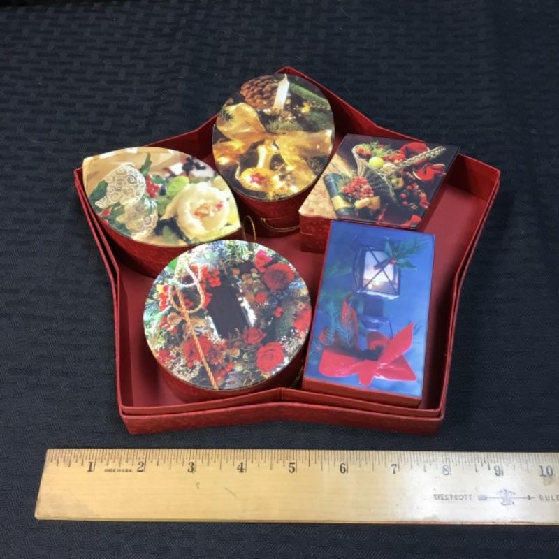 A set of five holiday ornaments that double as tiny gift boxes. These appear to be gently used in excellent condition; see pictures.