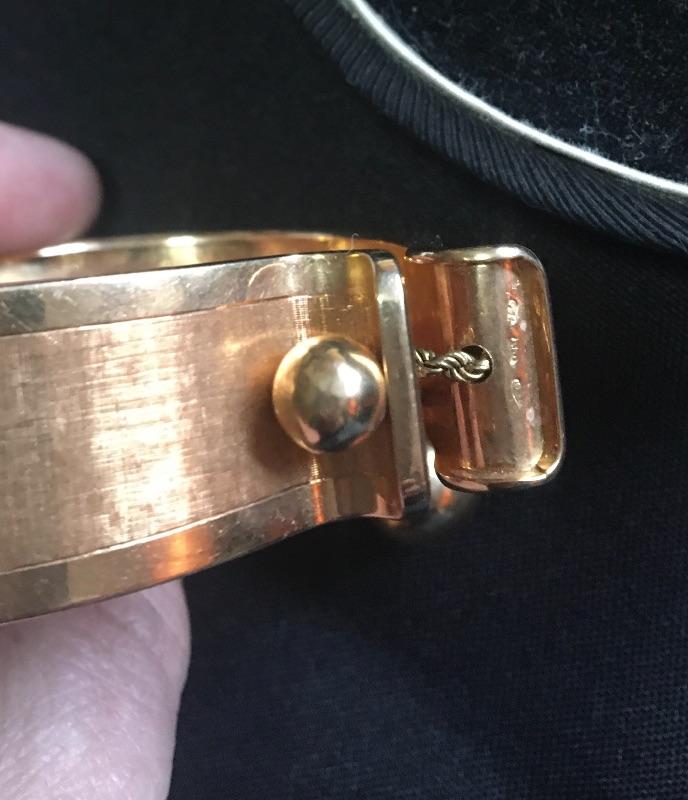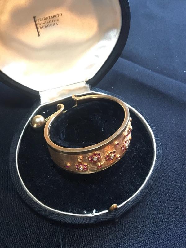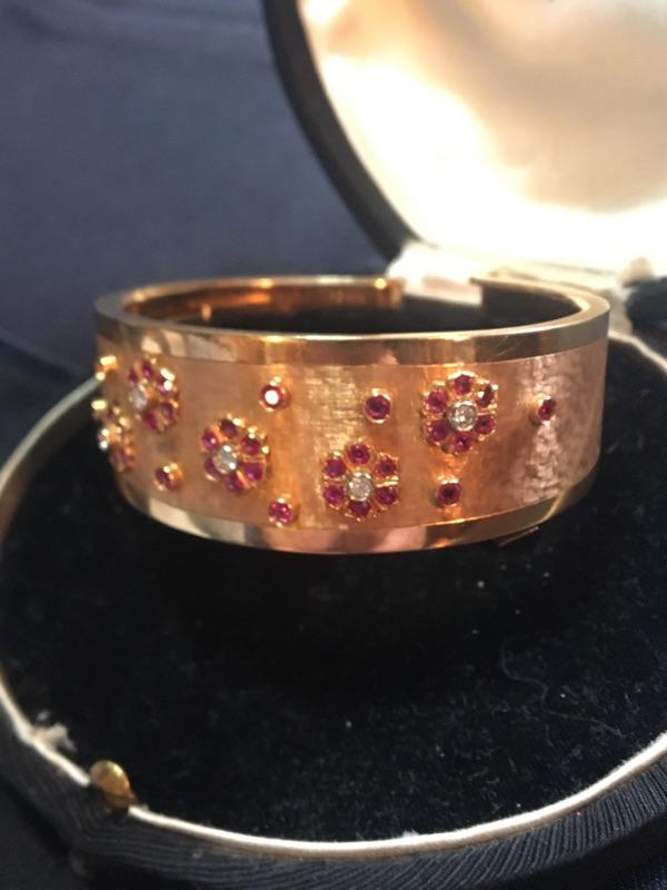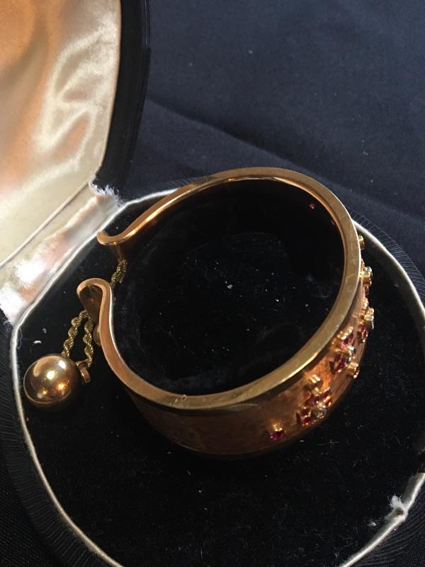 Very good overall condition. Markings illegible. Width measures 1”. Opening measures 2.5” across. One Ruby missing. Please see pictures for details. Packaging and shipping services available. Please contact us, if you need a shipping quote, before bidding.