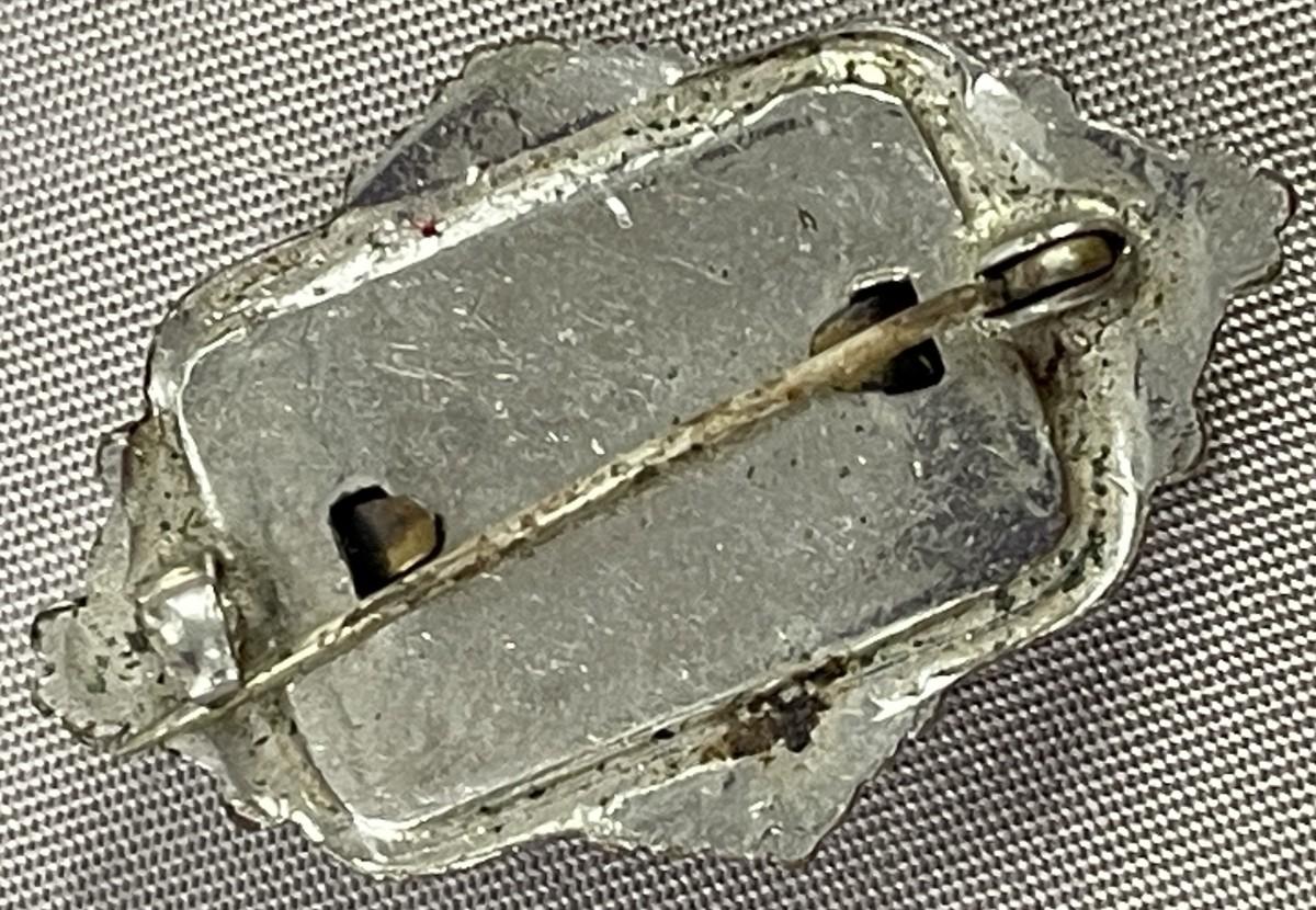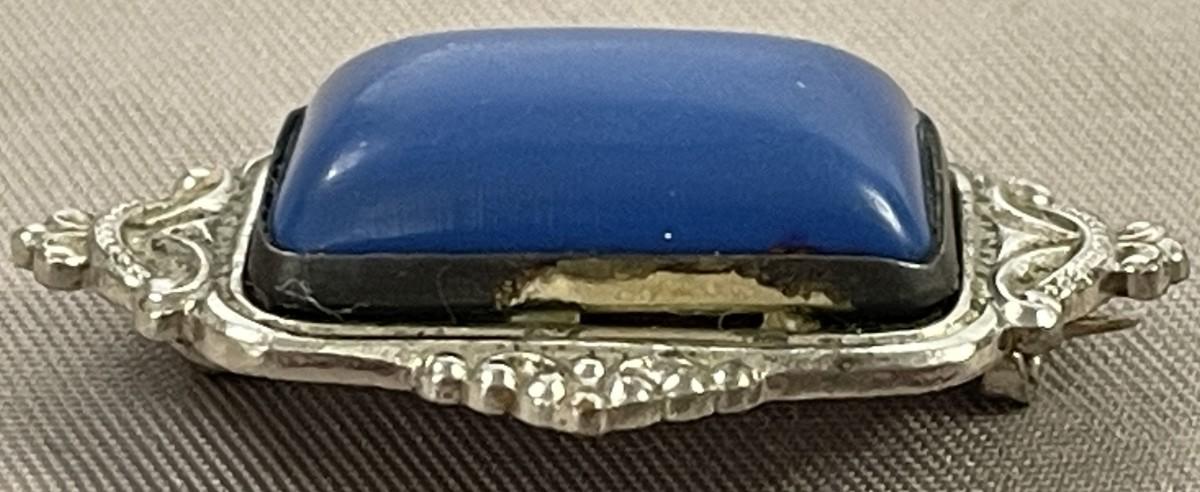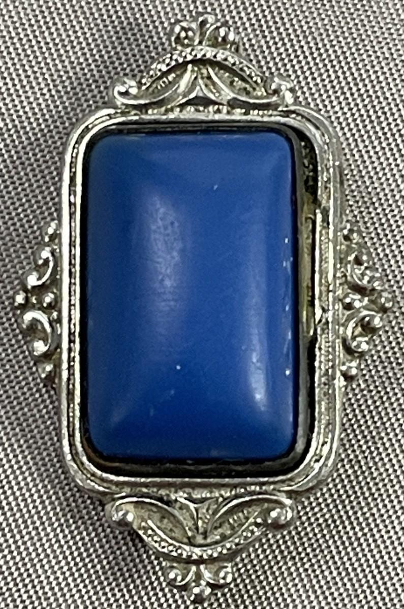 This pin has a pretty blue rectangular stone in the center and measures about 1.25 inches by 0.75 inches.