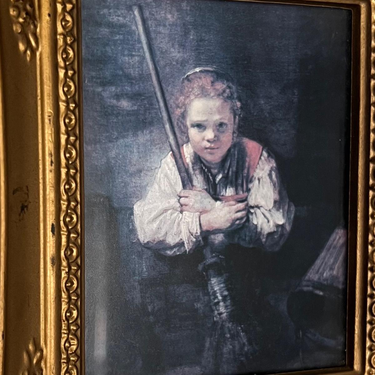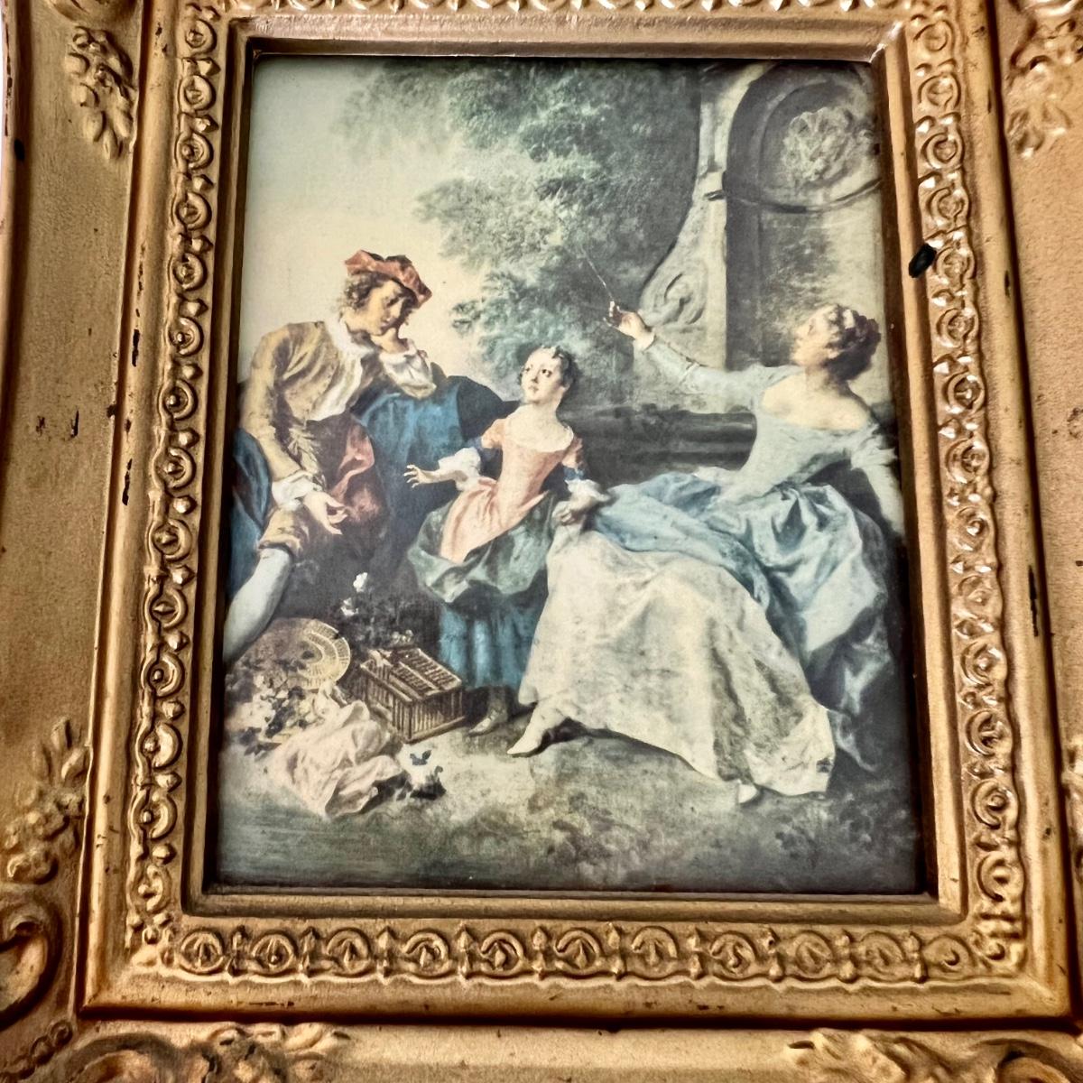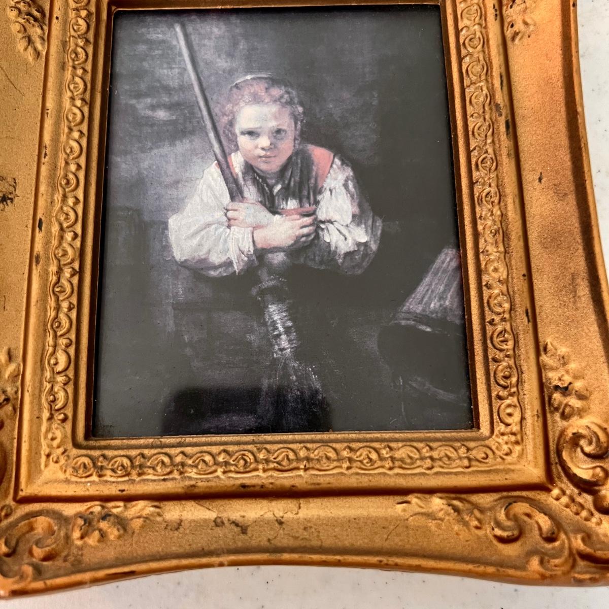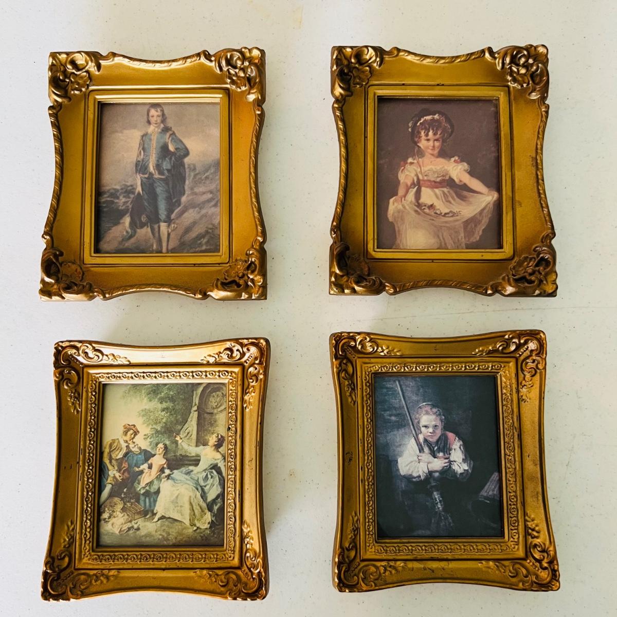 Four small framed prints of notable art work. Two larger prints measure 6.5” x 7.5”. All with resin and glass frames. Shipping available.