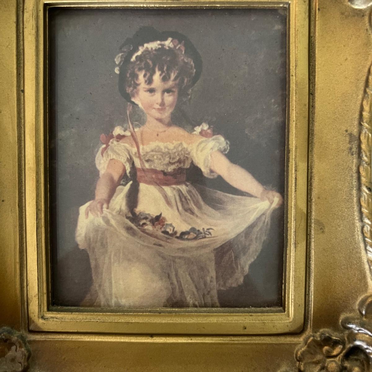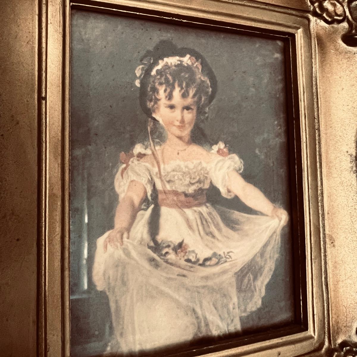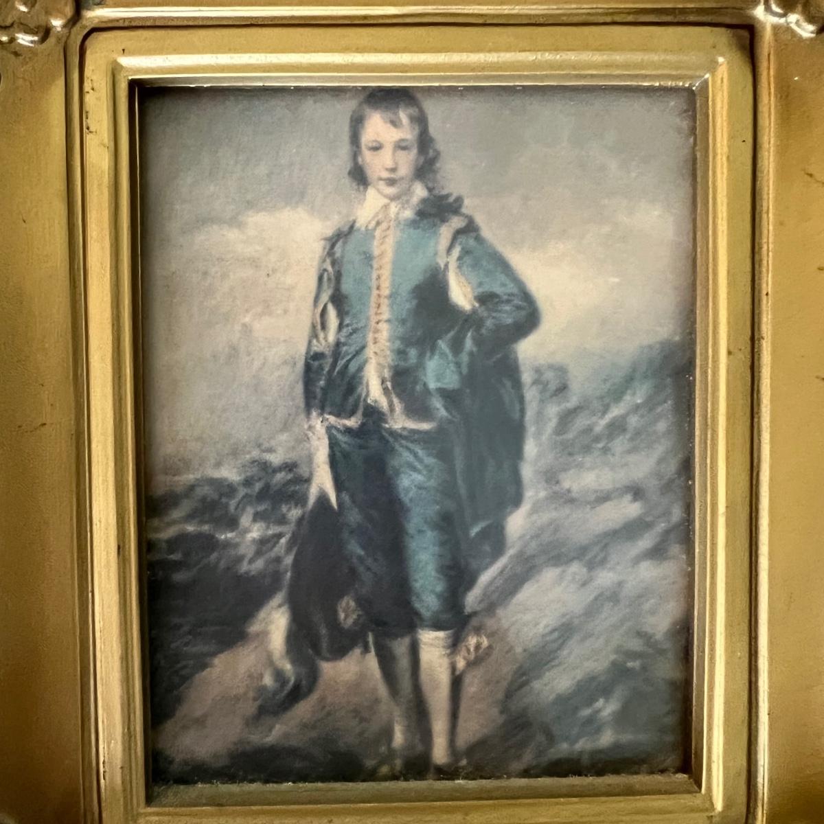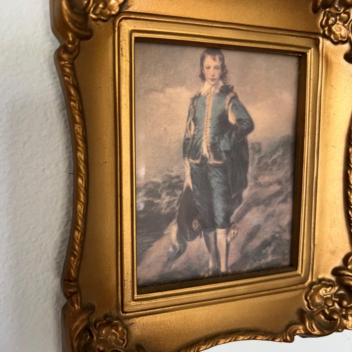 Four small framed prints of notable art work. Two larger prints measure 6.5” x 7.5”. All with resin and glass frames. Shipping available.