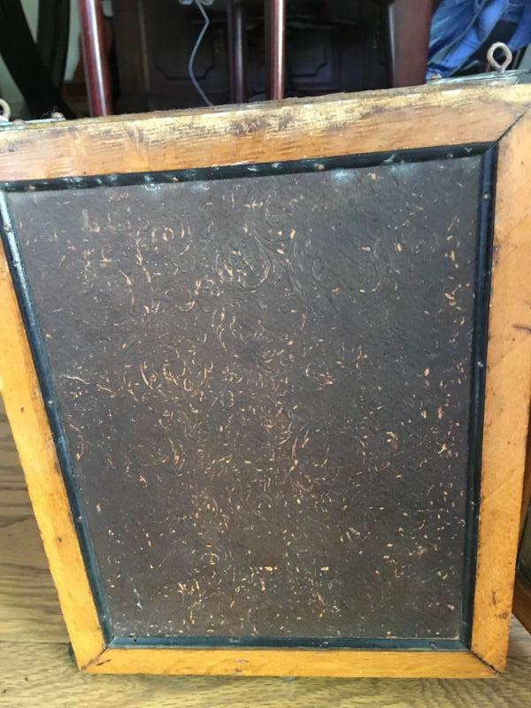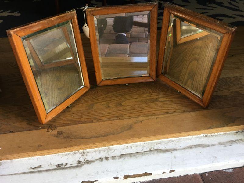 Three folding facets, walnut wood with beveled glass, brass footed with brass hinges. only blemish is small darkening of the 3rd mirror bottom left (about 1cm). The back seems to be leather.. Each facet measures 8.5" X 10".