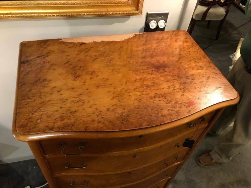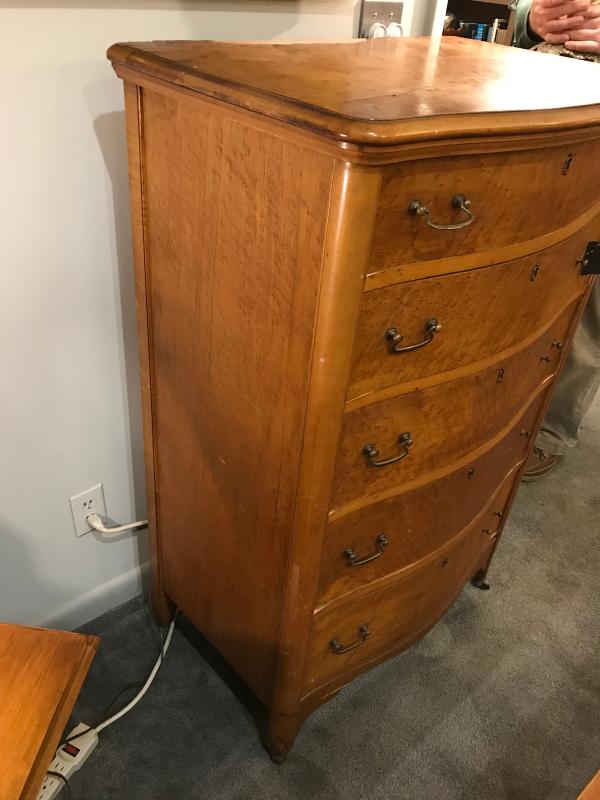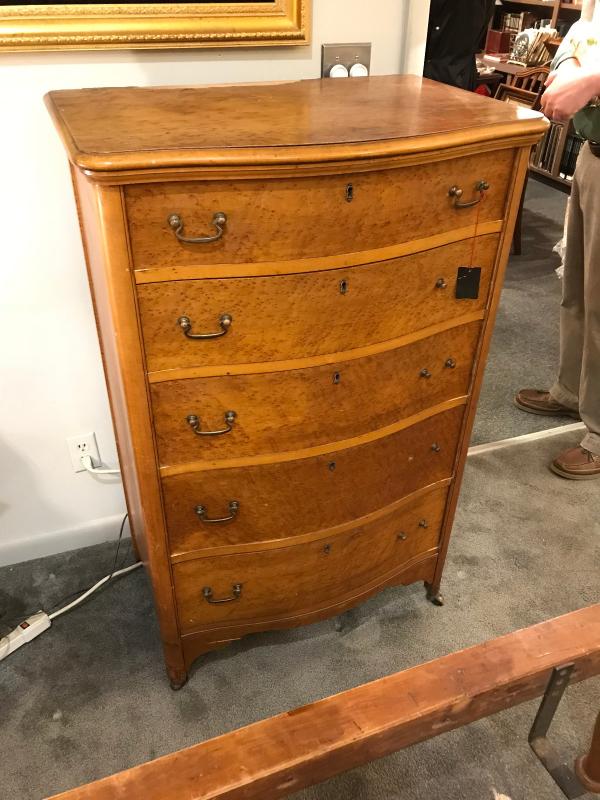Nice Victorian bird's eye maple chest of drawers. Five drawers. Serpentine front. Some veneer loss on back of top. Caster feet. 30 1/2" x 20" x 47 1/2" H