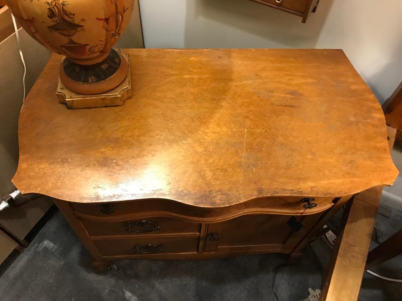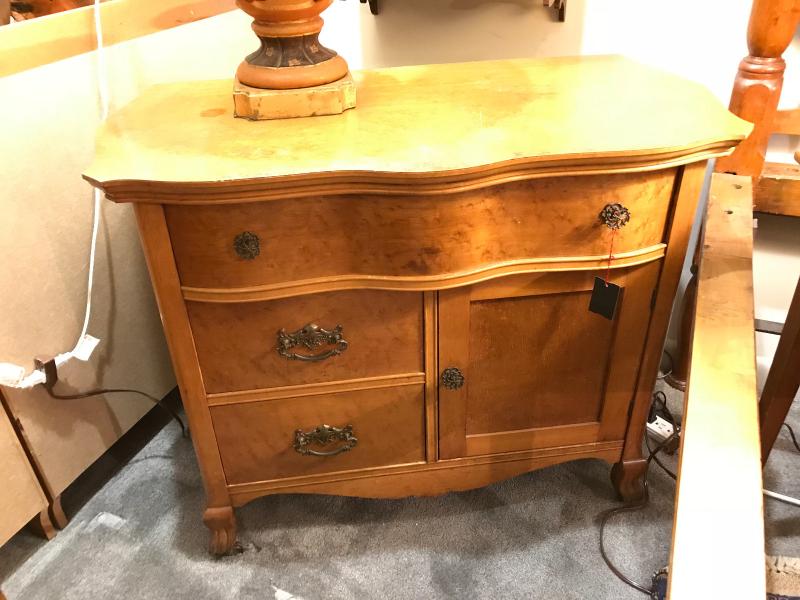 Antique Victorian bird's eye maple washstand. Has one large drawer over one door and two small drawers. Claw feet with casters. Serpentine front. Some minor veneer loss to top. In nice condition. 34" x 20" x 19 1/2"H