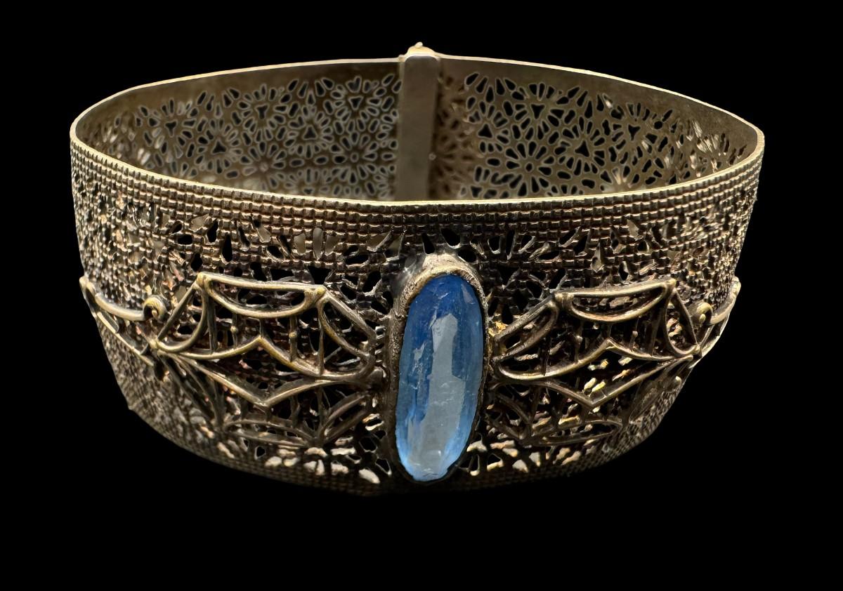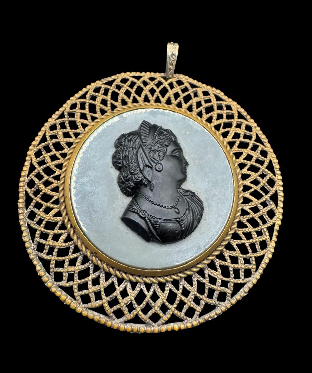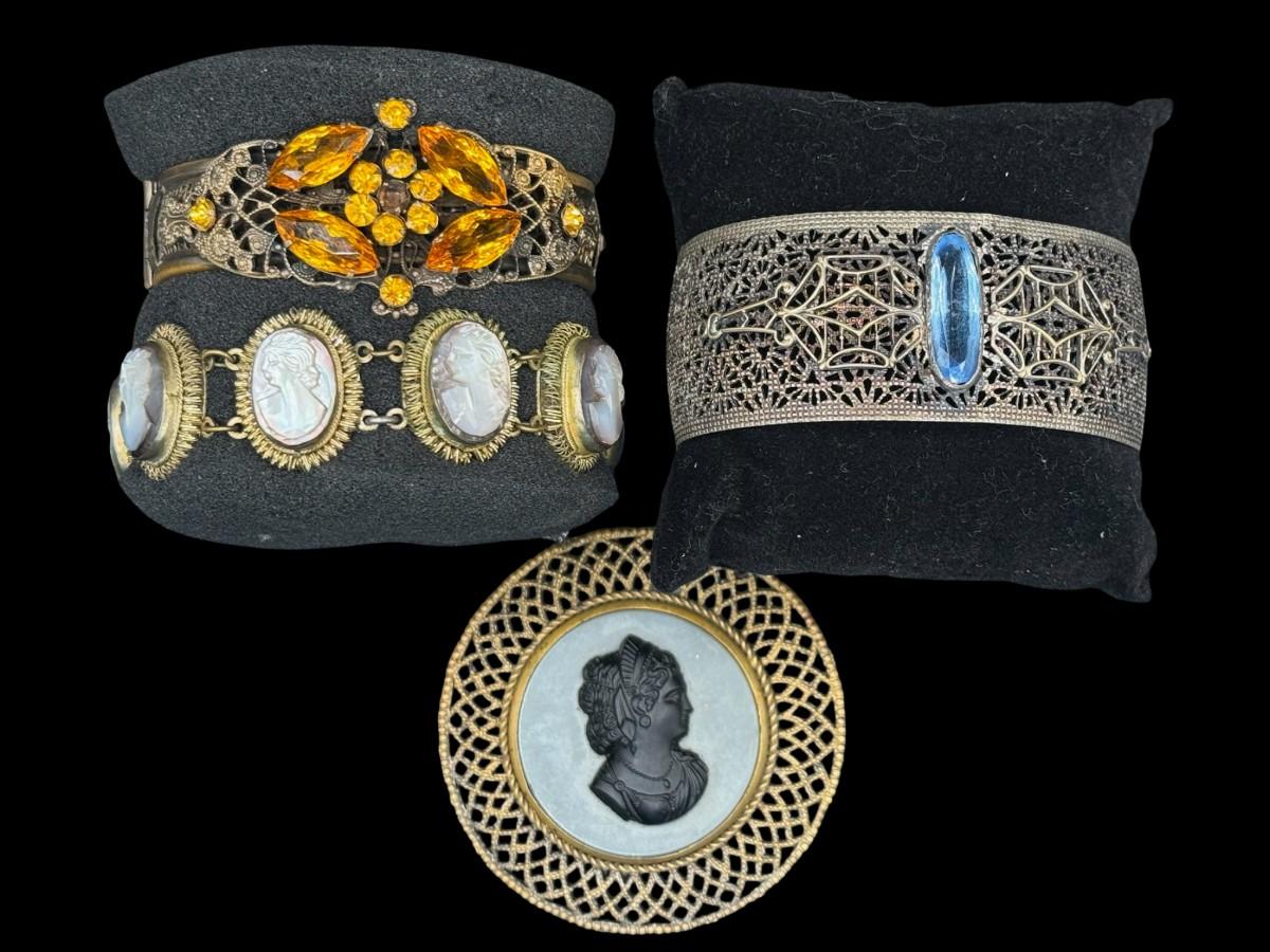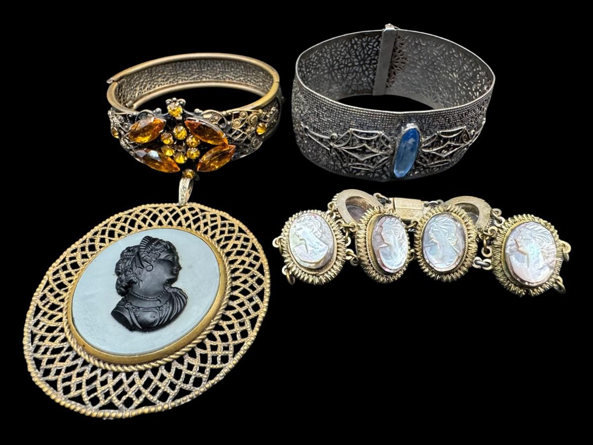 Includes two bracelets with ornate filigree and semi-precious stones; a cameo pendant, and a carved nacre cameo bracelet. Total of four pieces. [JP]