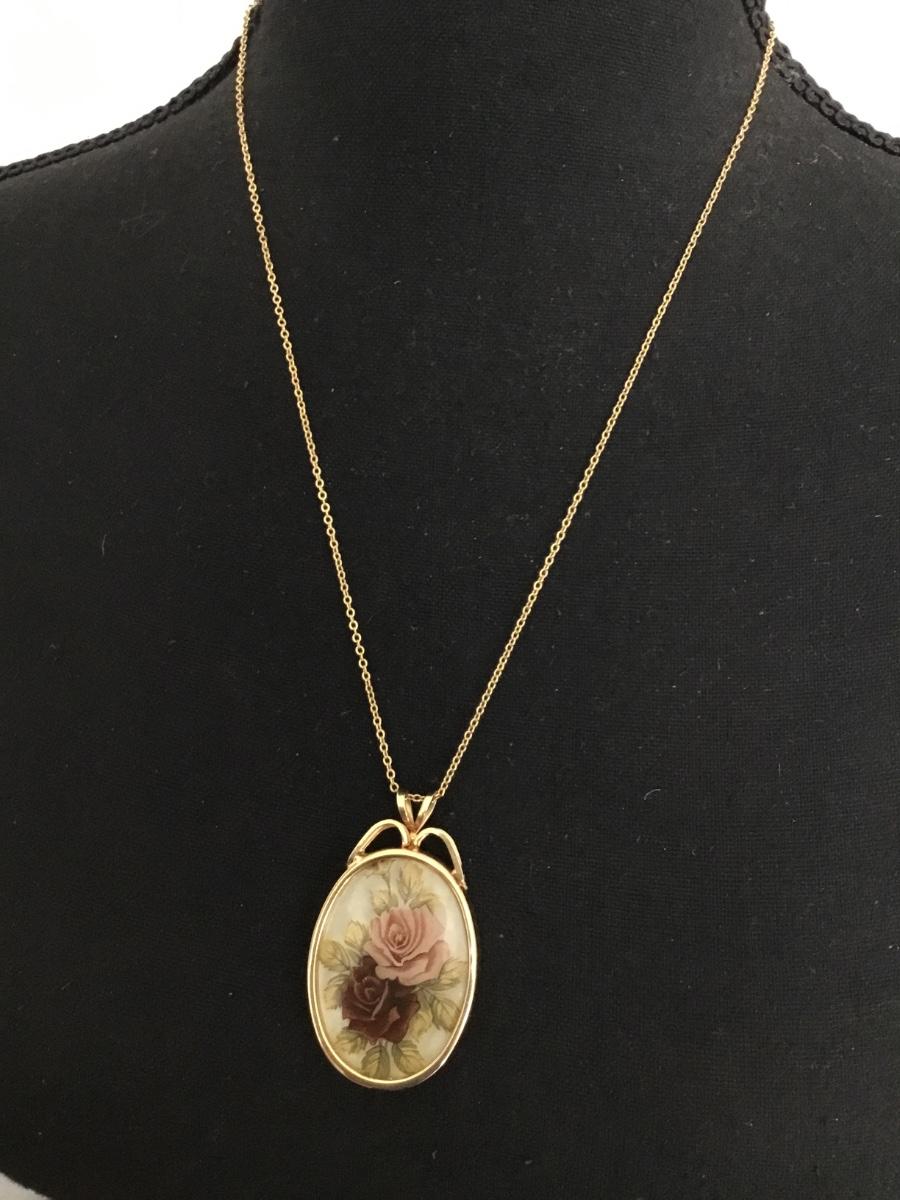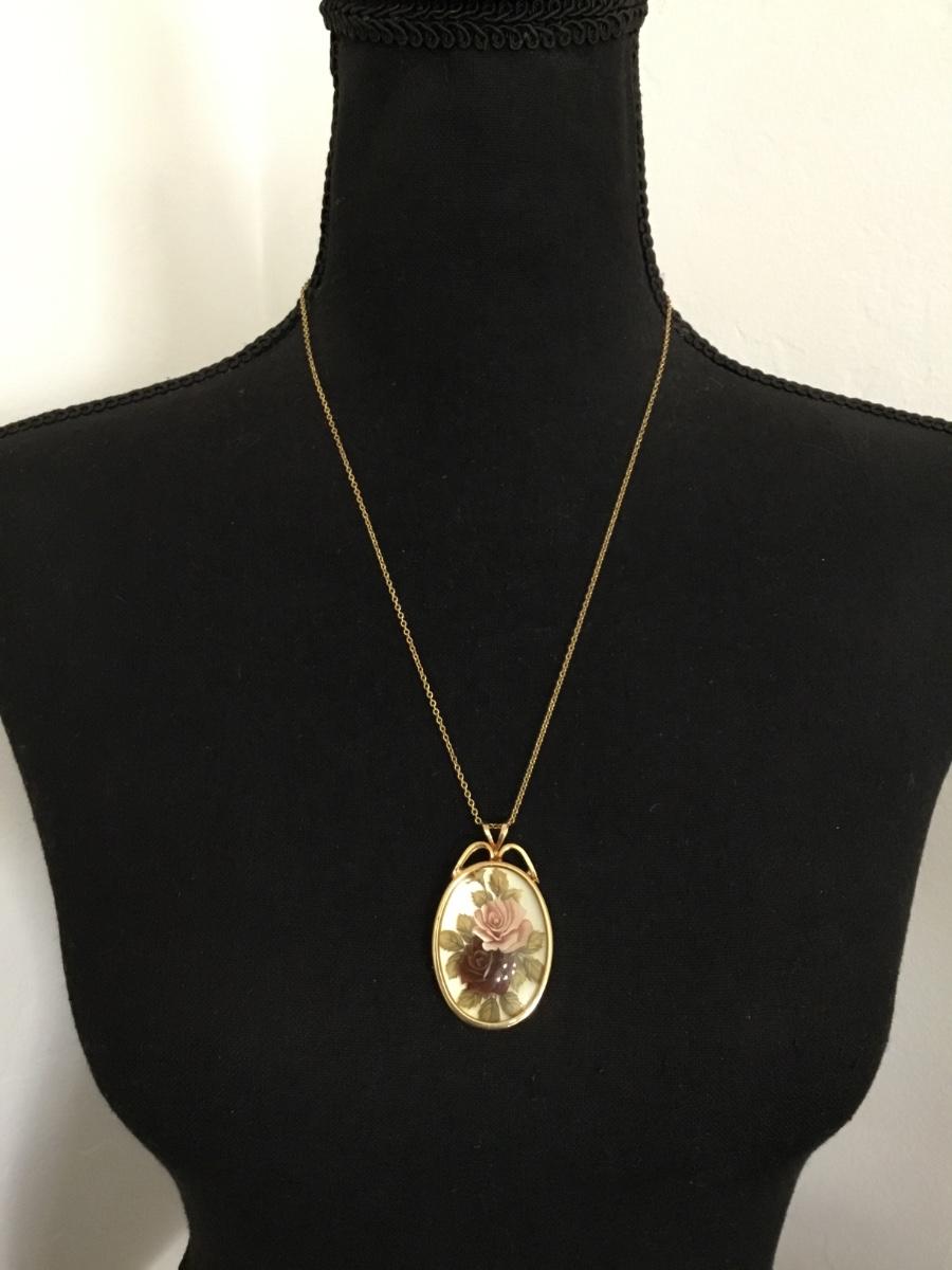 Victorian, cameo style, necklace, rose print, pendant, gold tone