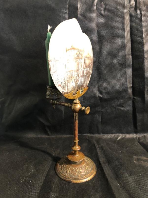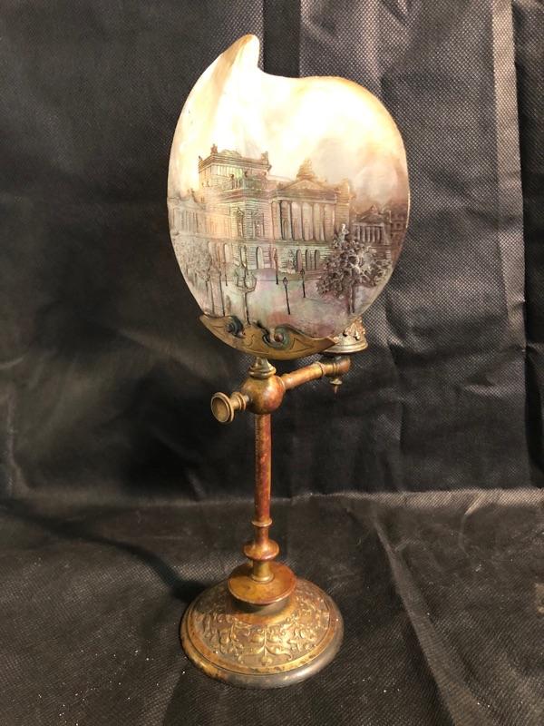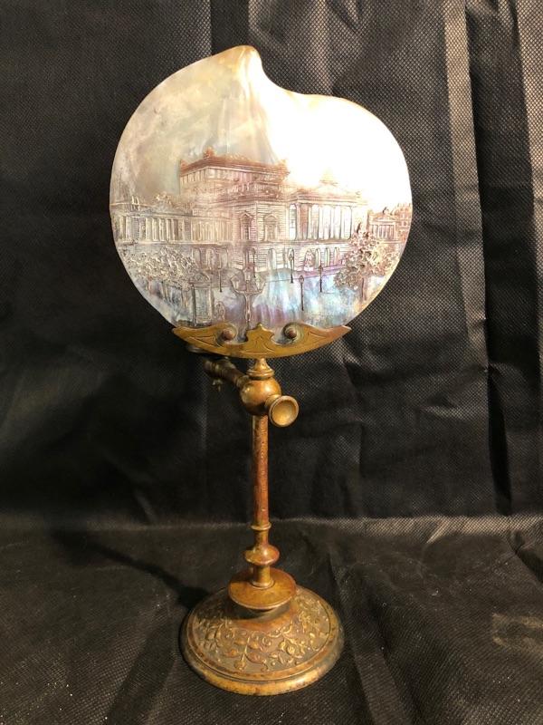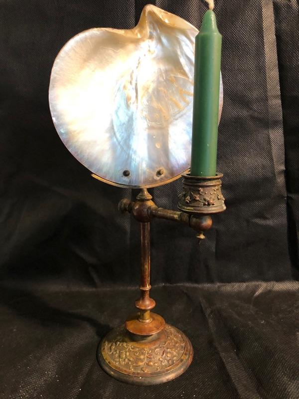 Victorian Carved Abilone shell scene on a decorative brass candlestick