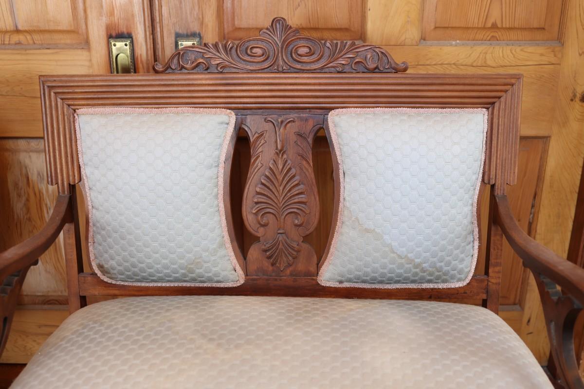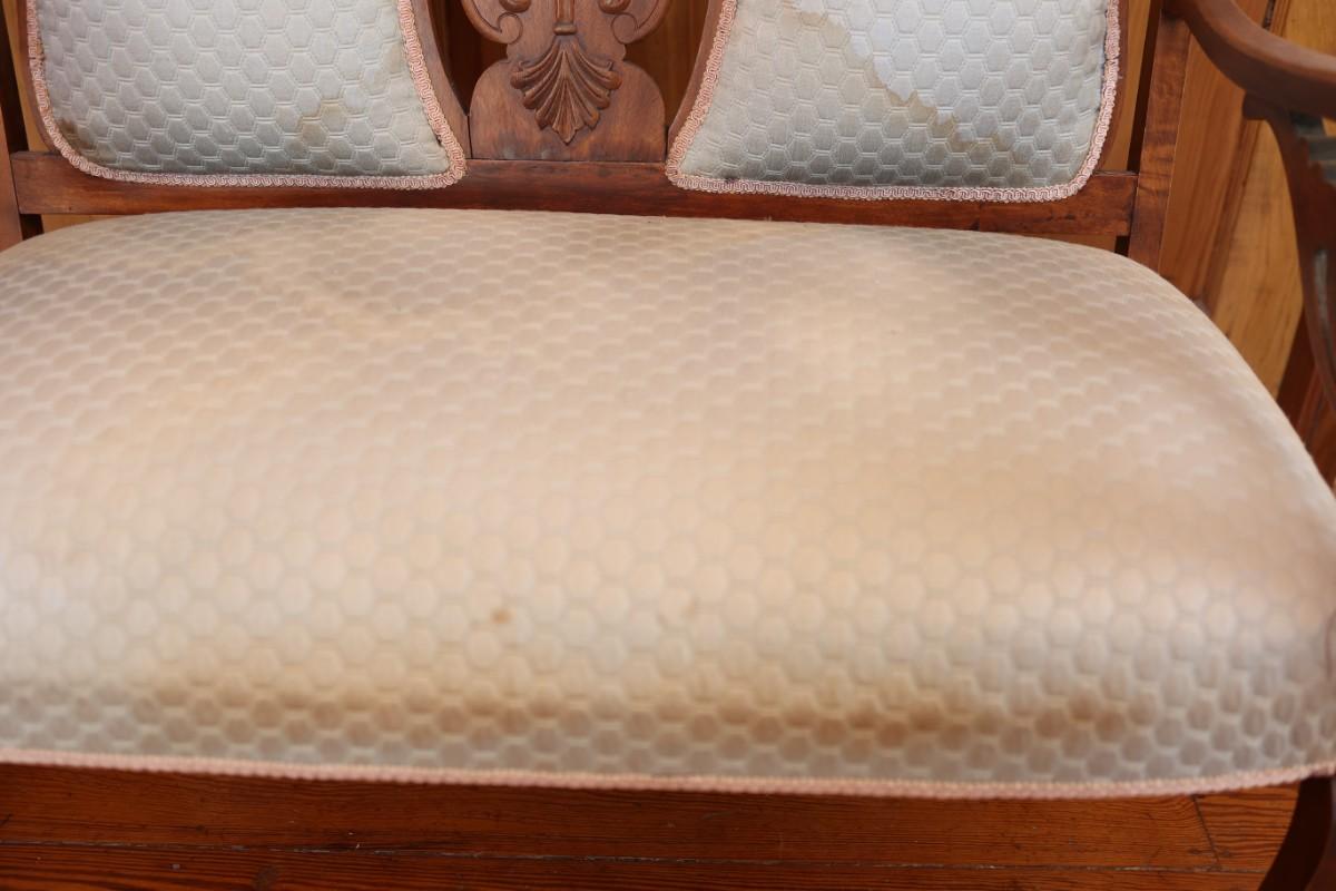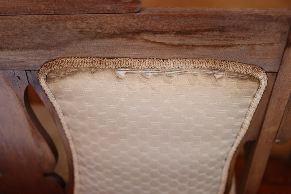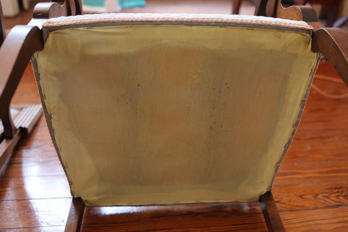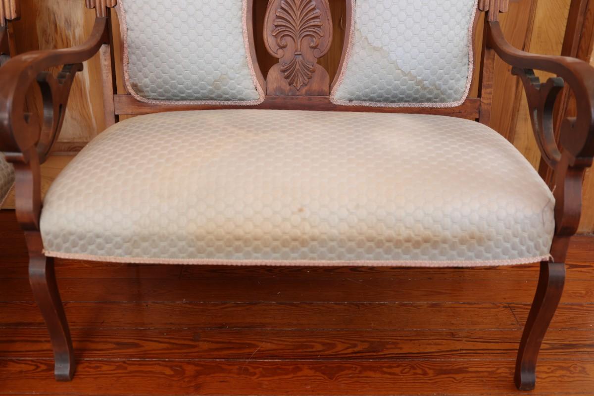 The wood is in beautiful condition. The upholstery has wear, see photos for condition.