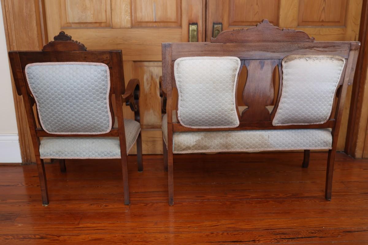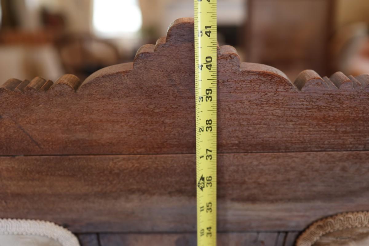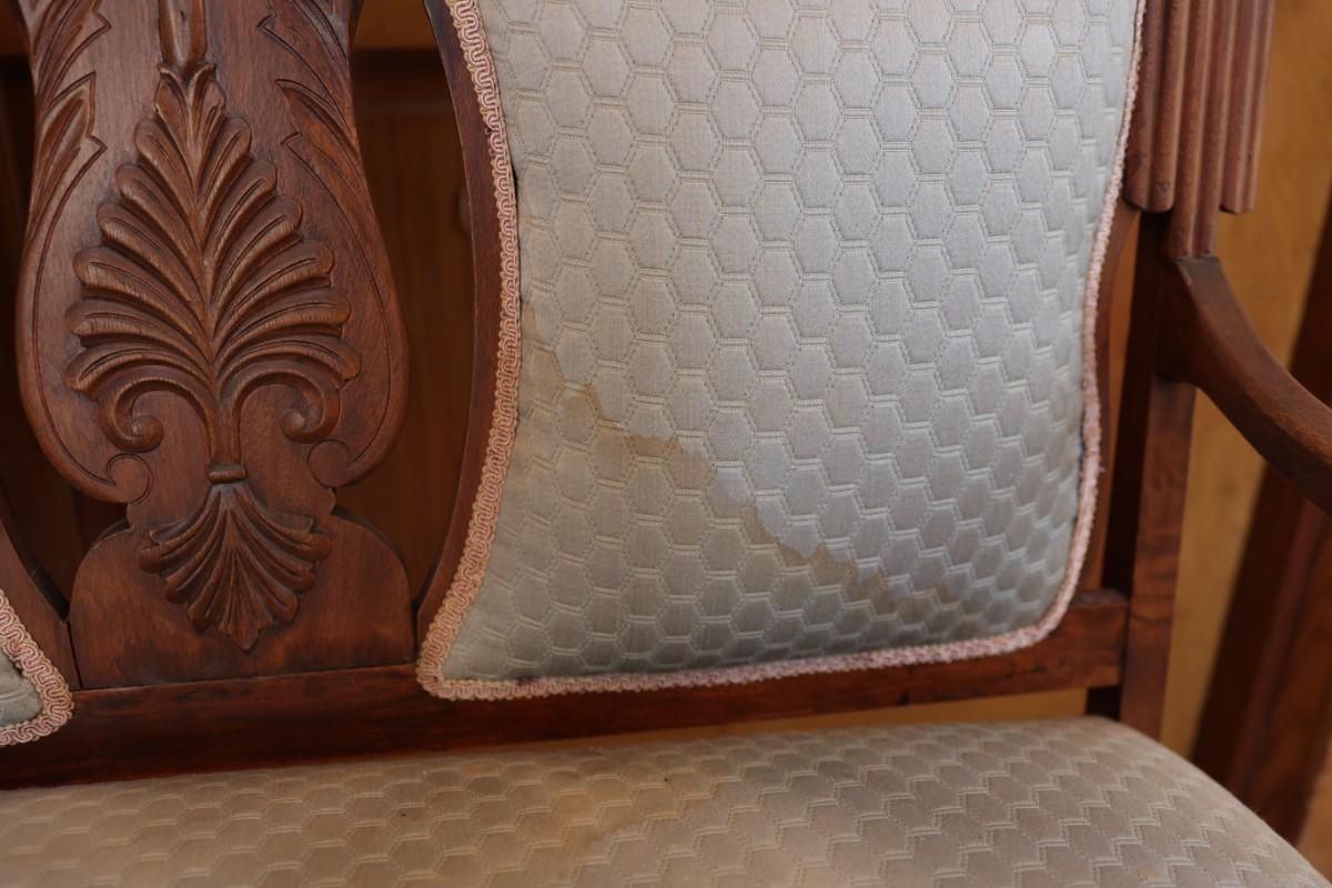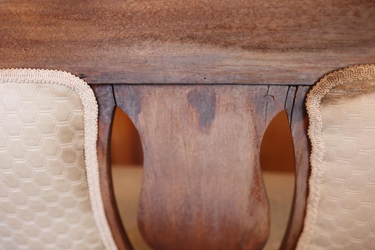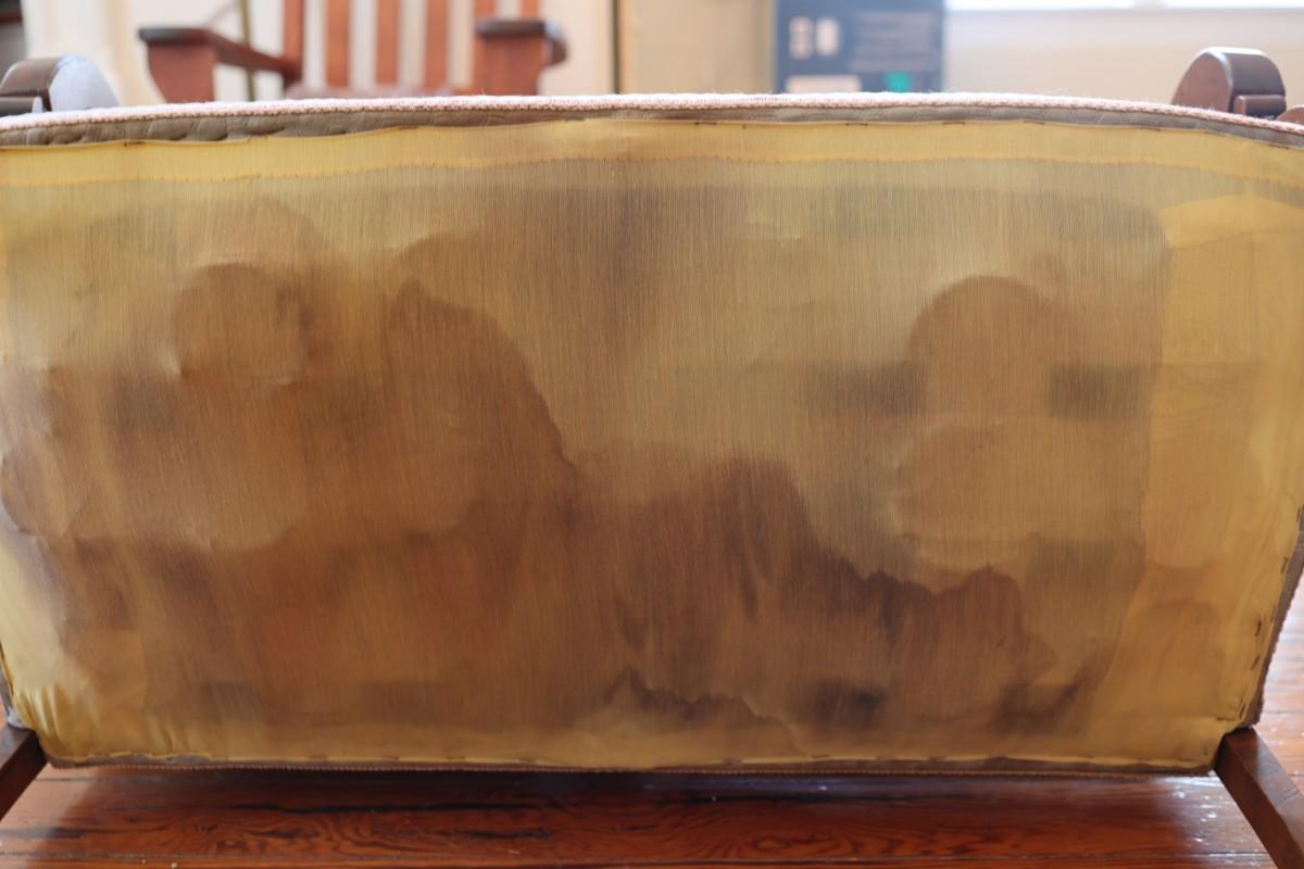 The wood is in beautiful condition. The upholstery has wear, see photos for condition.