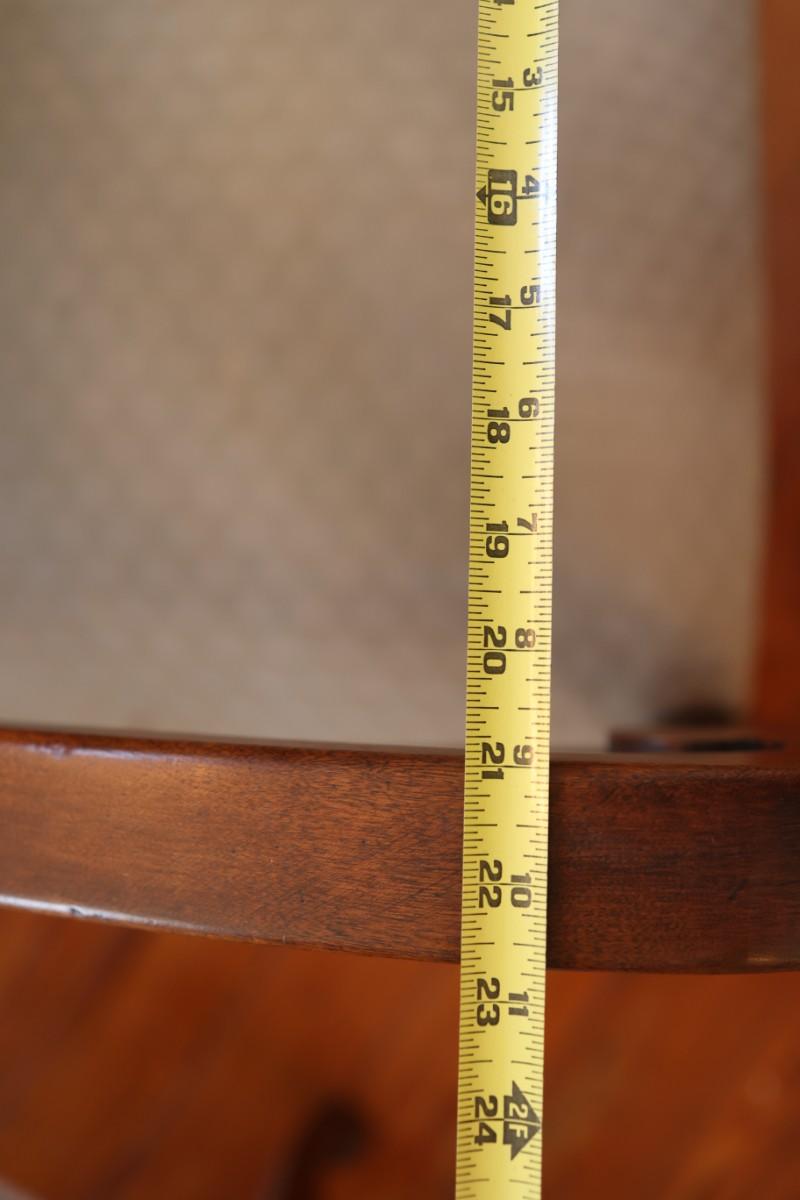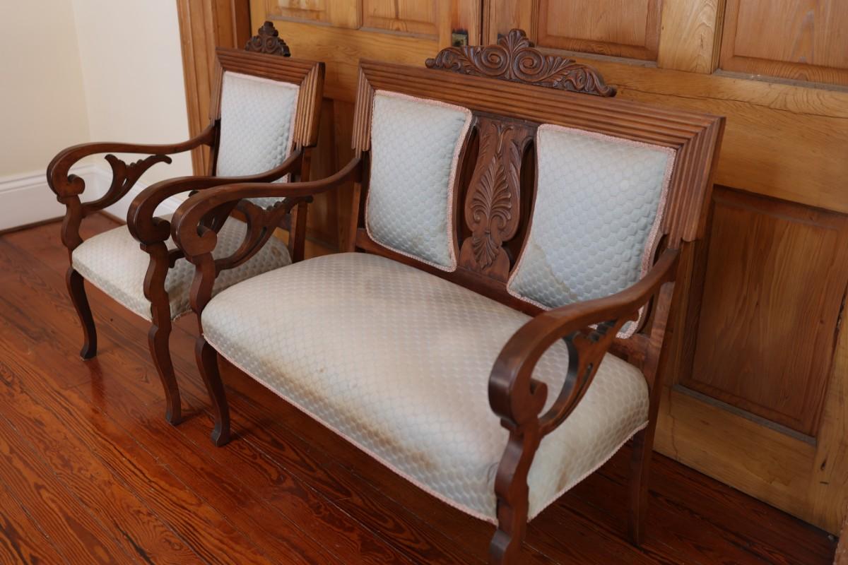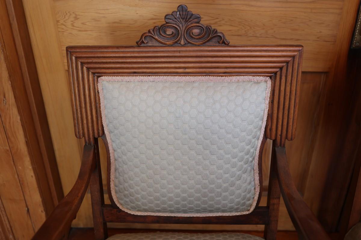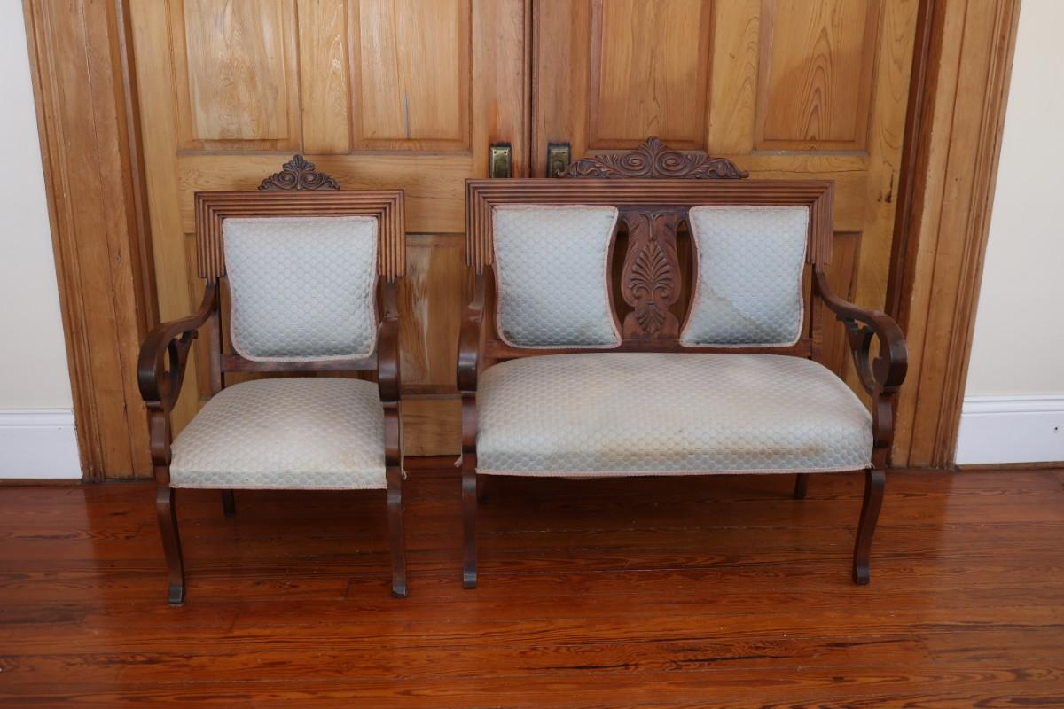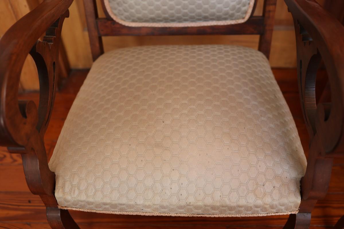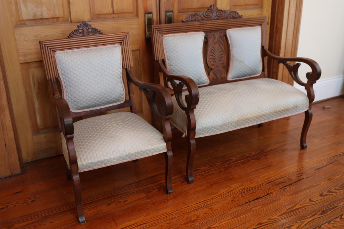The wood is in beautiful condition. The upholstery has wear, see photos for condition.