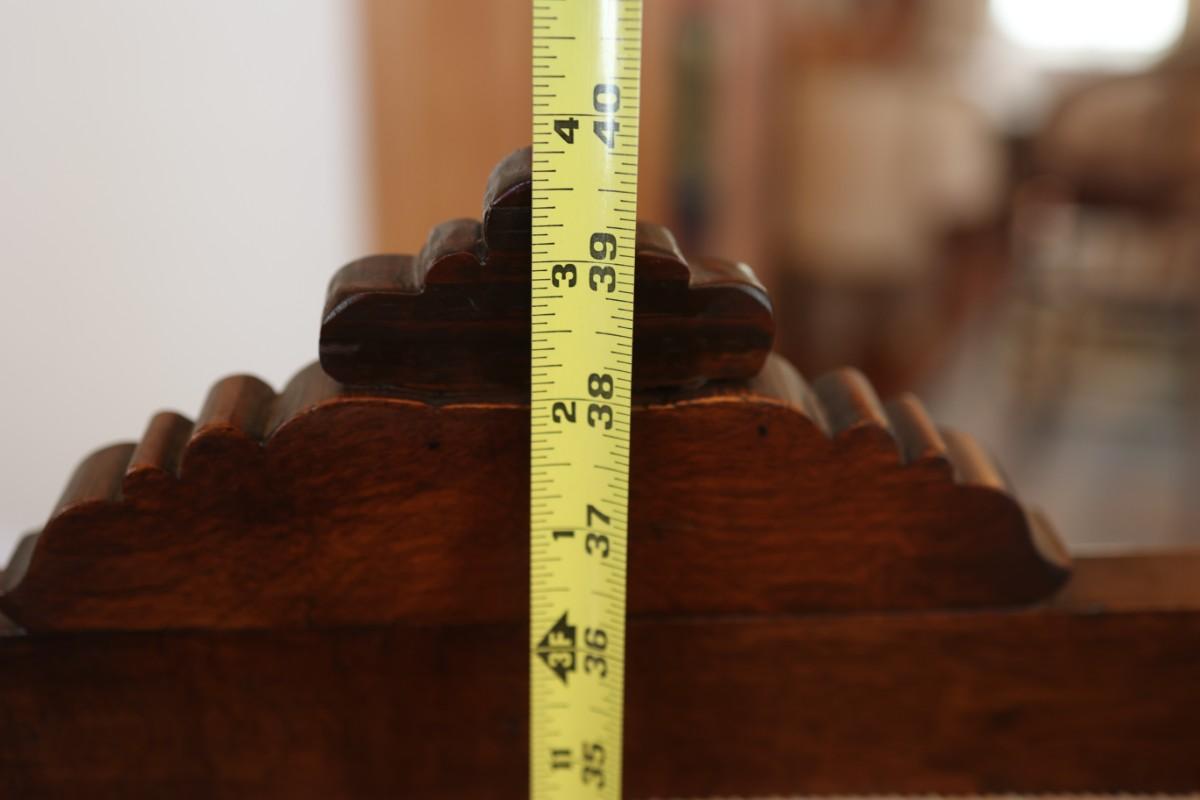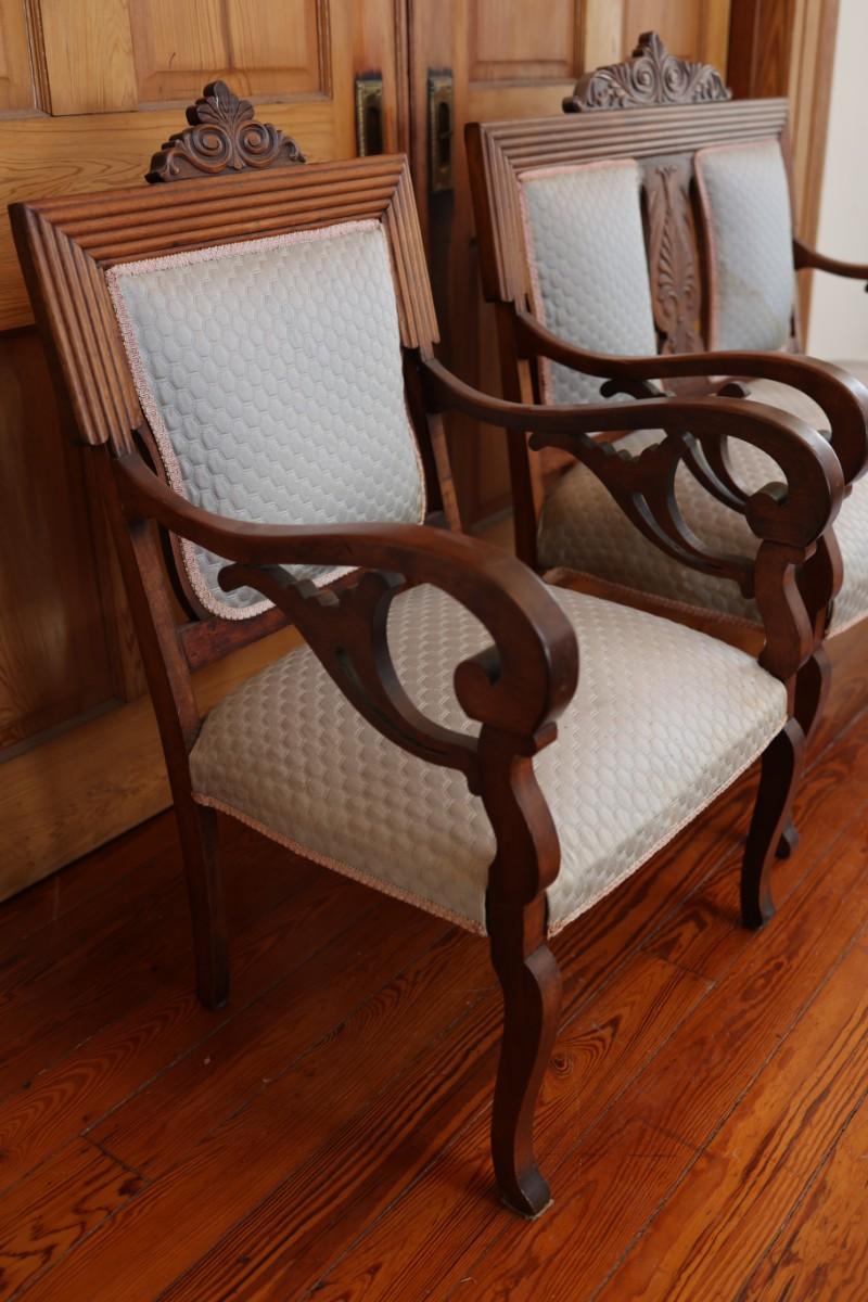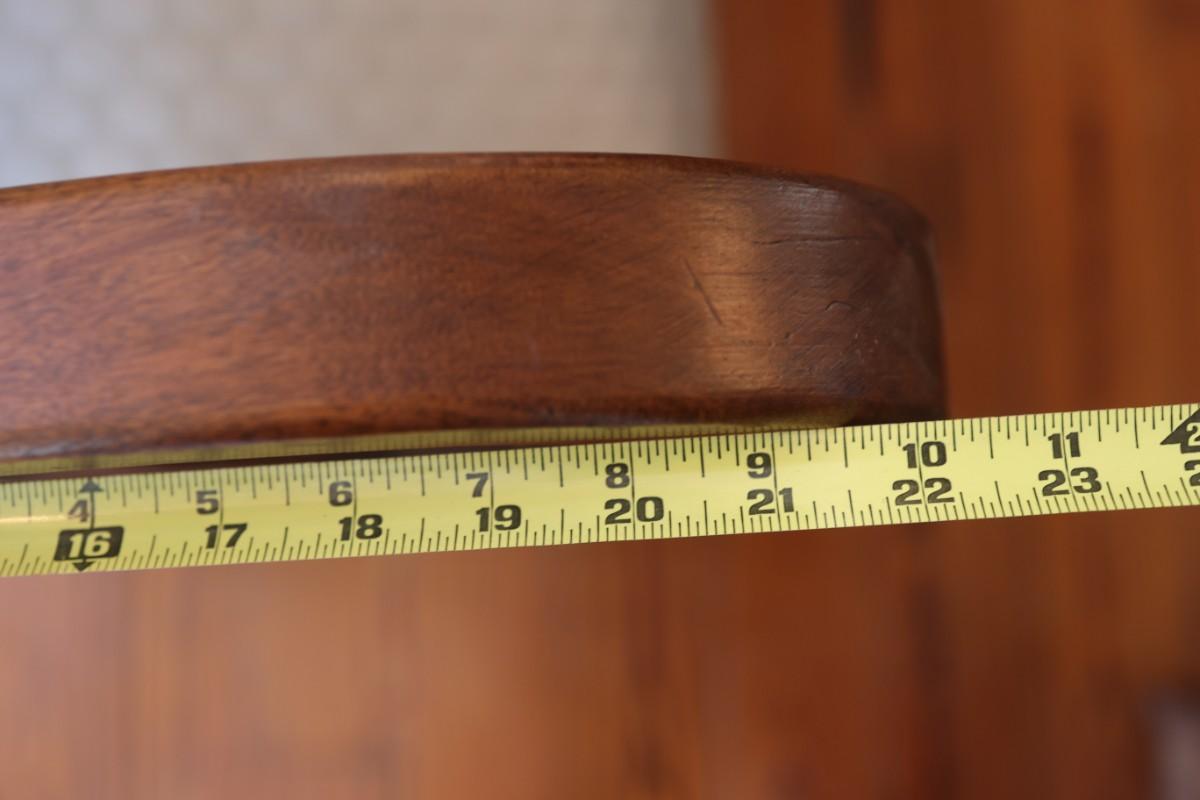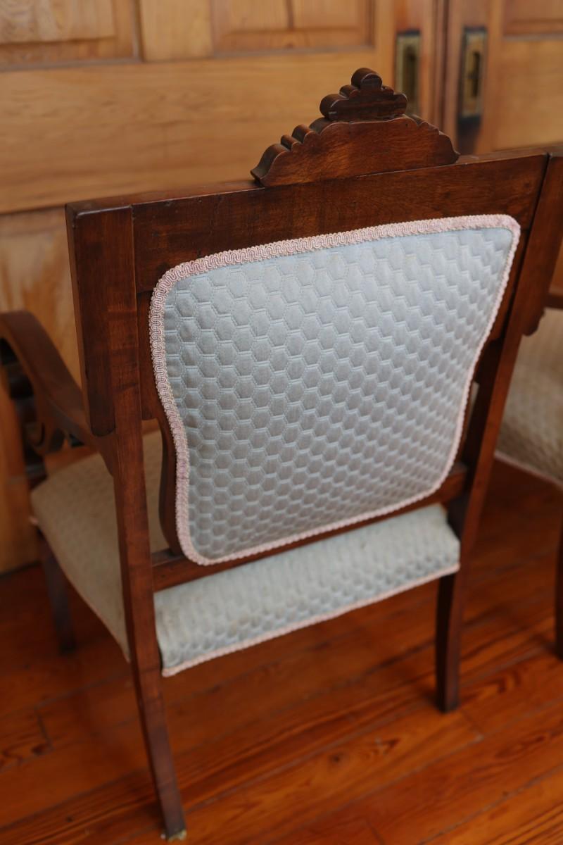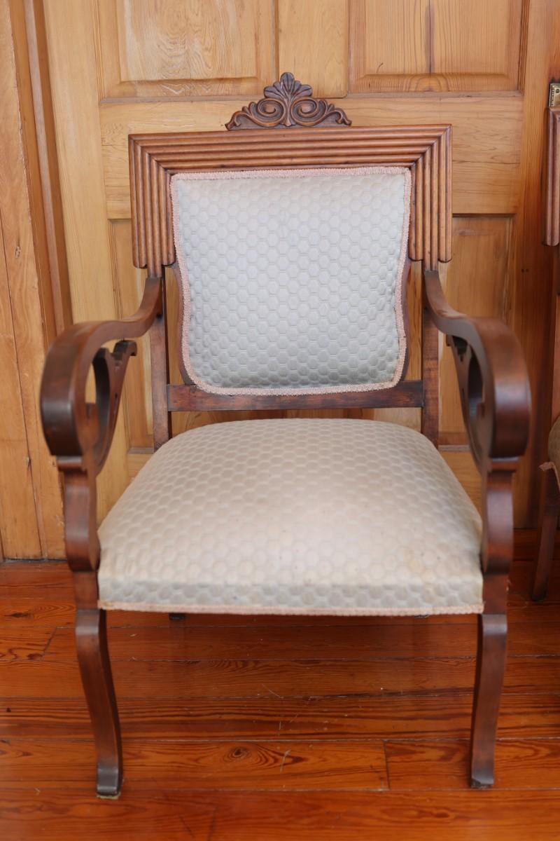 The wood is in beautiful condition. The upholstery has wear, see photos for condition.