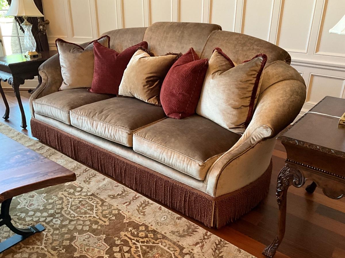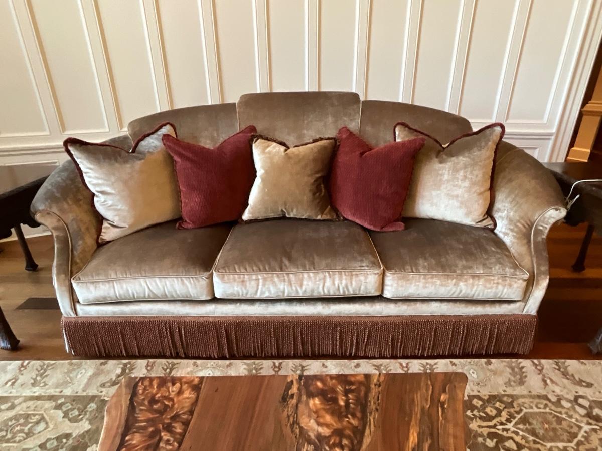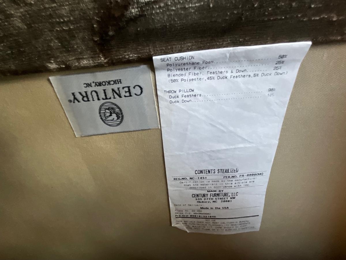 Century furniture sofa is 108 inches wide 46 inches deep 47 inches tall. See depth without decorative pillows is 34 inches with decorative 19 inches. 4 inches and it’s 20 inches from the floor to the seat. Sofa is located in the grand room maybe sat on twice.