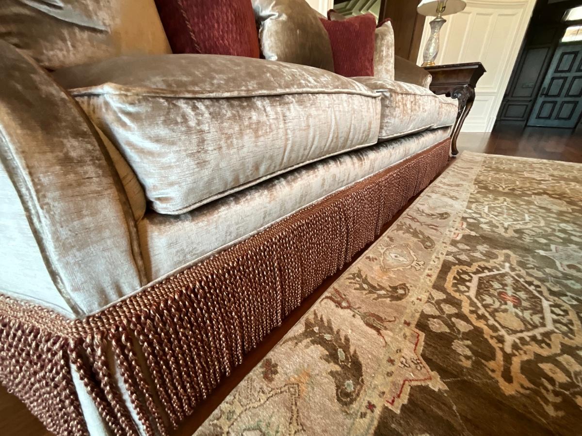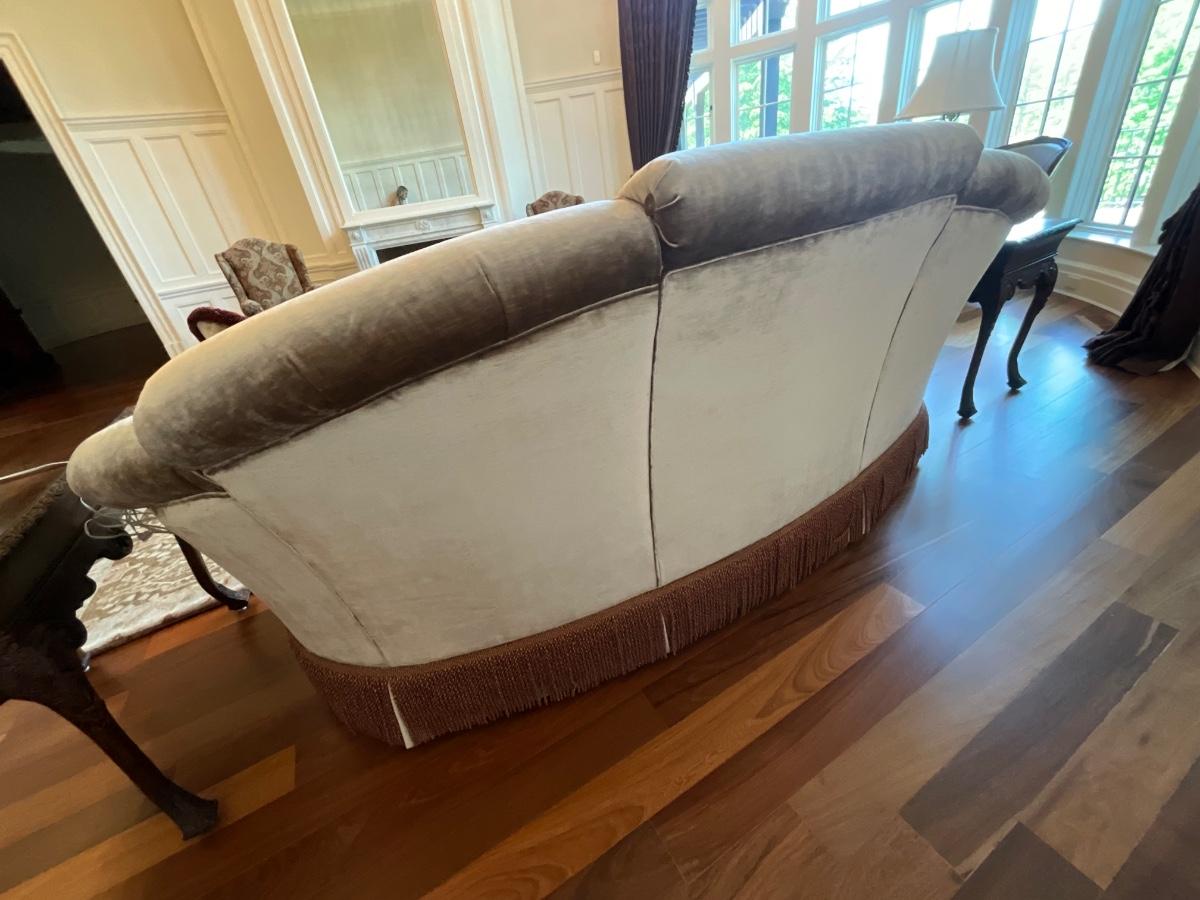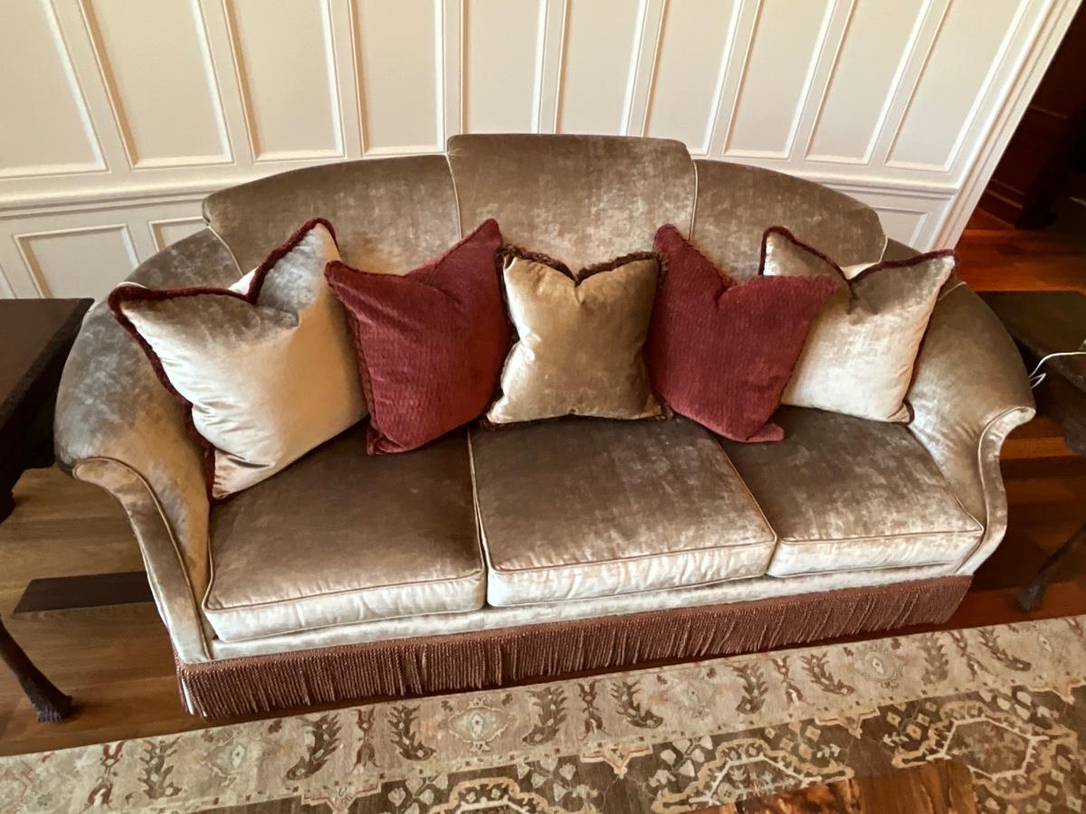 Century furniture sofa is 108 inches wide 46 inches deep 47 inches tall. See depth without decorative pillows is 34 inches with decorative 19 inches. 4 inches and it’s 20 inches from the floor to the seat. Sofa is located in the grand room maybe sat on twice.