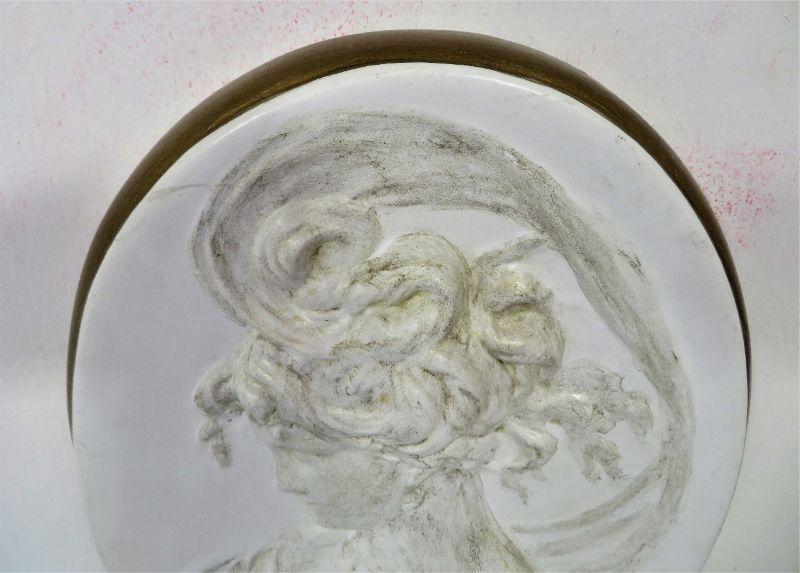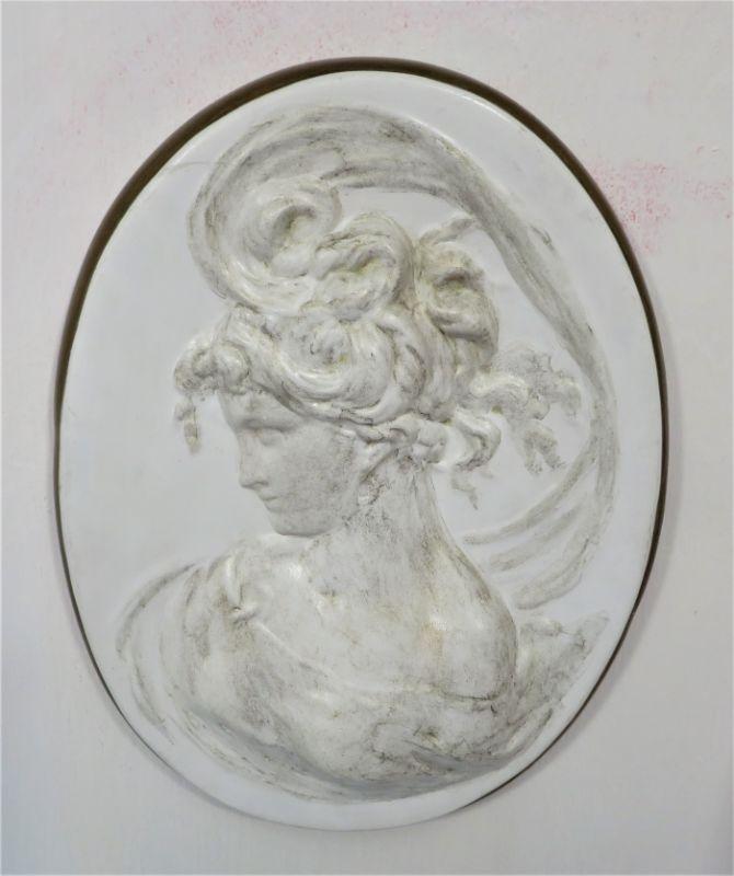 VINTAGE Victorian Ceramic Lady Oval with Painted Gold Rim Glazed Wall Hanging. Measures 14.5" x 11" x 2" wide