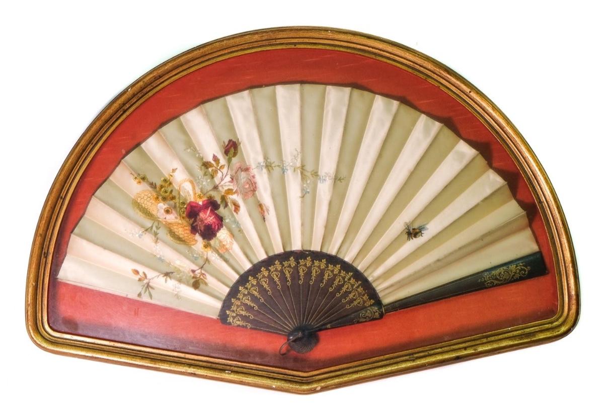 Likely French. Wooden handle w/ gilt detail. Silk fan panel with embroidered bee, flowers & basket. Set within a glass framed shadow box. Measures approx. 17" H, 26" W, 2" D.