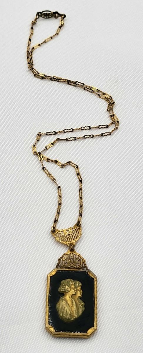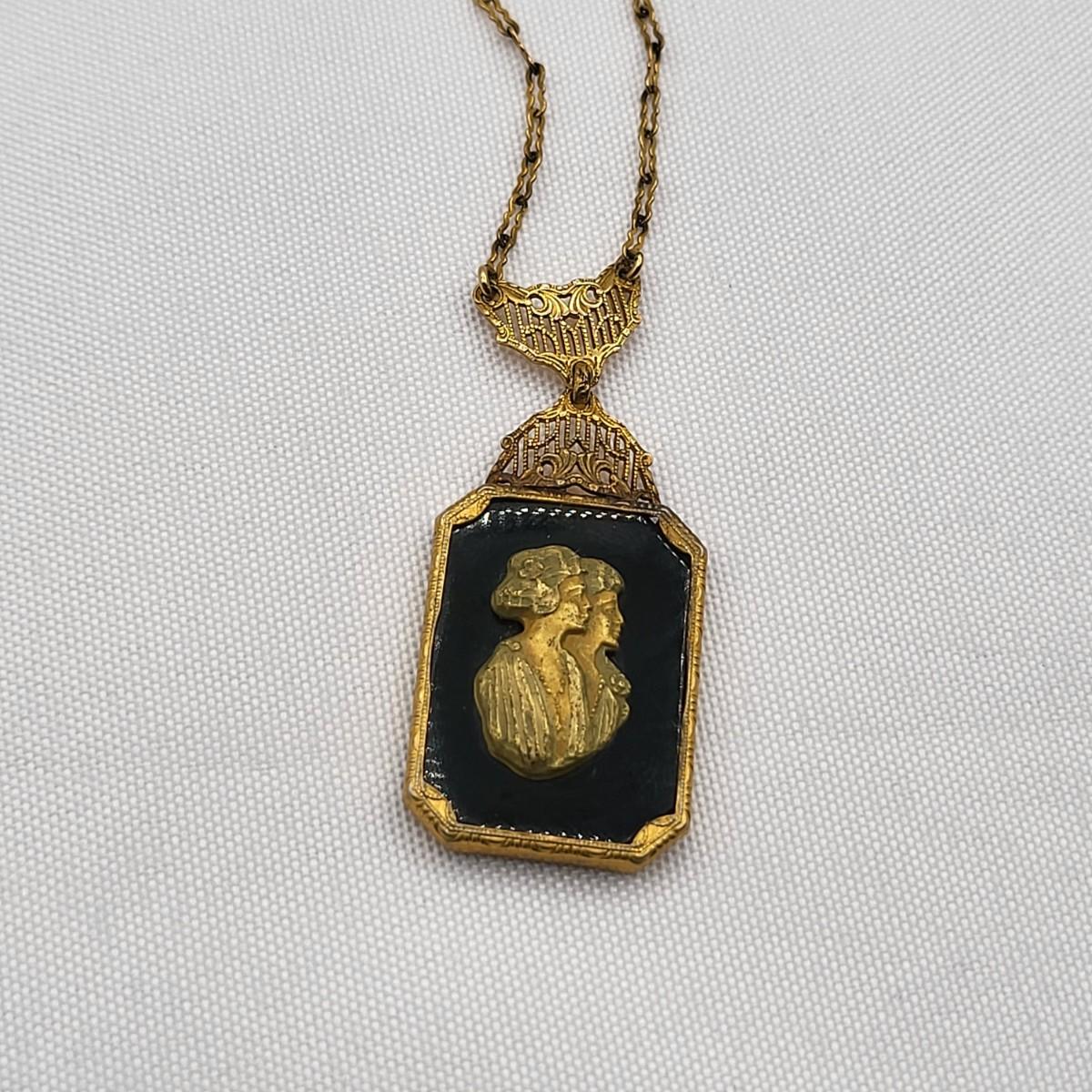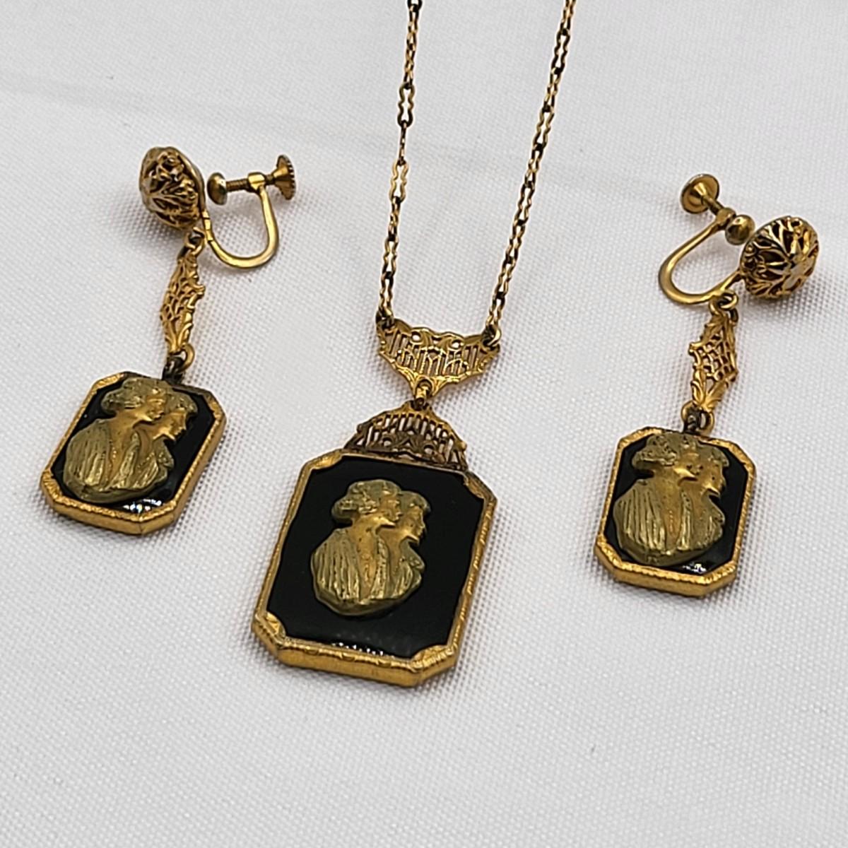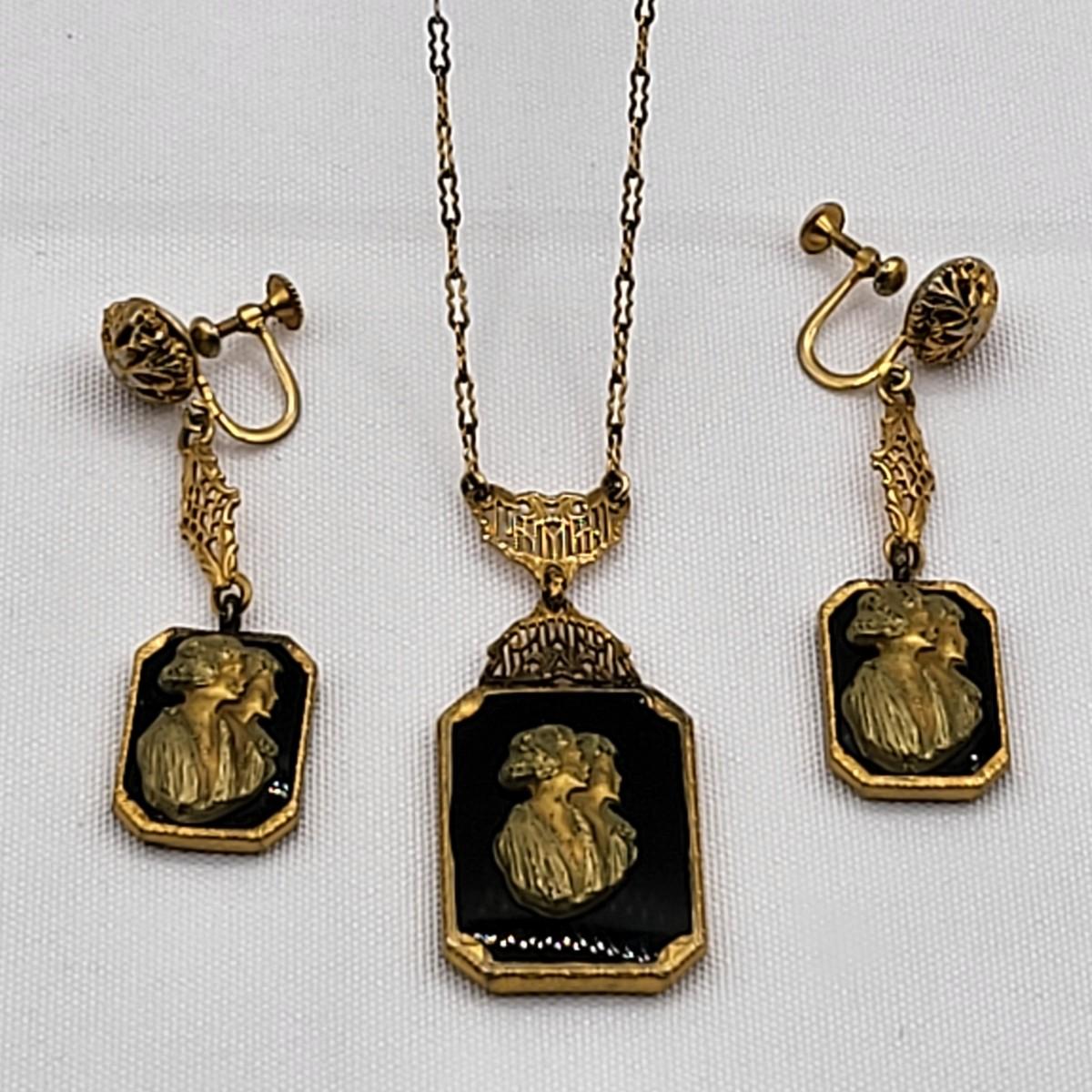 Antique, ornate double right facing cameo women, gold tone setting on black onyx. Screw back earrings. Petite chain 15" long with pendant 1.75" long. Matching earrings are 2" long.