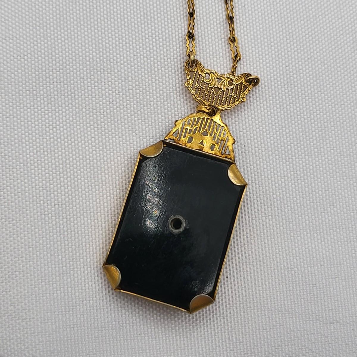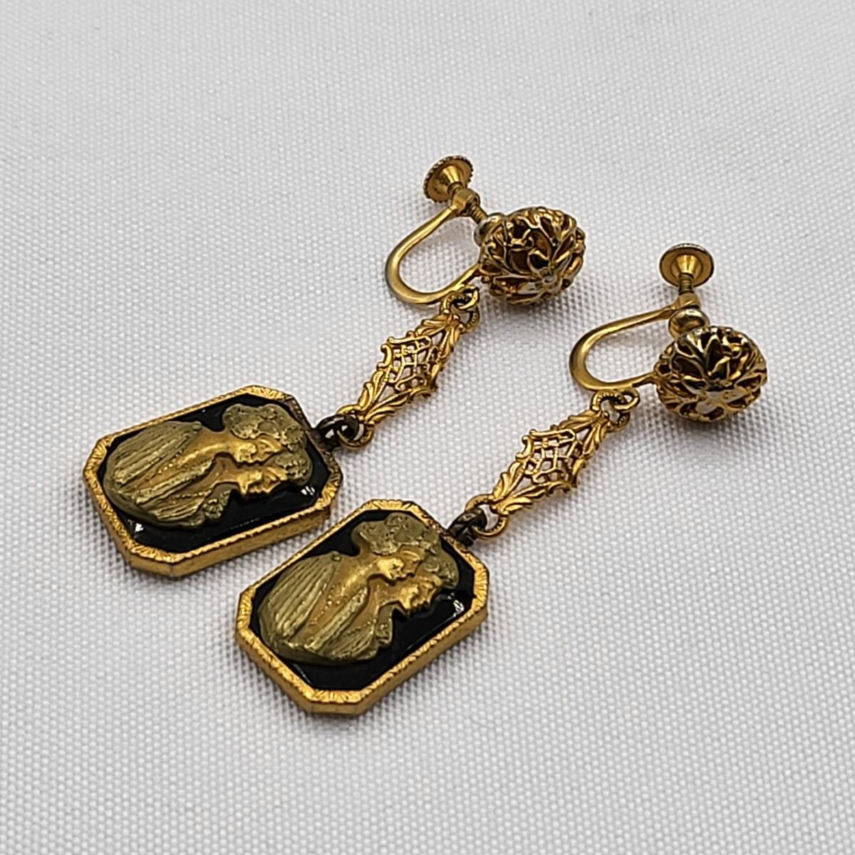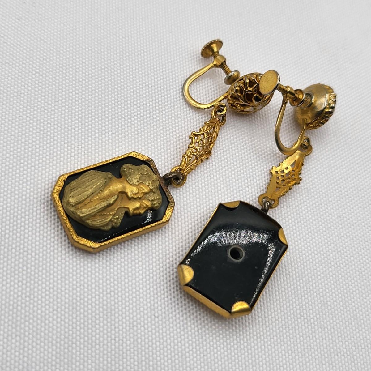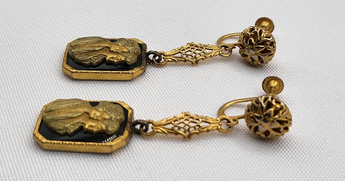 Antique, ornate double right facing cameo women, gold tone setting on black onyx. Screw back earrings. Petite chain 15" long with pendant 1.75" long. Matching earrings are 2" long.
