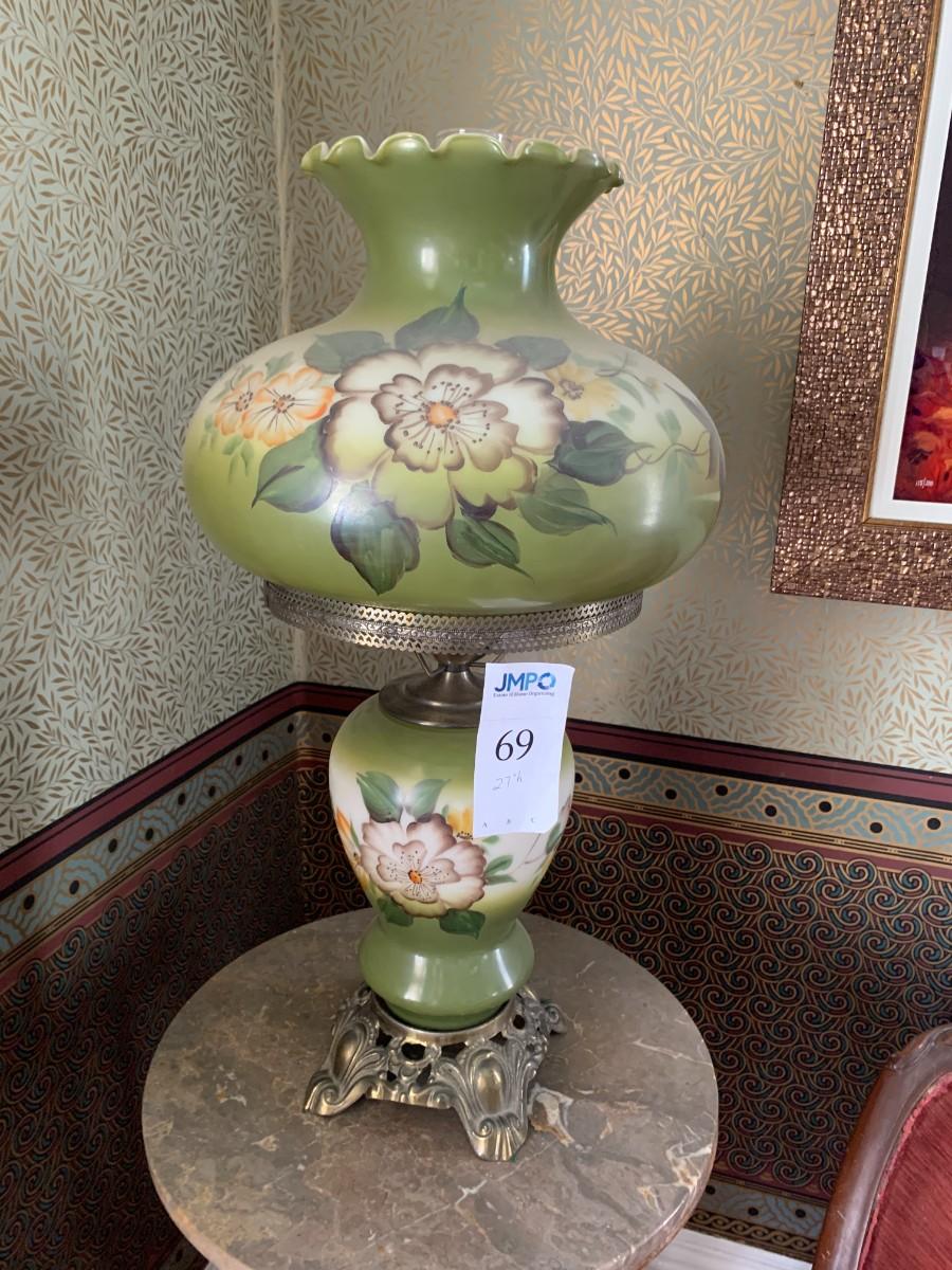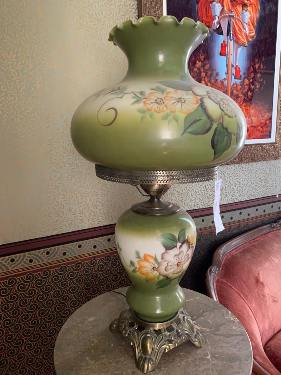 Green Floral Hurrican Electric Table Lamp with Brass Base
