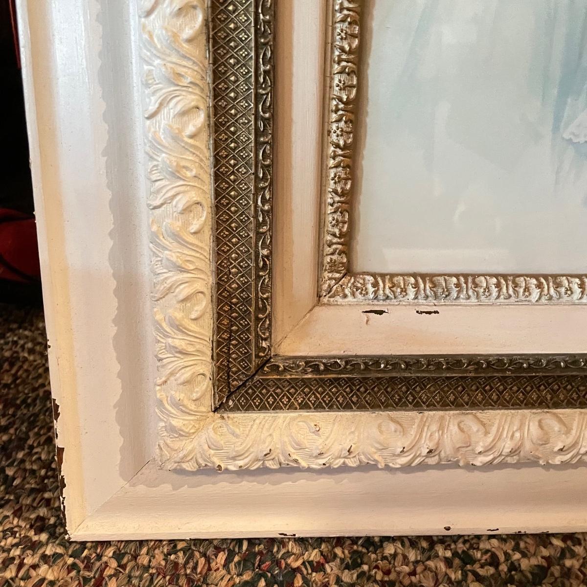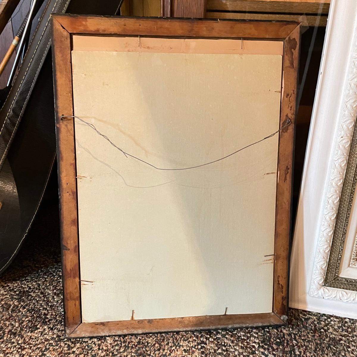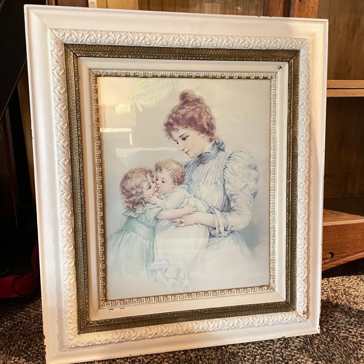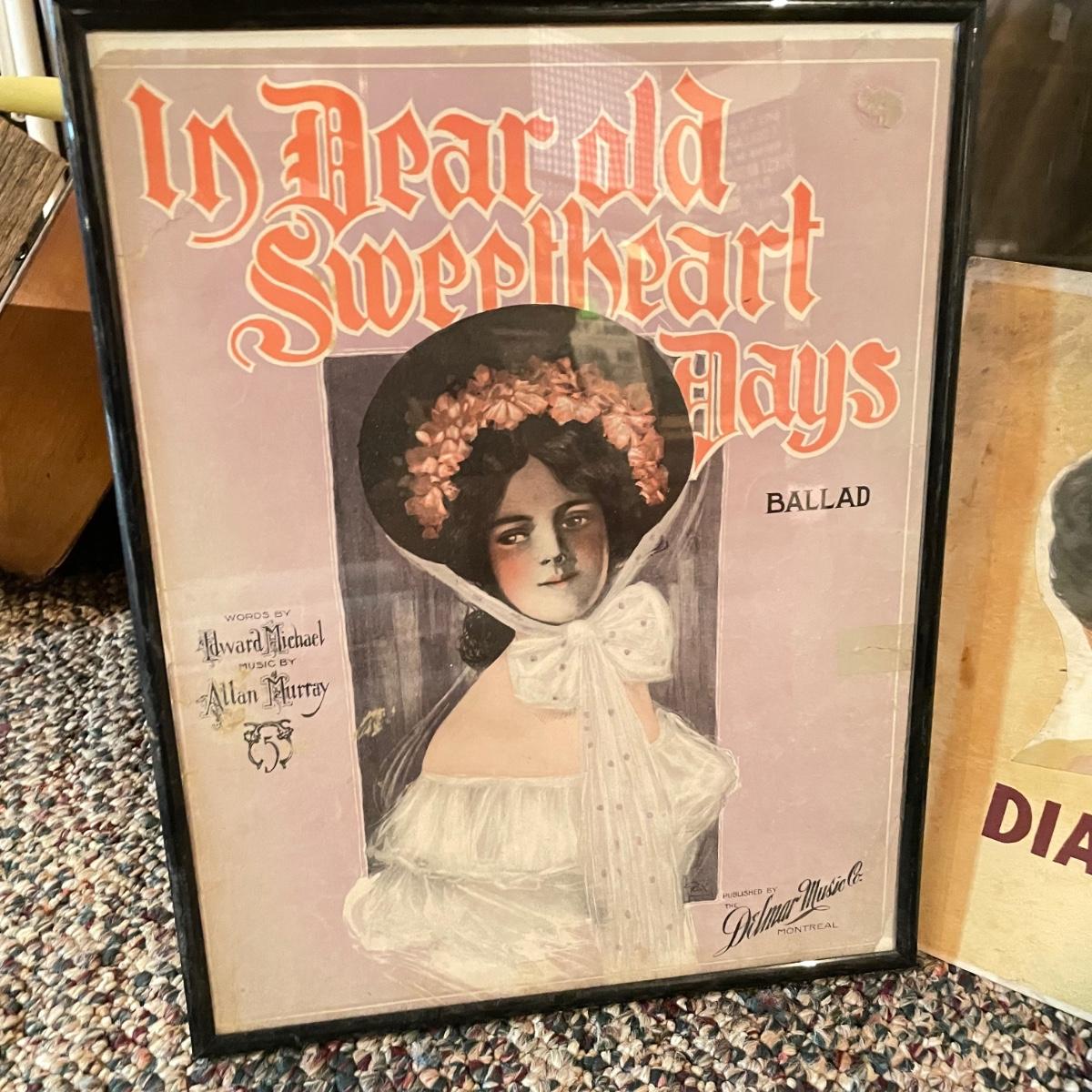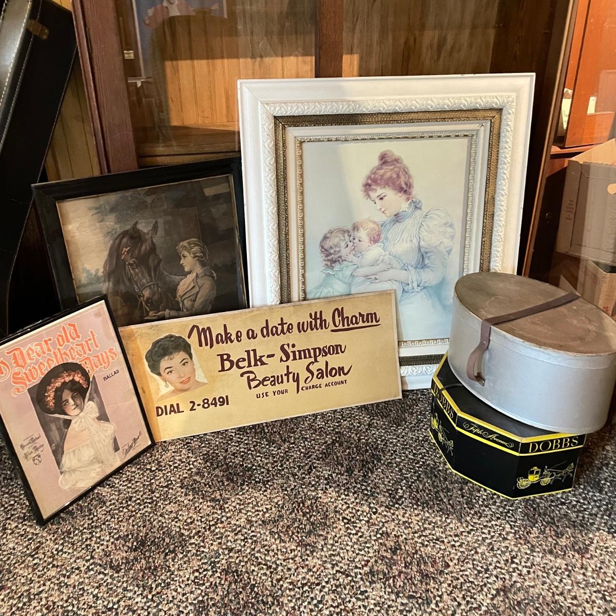 Victorian era art with newer advertisements for Belk-Simpson and In Dear Old Sweetheart Days. Lot also includes two vintage hat boxes. The largest gold and white wooden frame measures 26” x 30” and the smallest Ballad sits behind glass in a black plastic frame measuring 11.25” x 14.5”. The Stetson hat box is 15.5” x 10” x 7”. See images. Local pick up only.