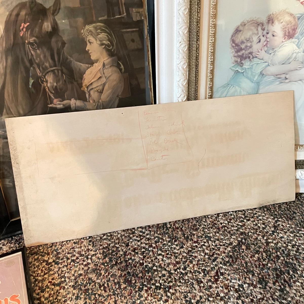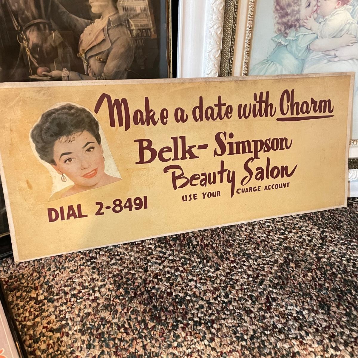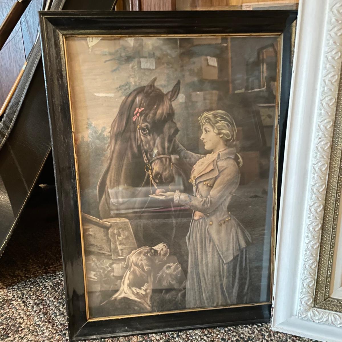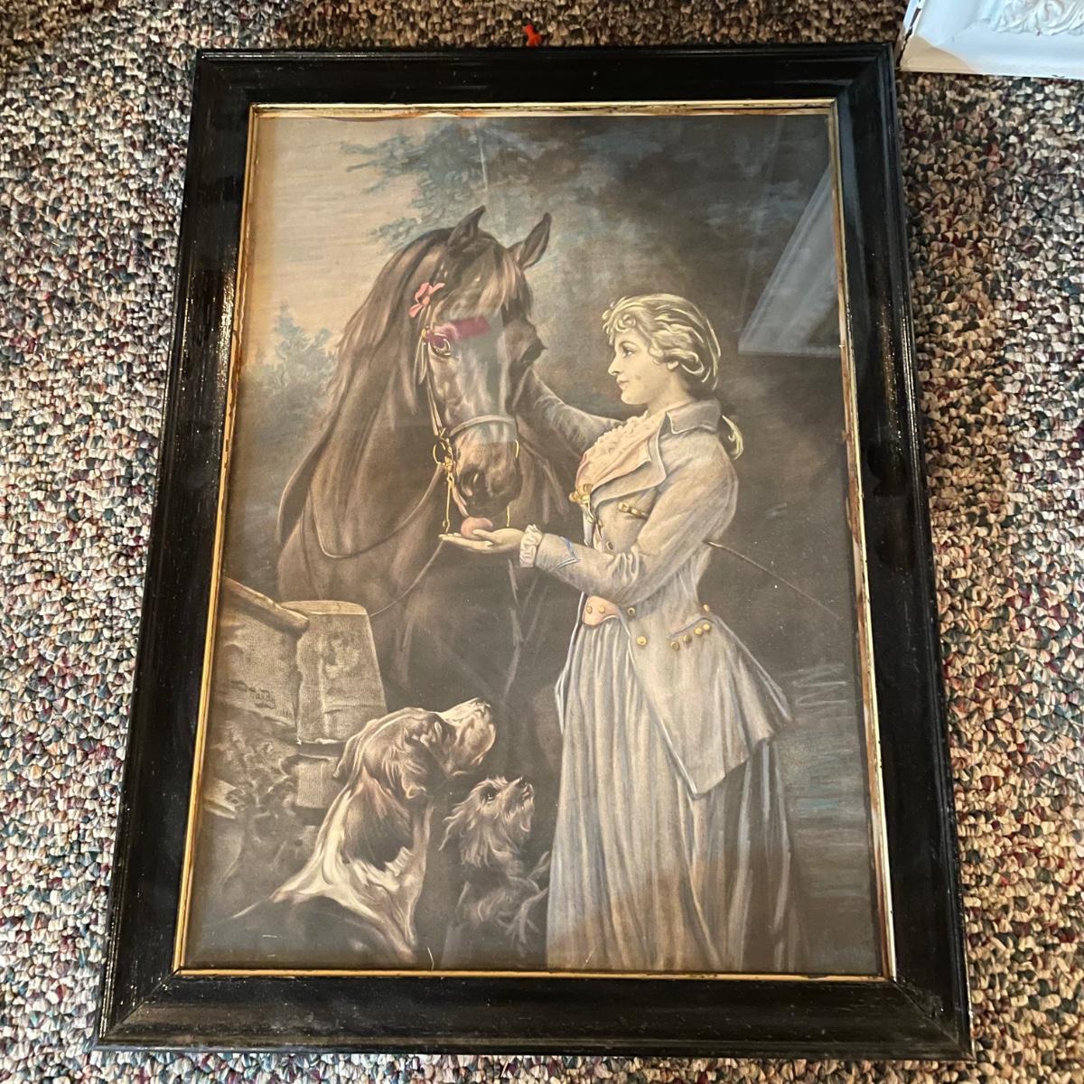 Victorian era art with newer advertisements for Belk-Simpson and In Dear Old Sweetheart Days. Lot also includes two vintage hat boxes. The largest gold and white wooden frame measures 26” x 30” and the smallest Ballad sits behind glass in a black plastic frame measuring 11.25” x 14.5”. The Stetson hat box is 15.5” x 10” x 7”. See images. Local pick up only.
