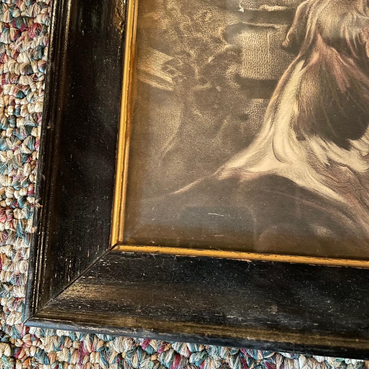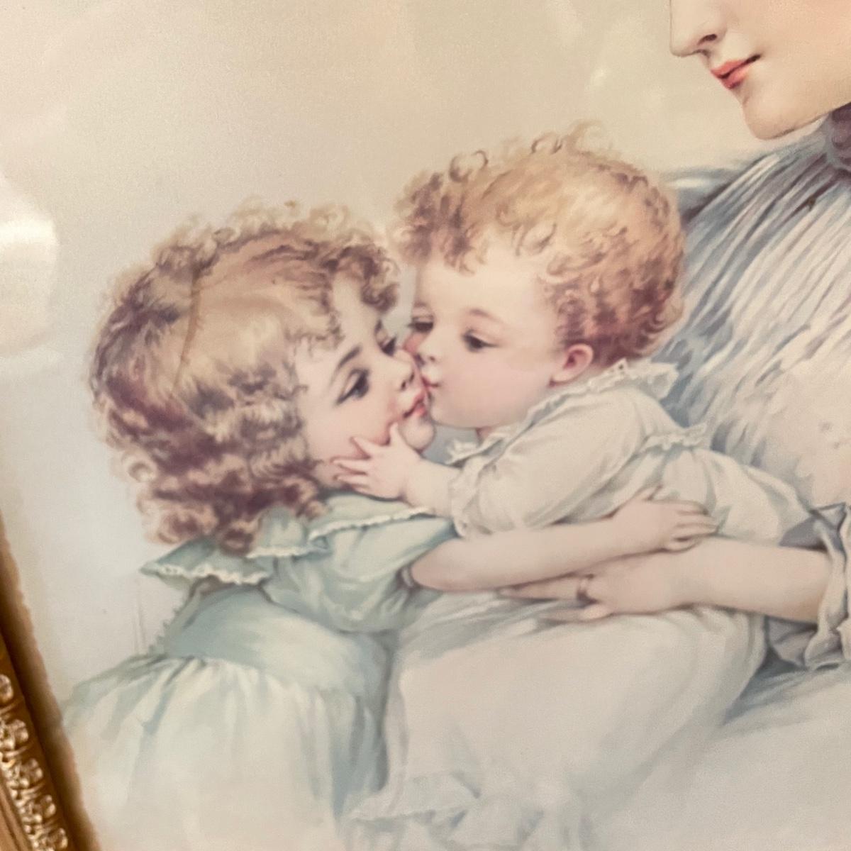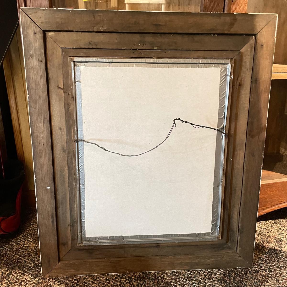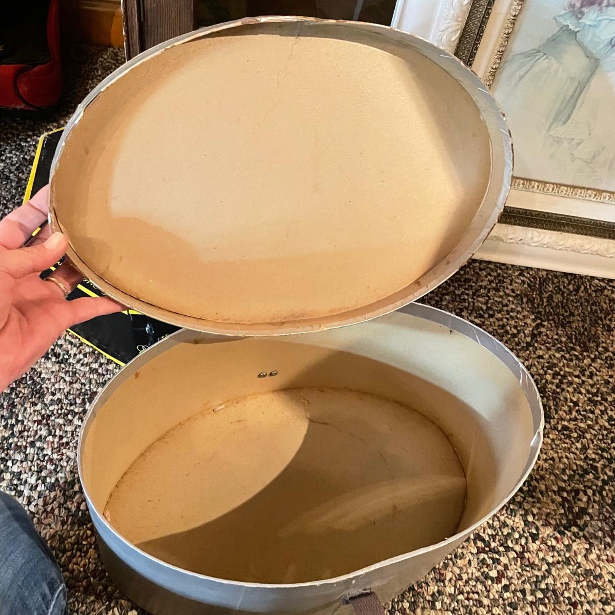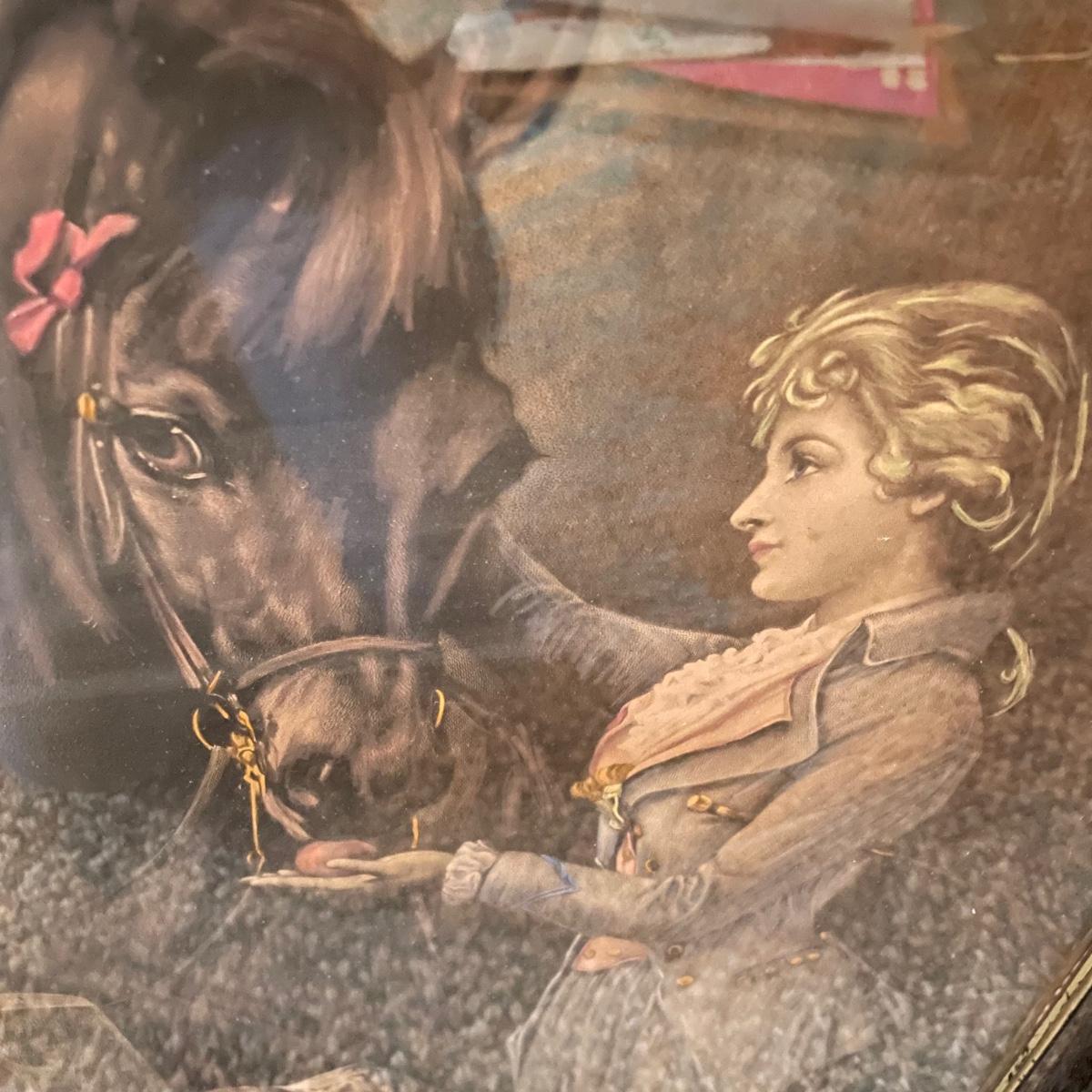 Victorian era art with newer advertisements for Belk-Simpson and In Dear Old Sweetheart Days. Lot also includes two vintage hat boxes. The largest gold and white wooden frame measures 26” x 30” and the smallest Ballad sits behind glass in a black plastic frame measuring 11.25” x 14.5”. The Stetson hat box is 15.5” x 10” x 7”. See images. Local pick up only.