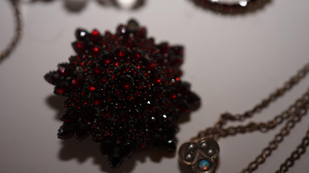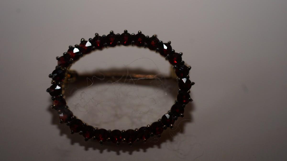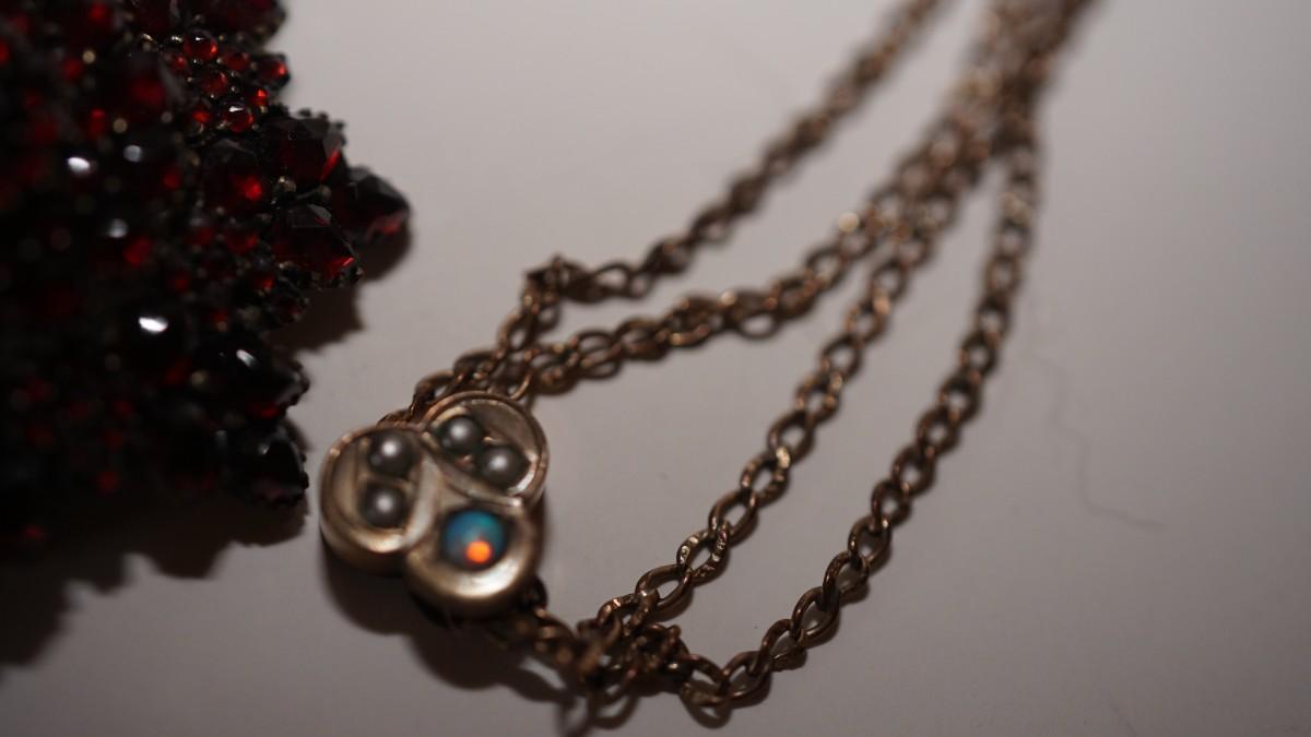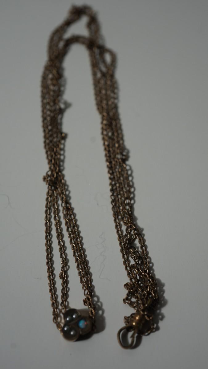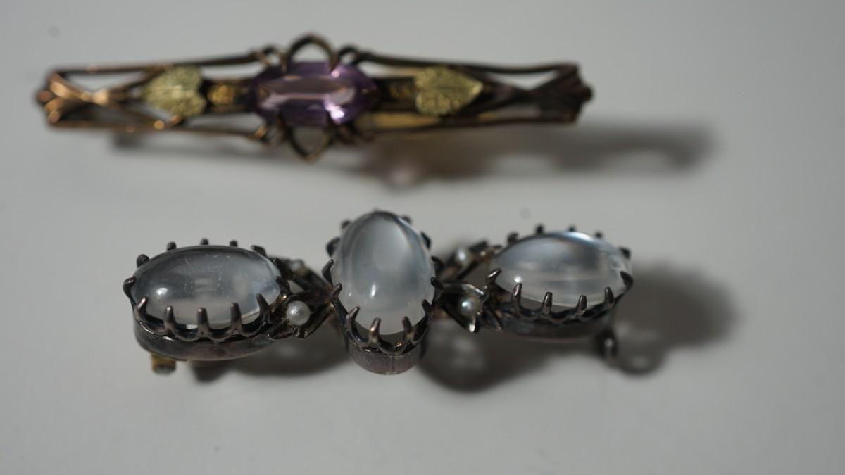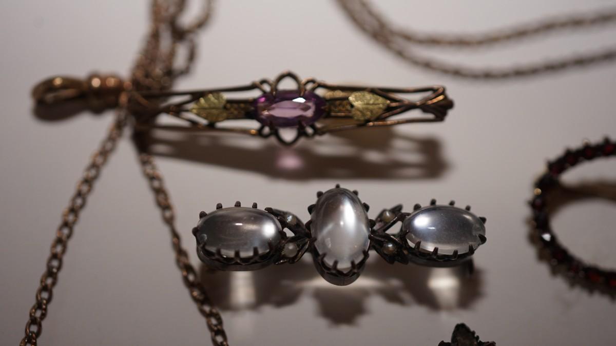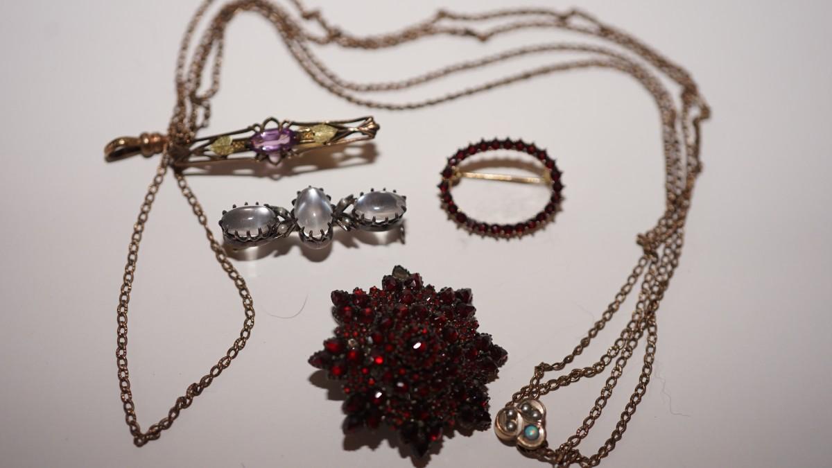 There is chatelaine of a gold-filled , rose gold tone slide of small faux pearls and opal like stone. there is a clasp at the end to use on a watch or to attach to a belt. pin- amethyst colored stone set in prongs and facet cut. The three-moonstone pin in also prong set. oval garnet pin prong set.