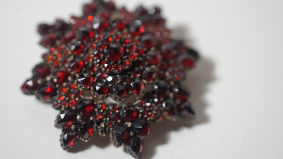 three pins that measure about 1 1/2" in length one pin the oval garnet pin is just under 1" . The star garnet pin of dimensional tiers is missing garnets at the tip of one of the star points. See photo.