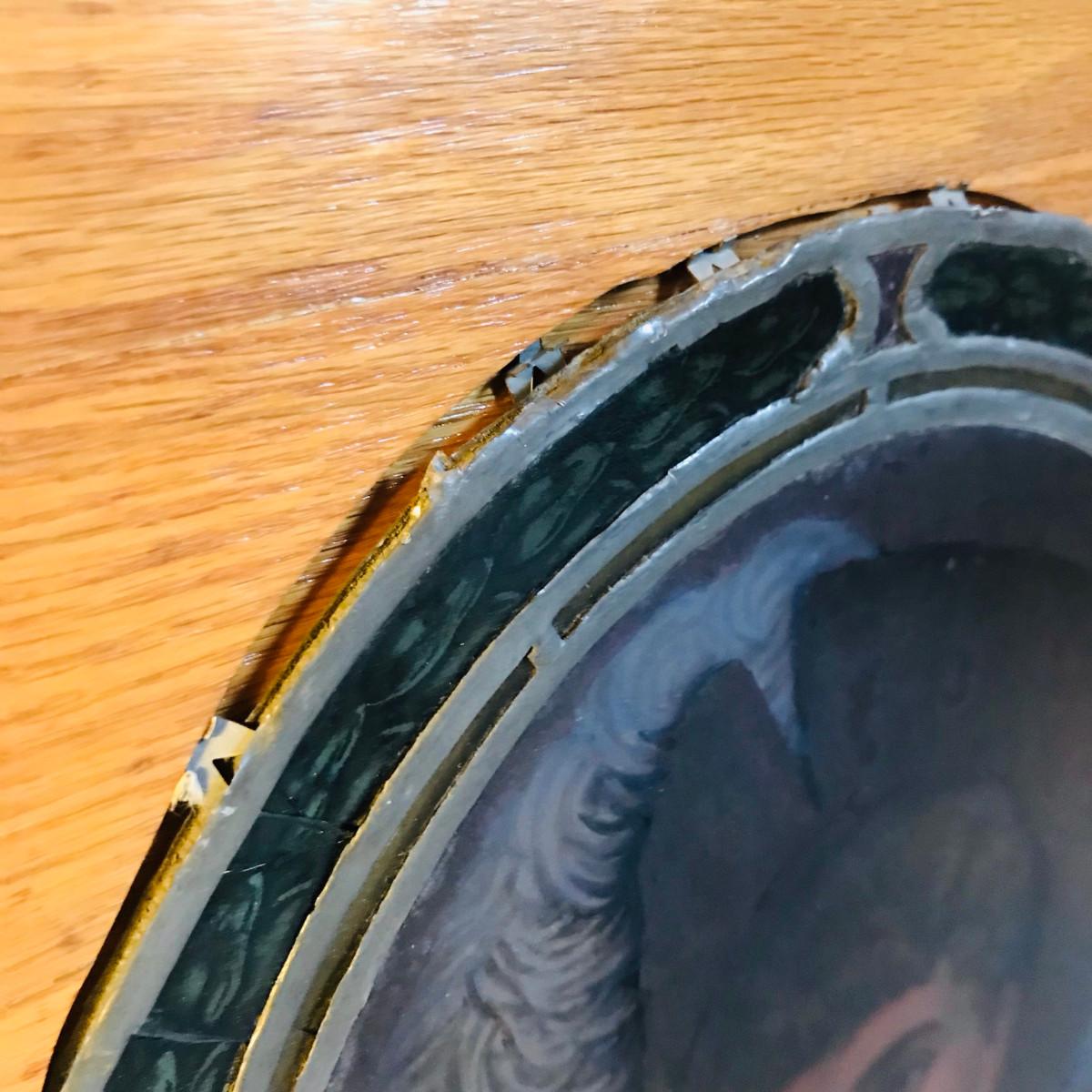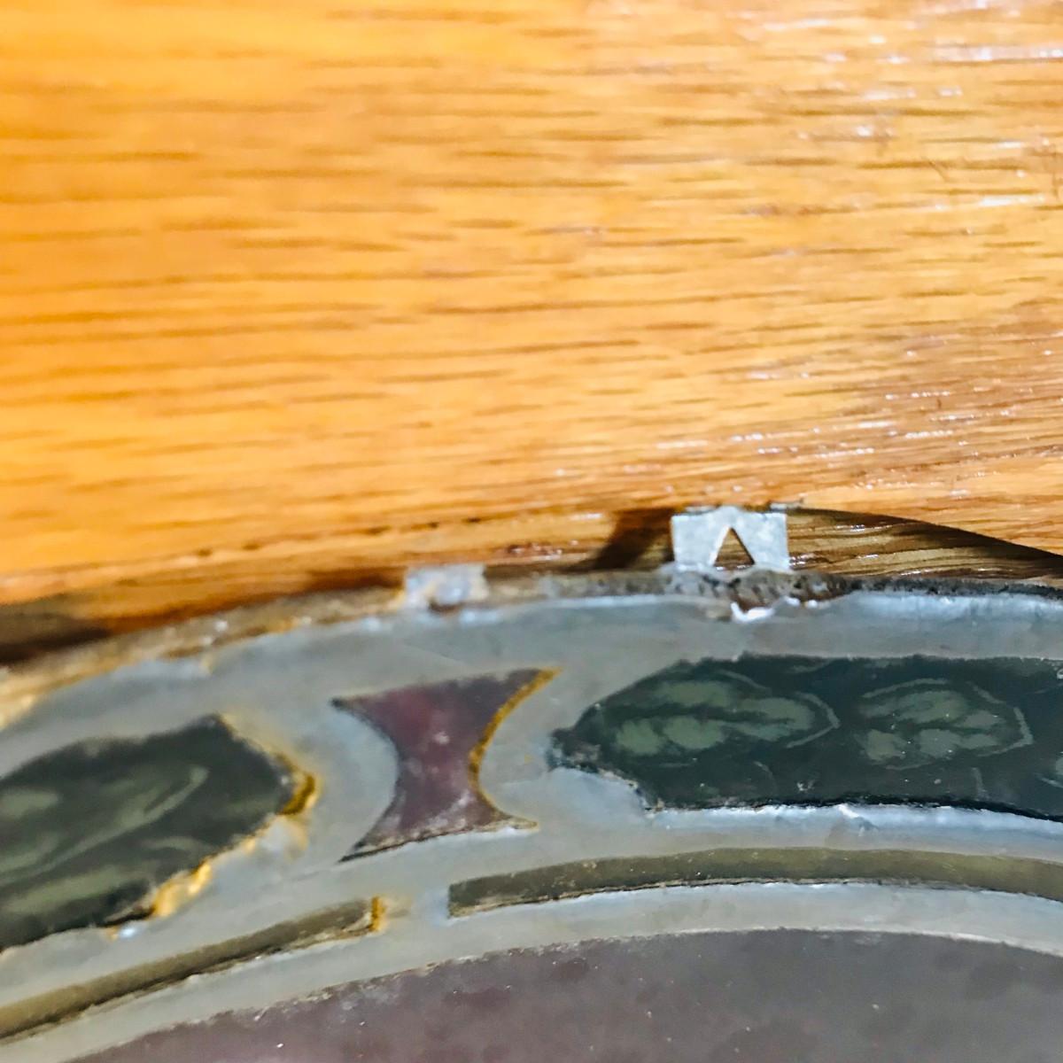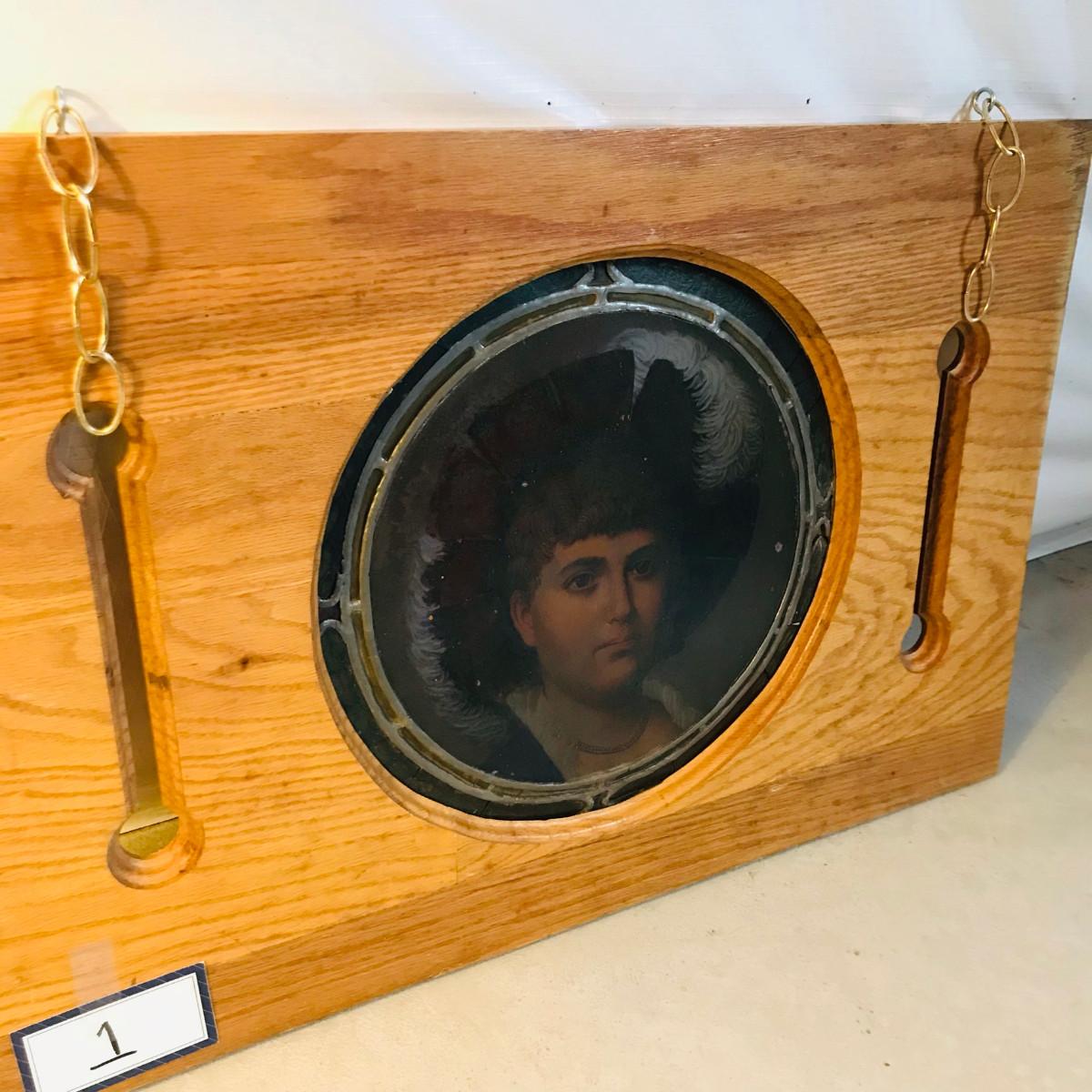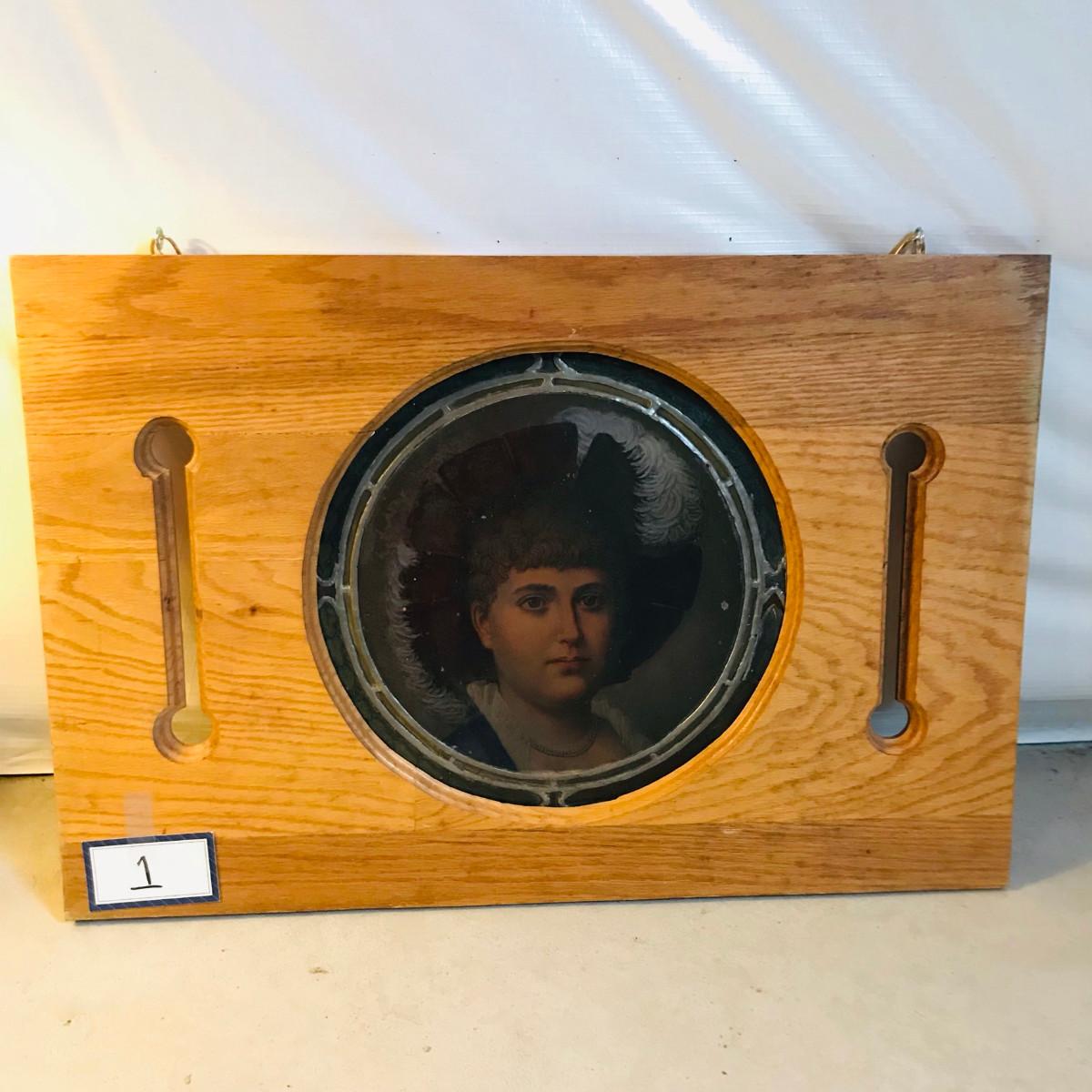 Awesome old round window, placed in a newer but vintage style oak frame! There is no damage to the face area, but the laurel edge has a piece missing. Still a wonderful piece!