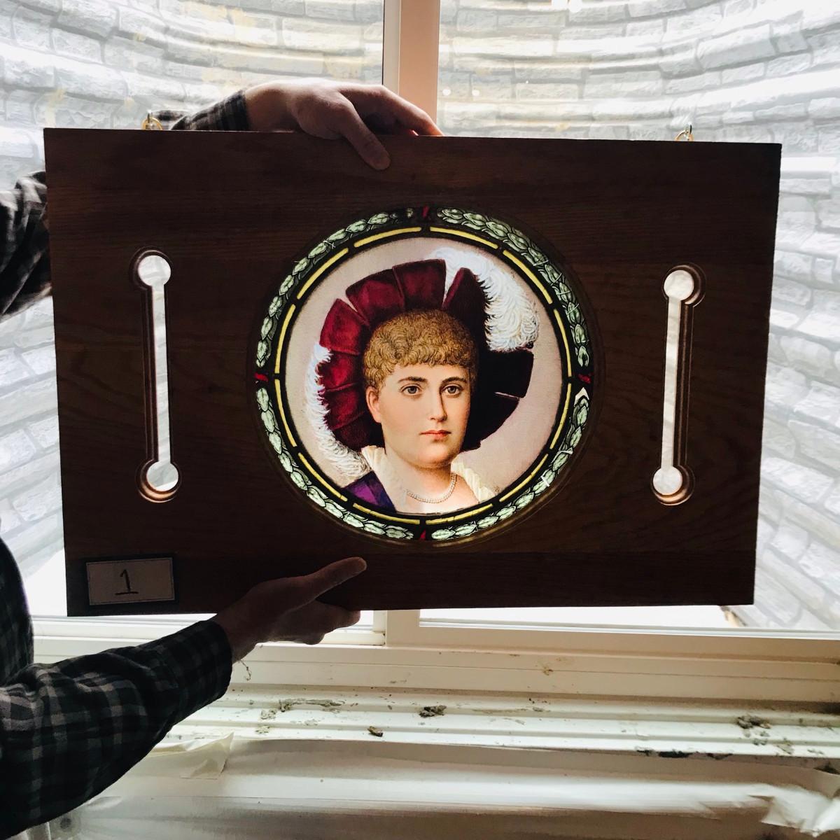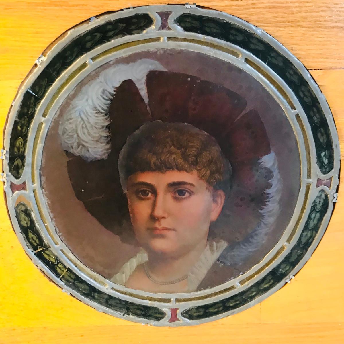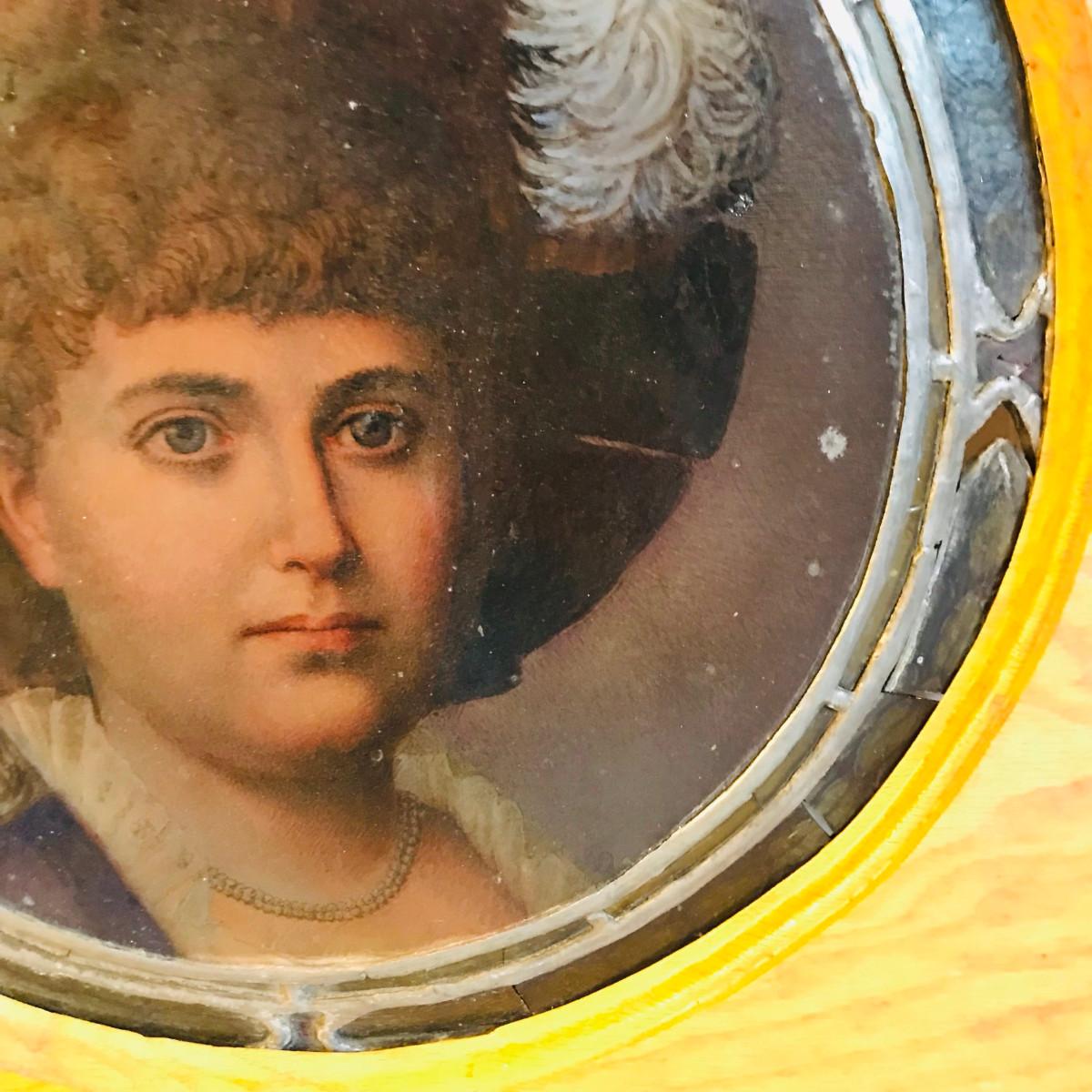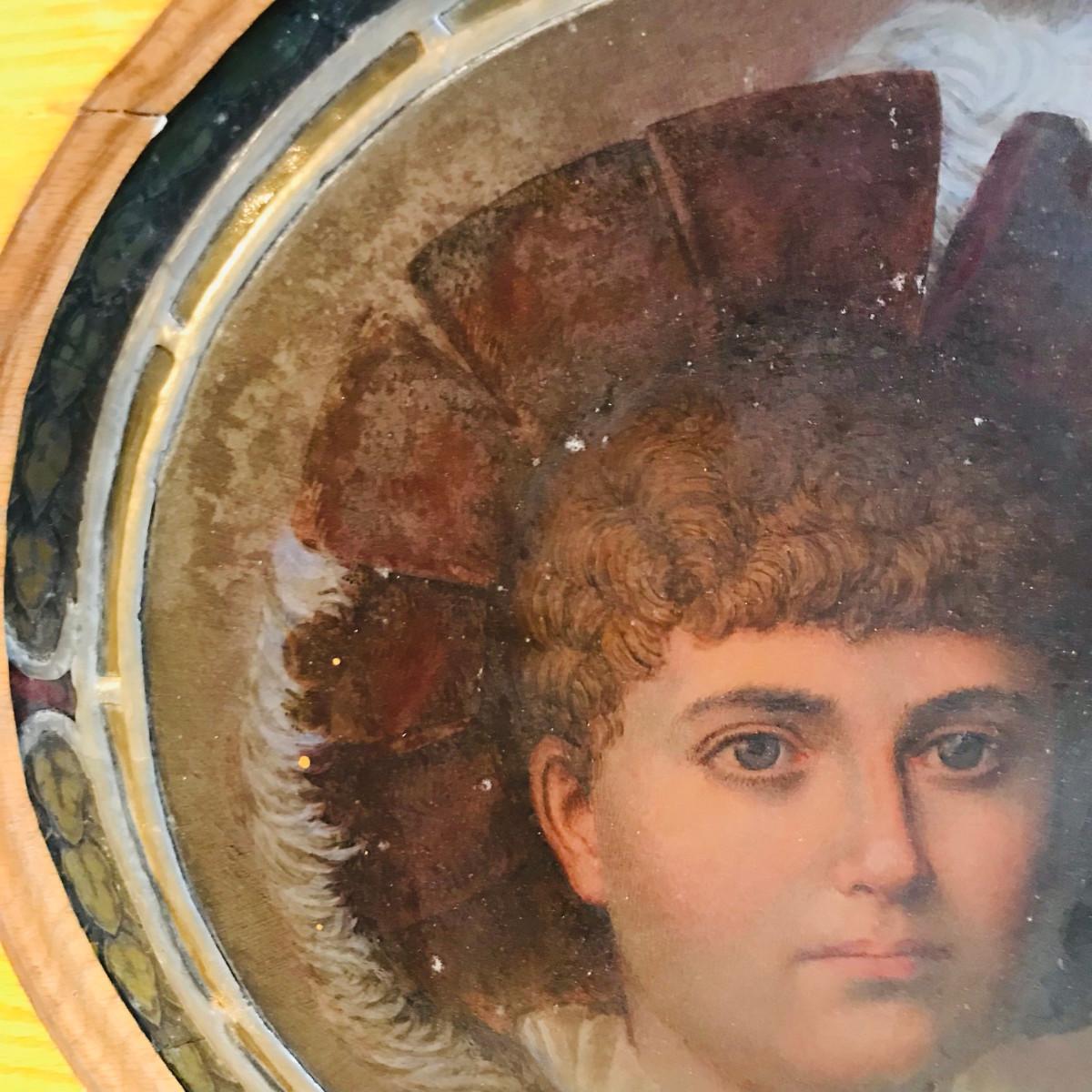 Awesome old round window, placed in a newer but vintage style oak frame! There is no damage to the face area, but the laurel edge has a piece missing. Still a wonderful piece!