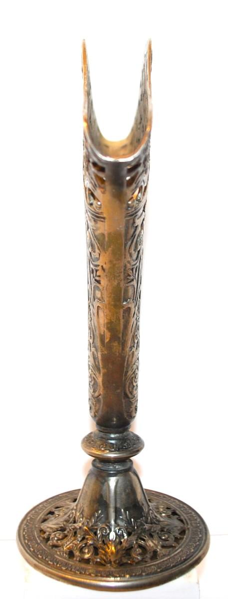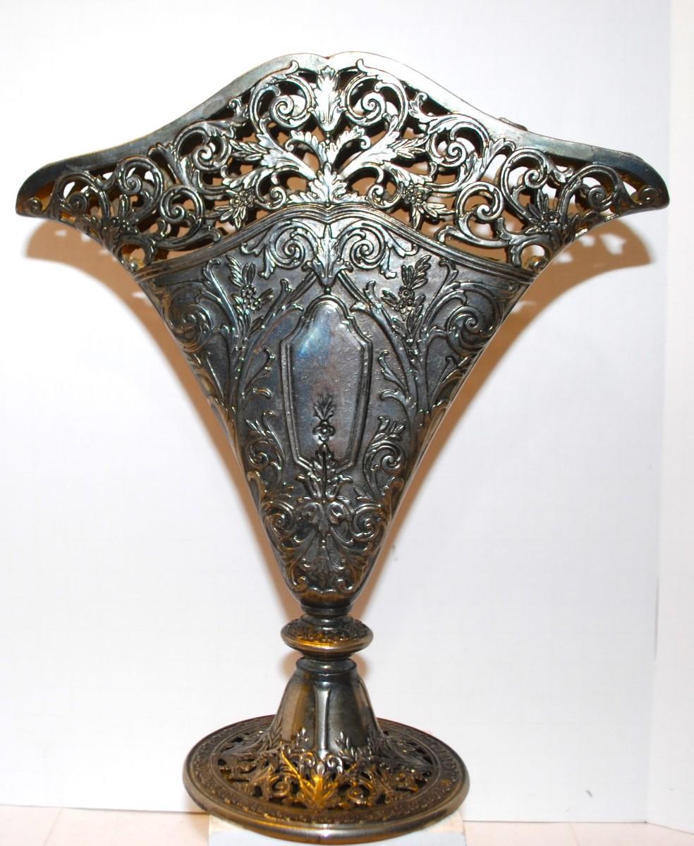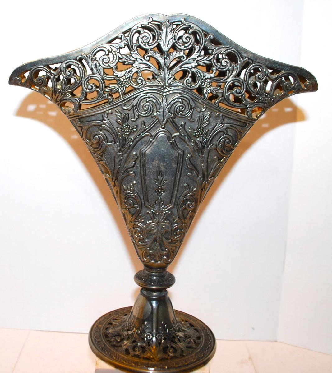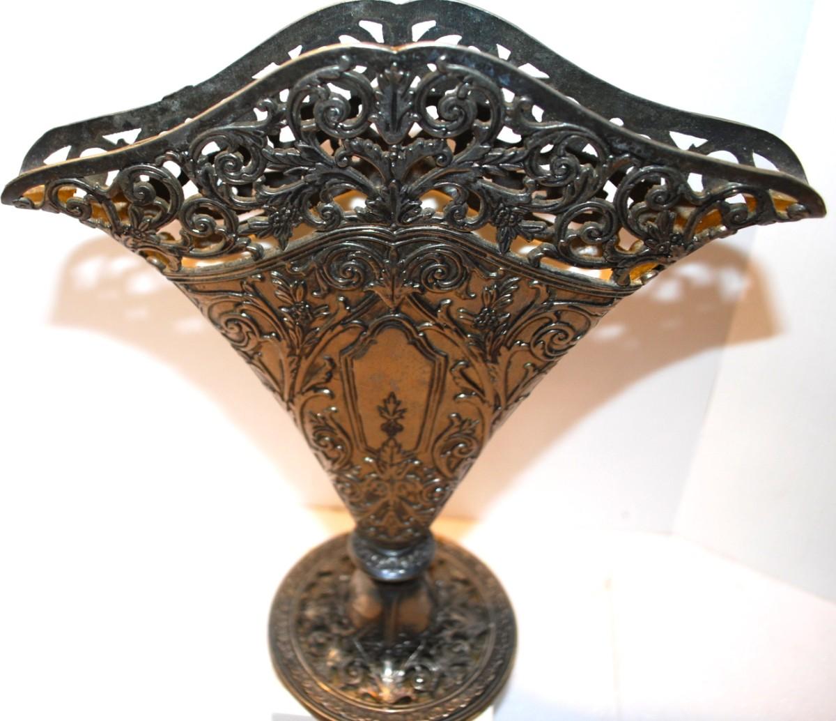 Victorian Fan Shaped Vase Silver Plate Ornate Maybe Godinger. Solid Filigree Fan Shaped Flower Vase, Use for Flowers or Napkins. GSA ©. 1991