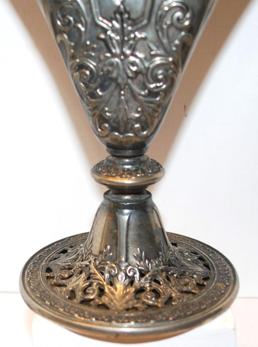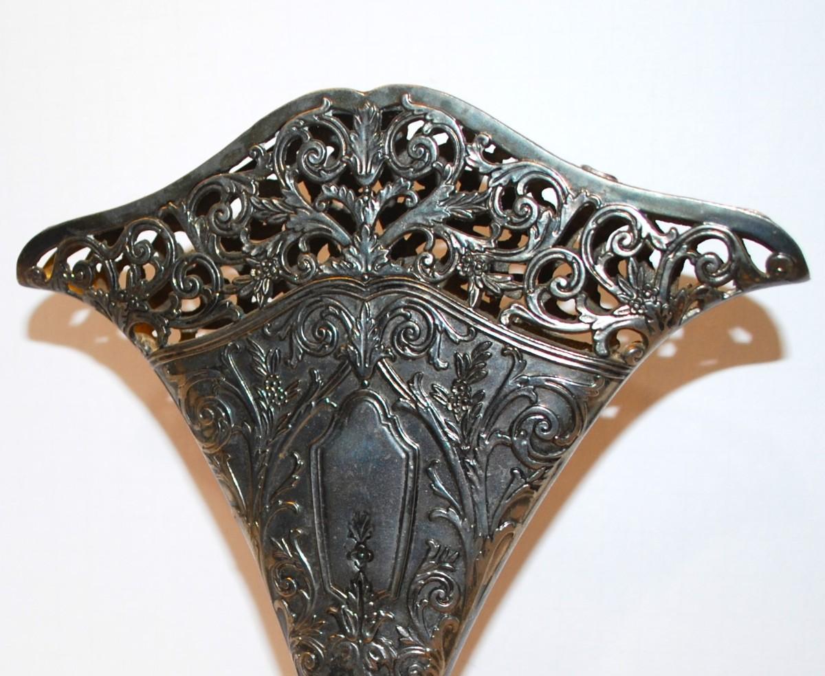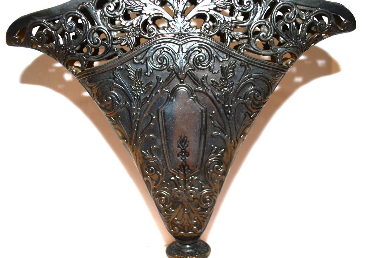 Victorian Fan Shaped Vase Silver Plate Ornate - Solid Filigree Fan Shaped Flower Vase, Use for Flowers or Napkins. SEE DETAILS