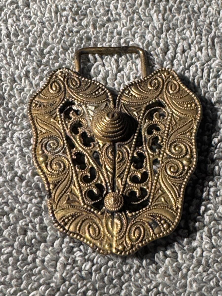 Material and Design: It's typically made of gold-toned metal, possibly brass, featuring elaborate filigree work, which is a delicate, lacelike ornamentation made from fine wire, and may include other ornate elements like scrolls, beads, or raised central motifs.