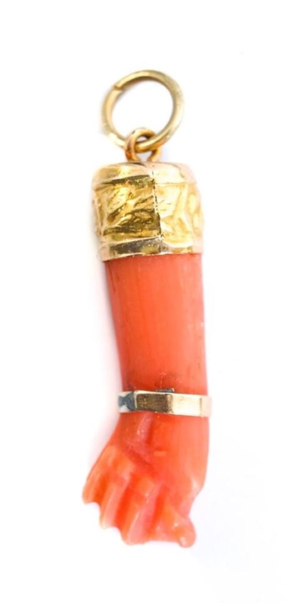 Victorian yellow gold and coral Figa Fist charm or pendant. Approx. length 1.12", weight 1.6 grams.