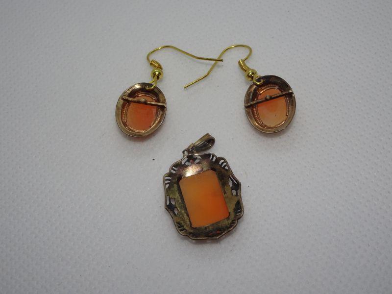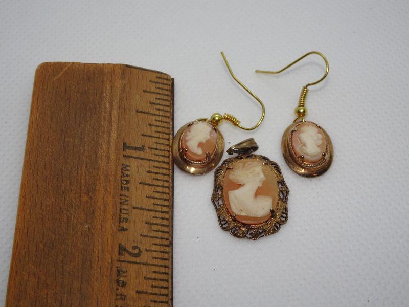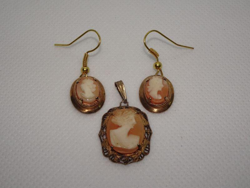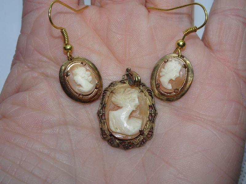 Victorian Gold Tone Shell Cameo Pendant & Earrings