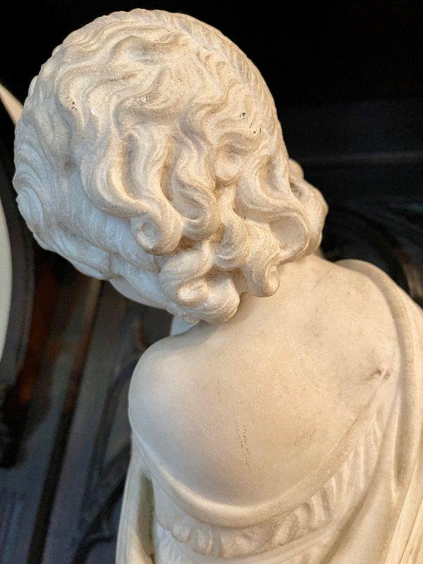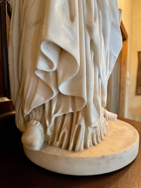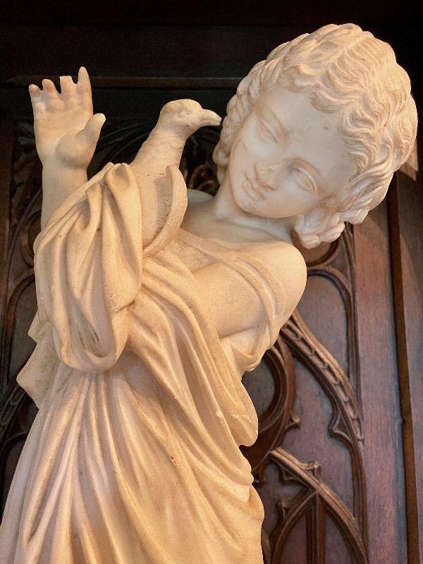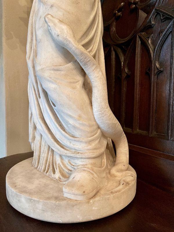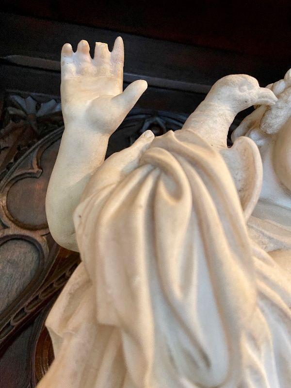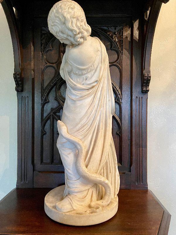 The subject item for sale is a charming, masterfully carved white marble figure of a child rescuing a white dove from a snake. Perhaps a reference to the New Testament verse encouraging one to be "wise as serpents, and harmless as doves". The classically dressed child cradles the frighted bird wrapped in her arms as she bravely confronts the climbing snake still determined to have its prey. One finger on the proper right hand is missing. The carving is in otherwise good condition with expected cleaning wear.