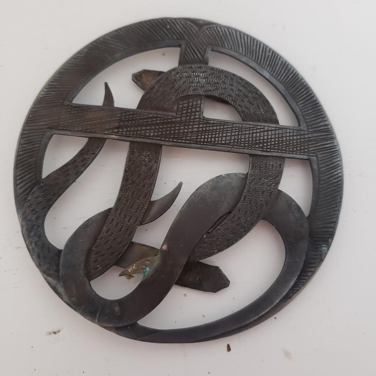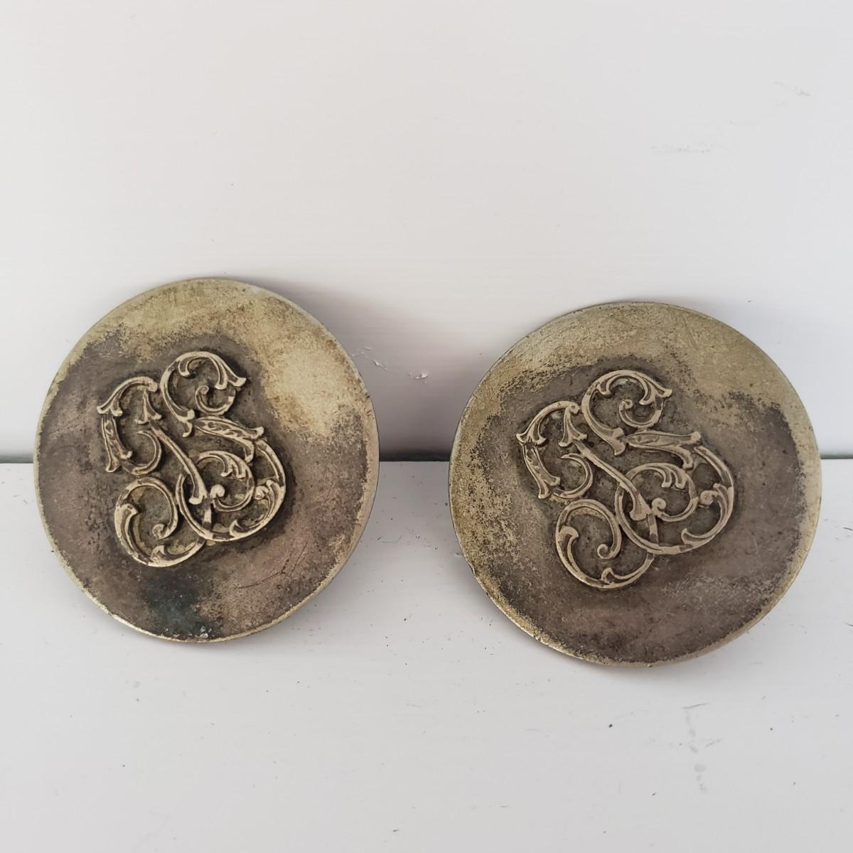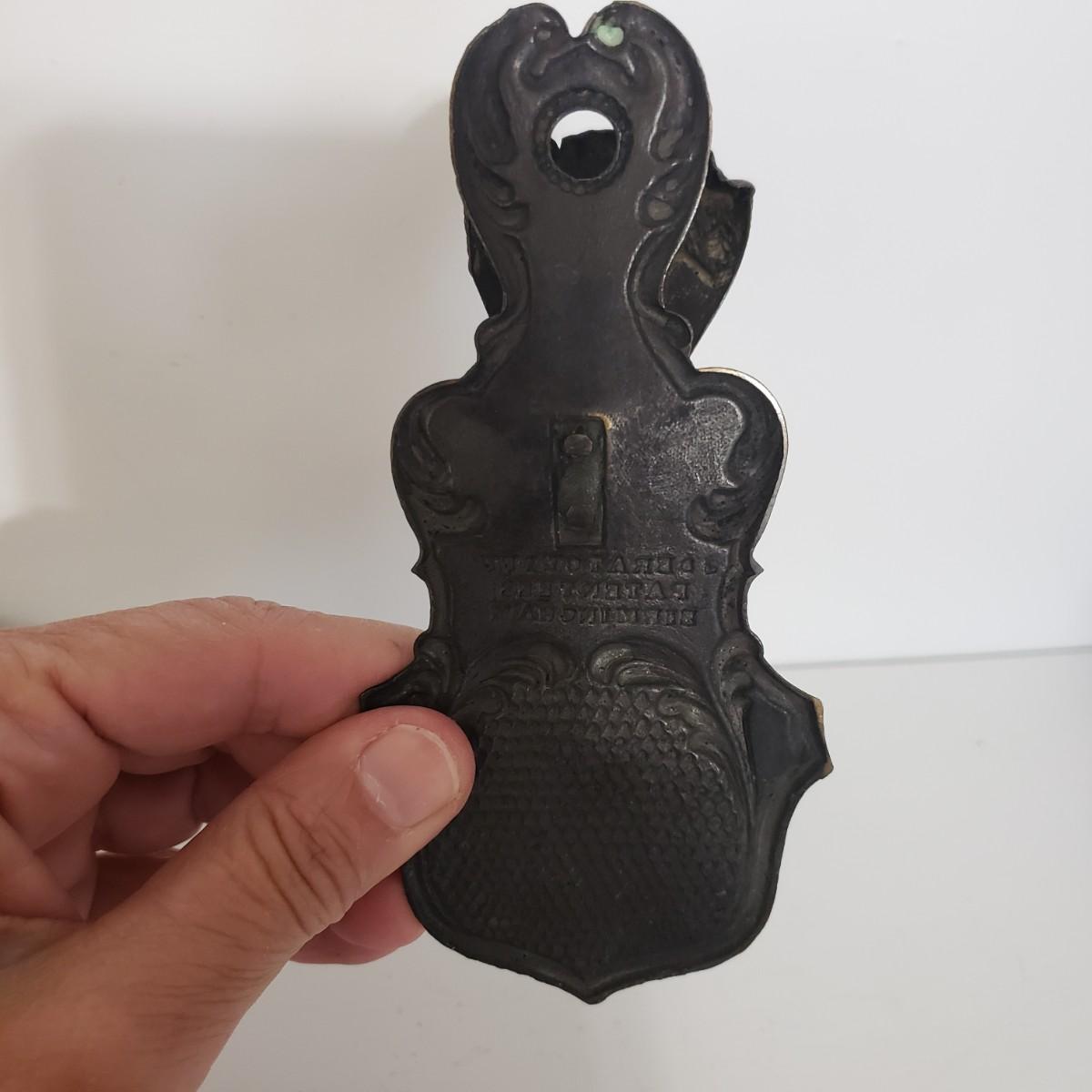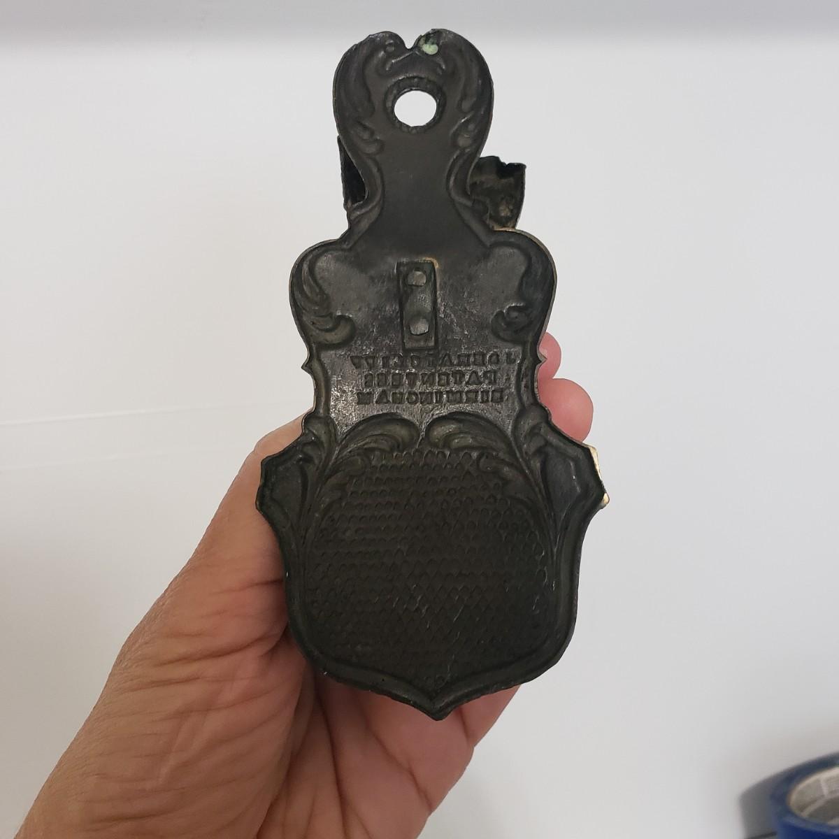 This lot features a victorian hand paper clip J&E Ratcliff Patent Birmingham made of brass and measures 6" x 3" x 2"H. The stamped markings were hard to photograph right side, but the reverse is in the pictures. The metal serpentine piece measures 3". There are two hook like pieces on the back. The metal "S" also has a metal hook on the back. This piece has some green patina on the front. The two metal matching monogrammed pieces have a bracket on the back.