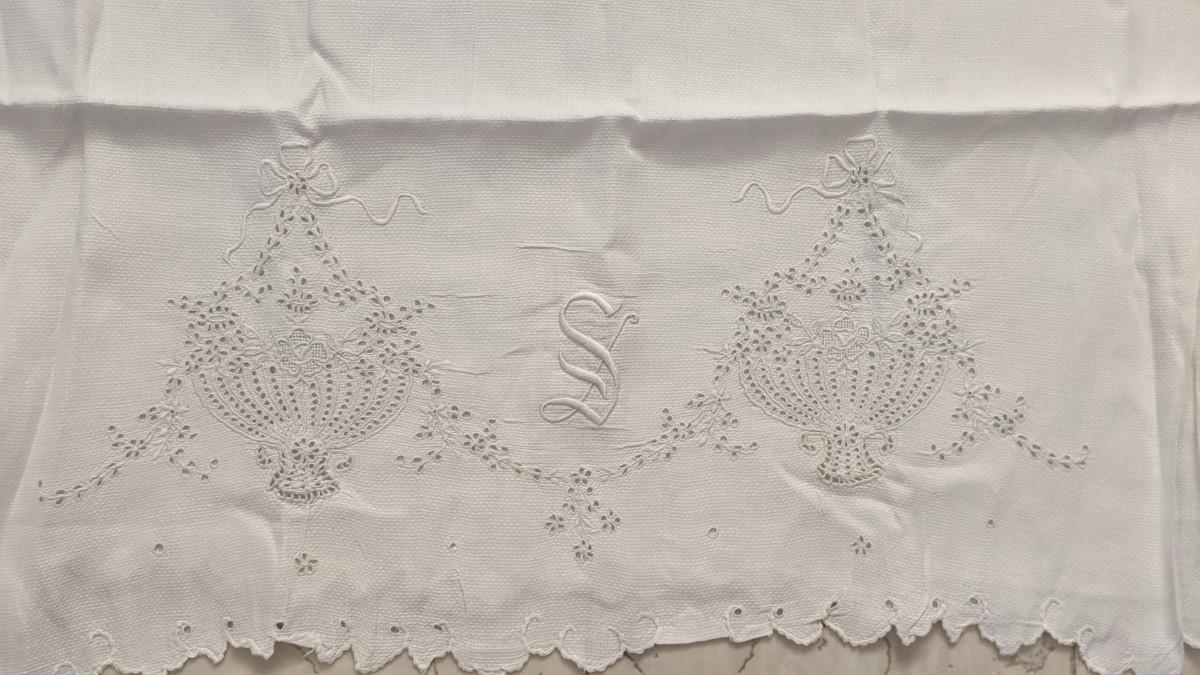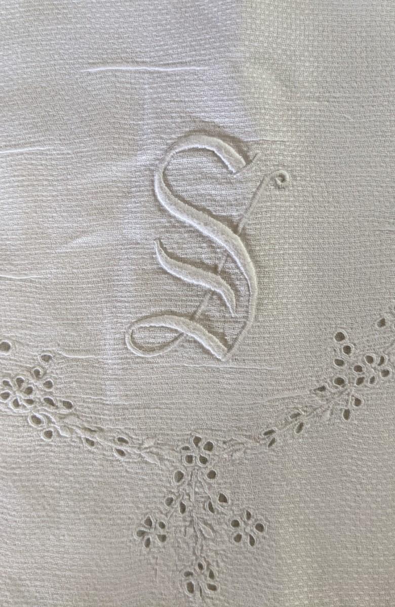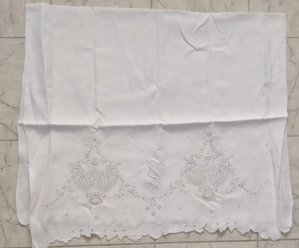 Victorian handmade Embroidery Broderie Anglaise White Linen towel Initial S