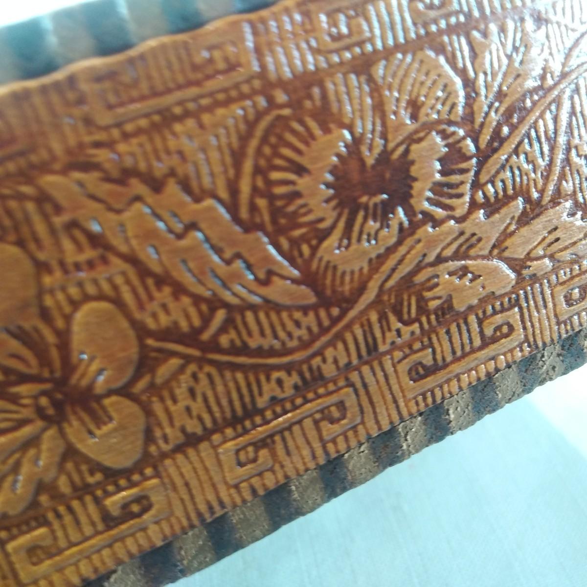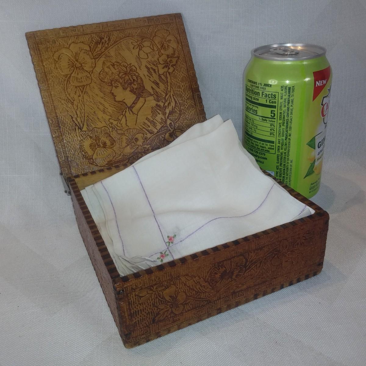 This auction lot is for a Victorian Hanki Box. This very nice Victorian box comes with 5 vintage hankies. It is very ornate with pressed designs on the lid - inside and out and on all sides. It measures about 5.25-inches square. Very nice find.
