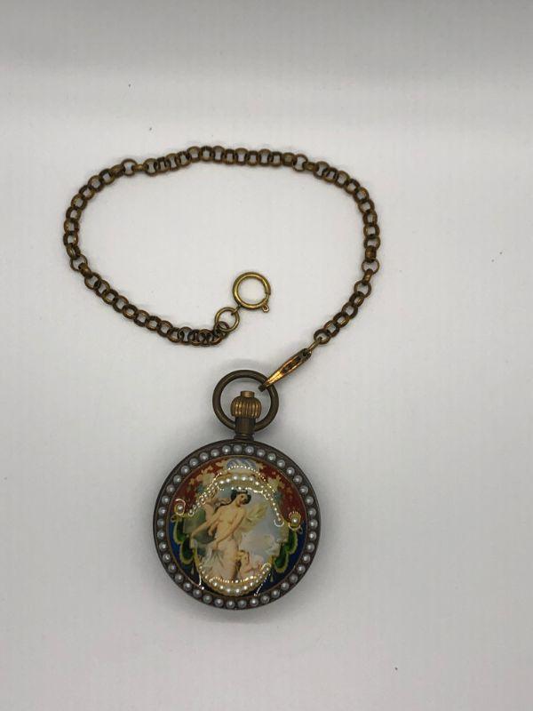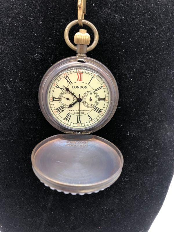 Victorian image decopage pocket watch by London. Images on both sides with added faux pearls. Heavy. Push button open. Wind up. Currently running. Has a day and seconds dial. Comes with a 10" chain. Watch is about 2" size. Swiss made.
