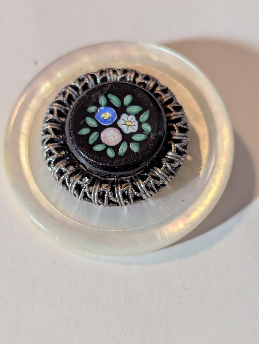 Victorian Jet Button w/Enamel ca. 1880-1900 Set On Vintage White Pearl 1930's - 1940's #14