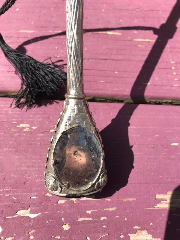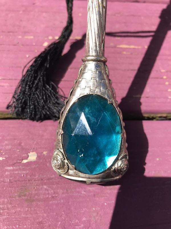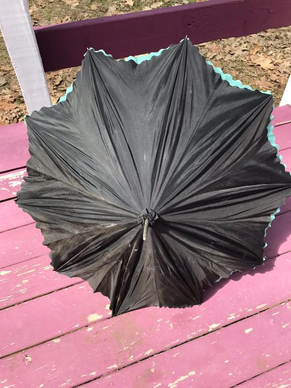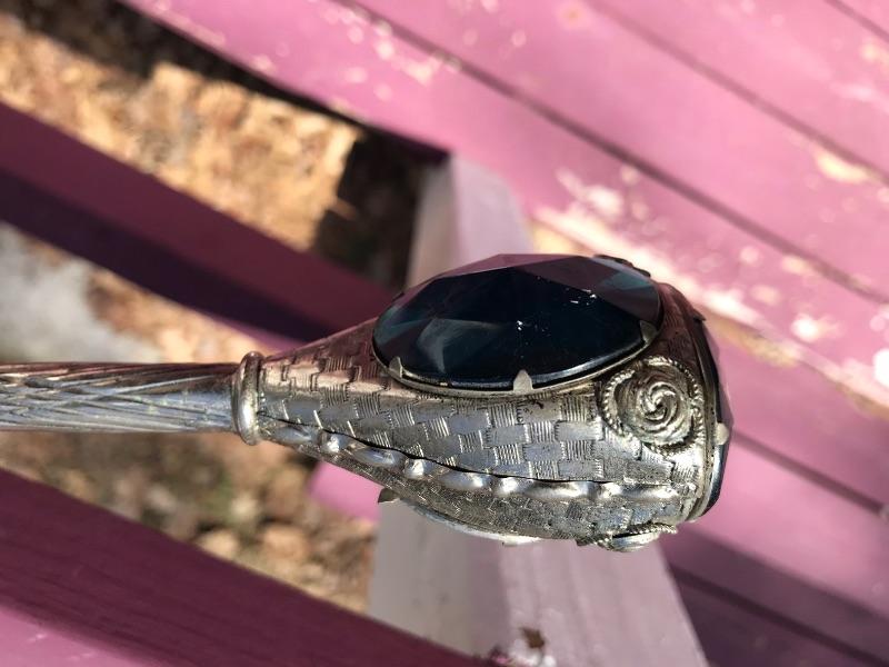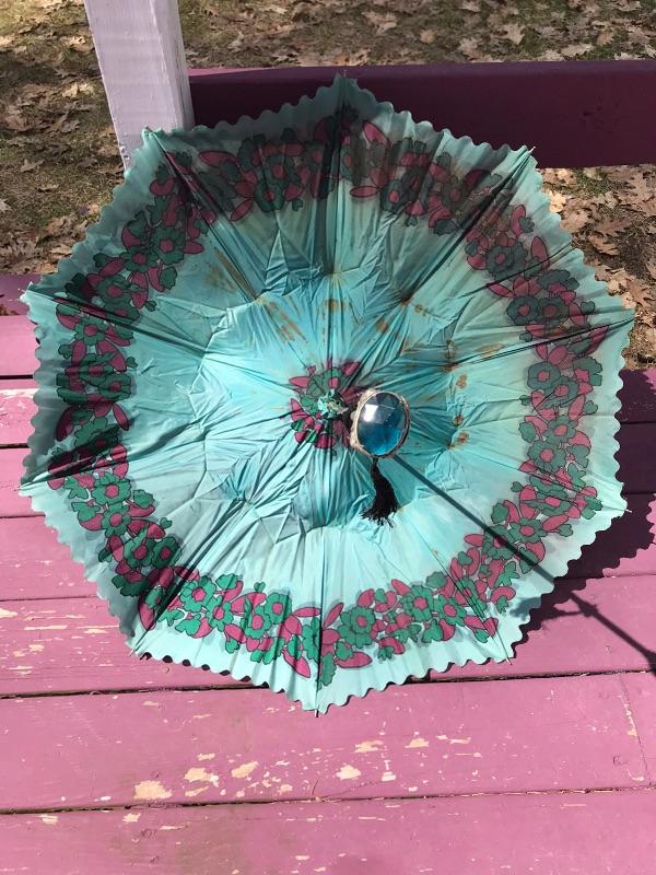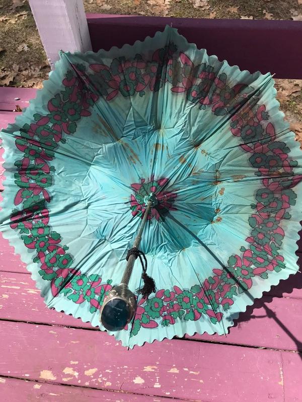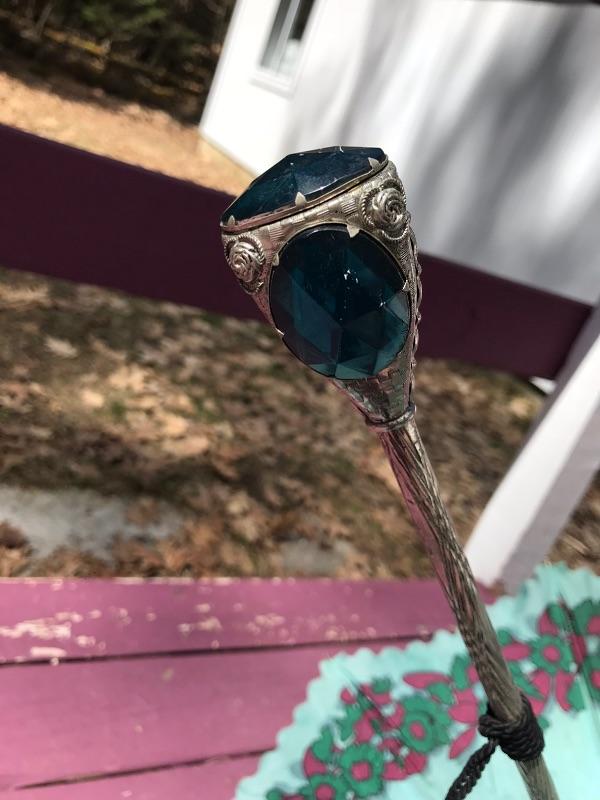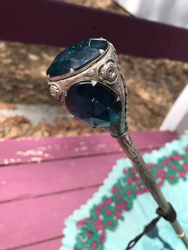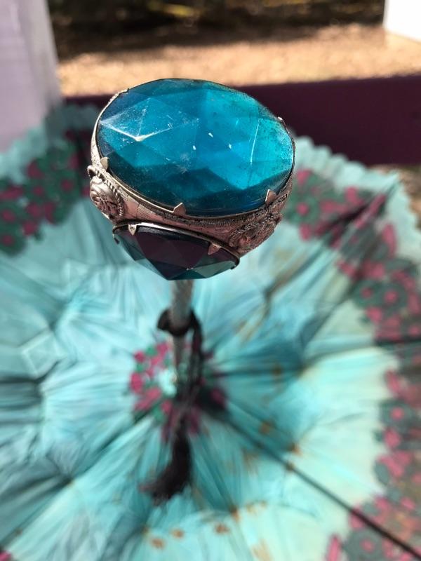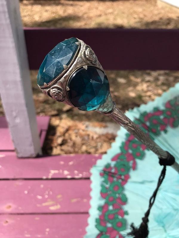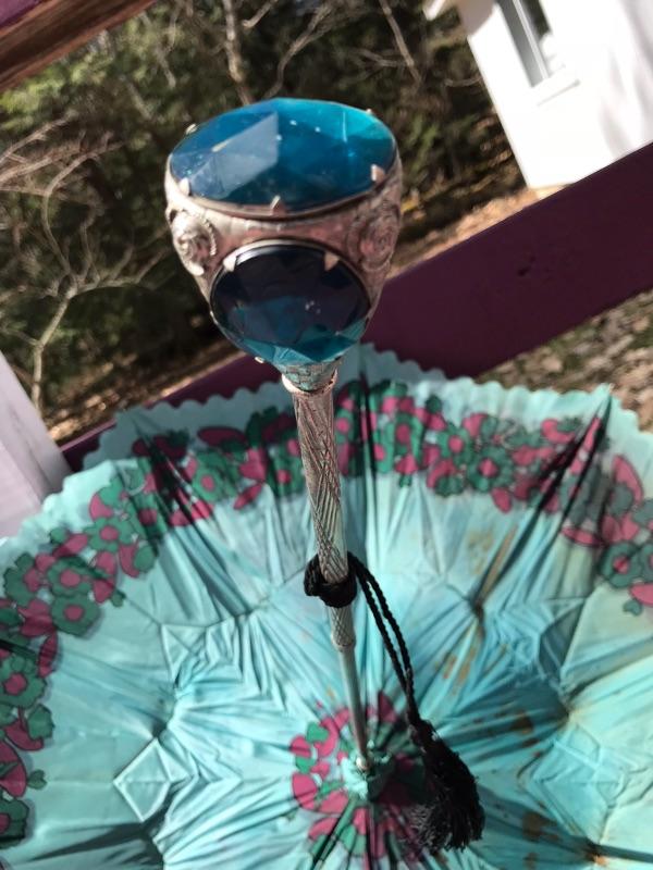 Here is a beautiful Victorian umbrella. The handle has costume blue/green jewels and silver plate carvings. It is missing one of the jewels.