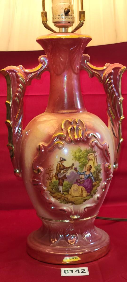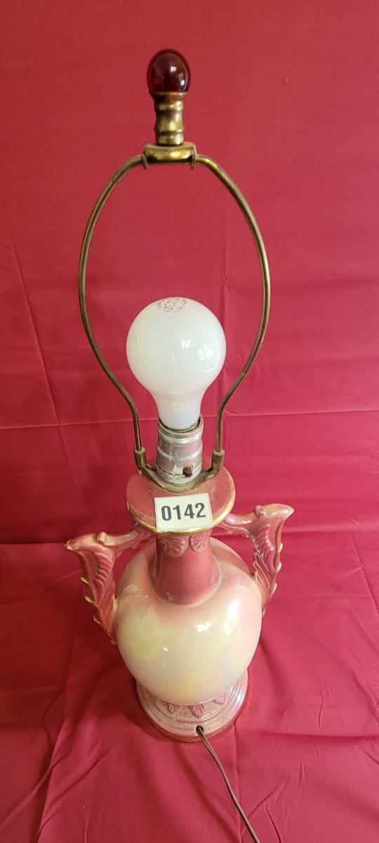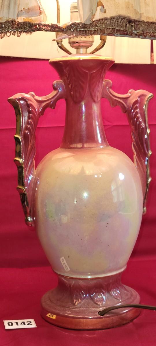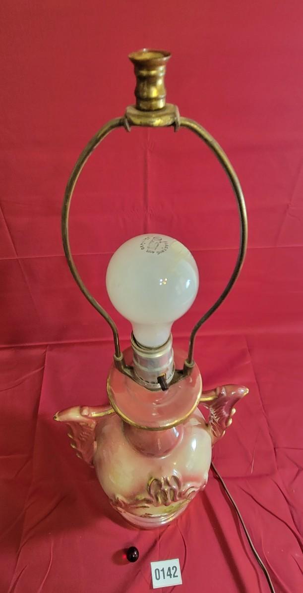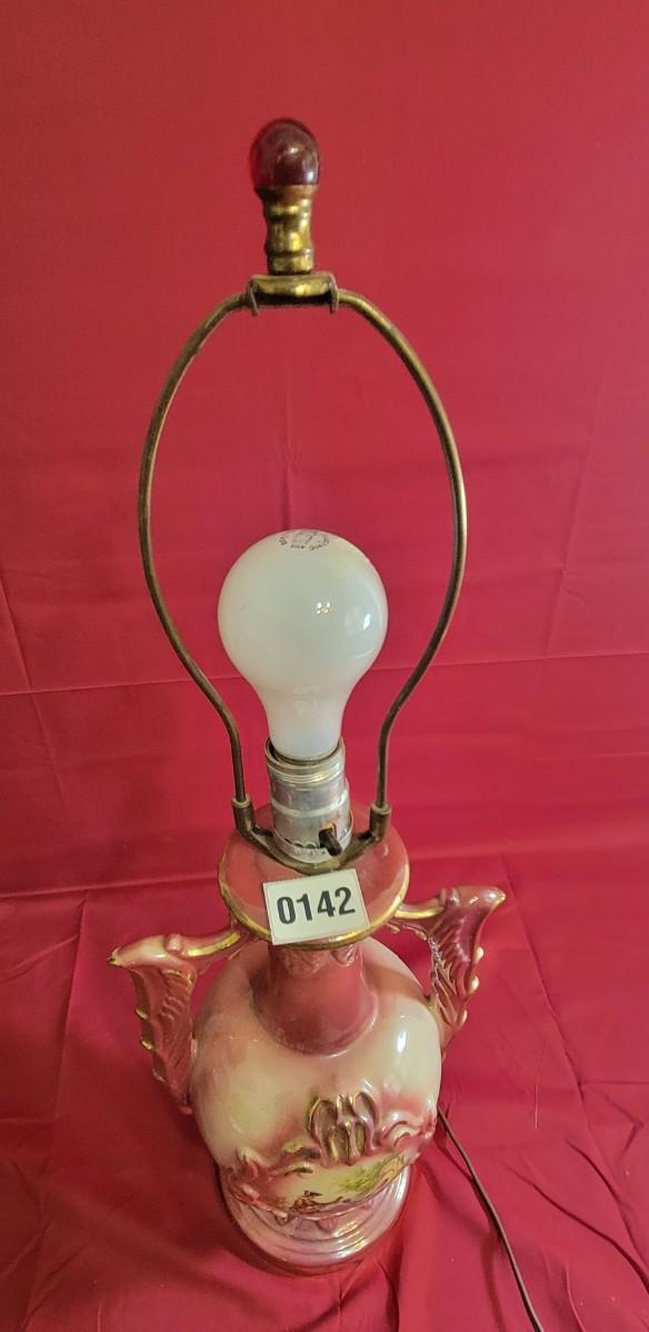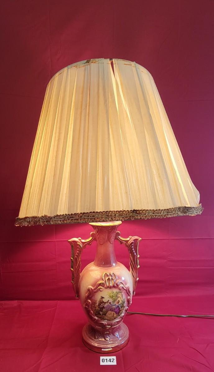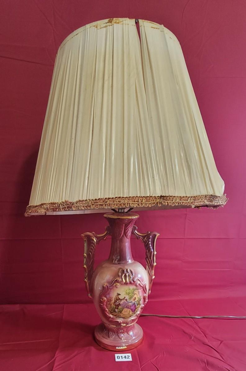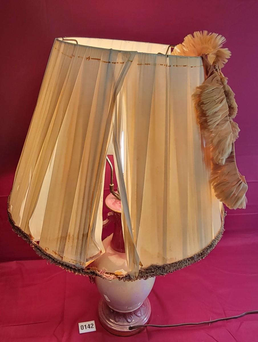 Lamp is in working condition. Lamp shade is in poor condition. The glass finial is loose and will accompany this lamp when acquired through purchase.