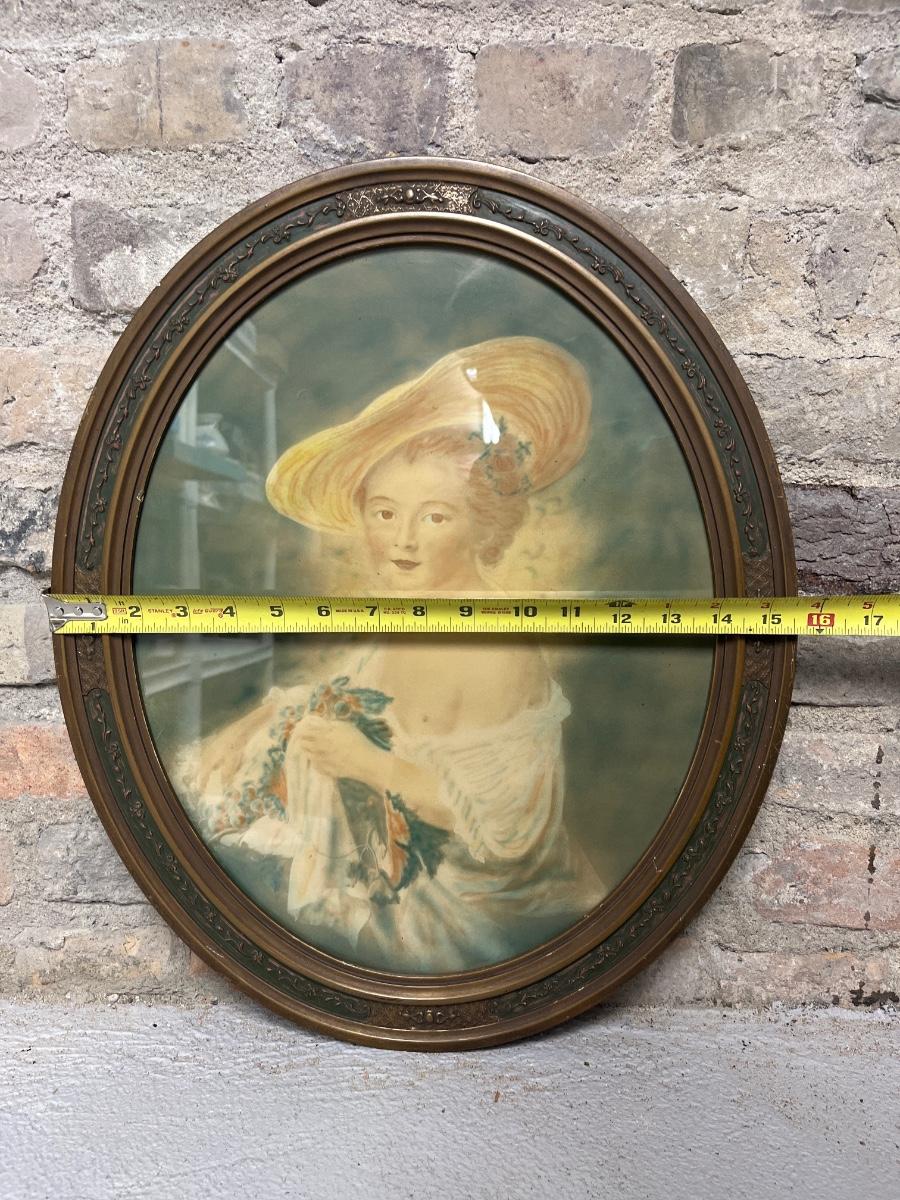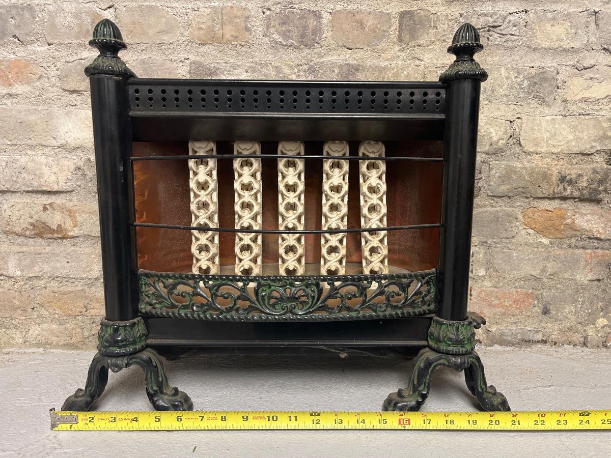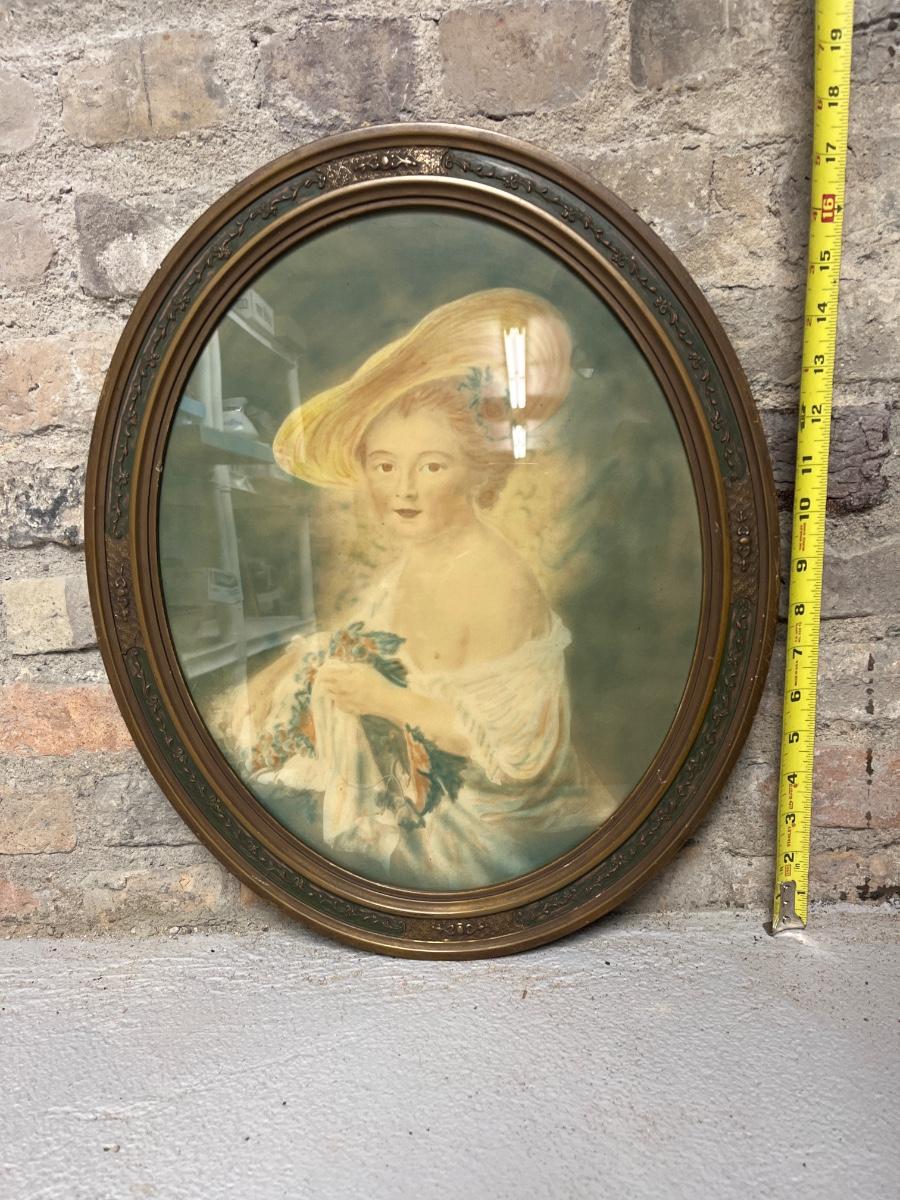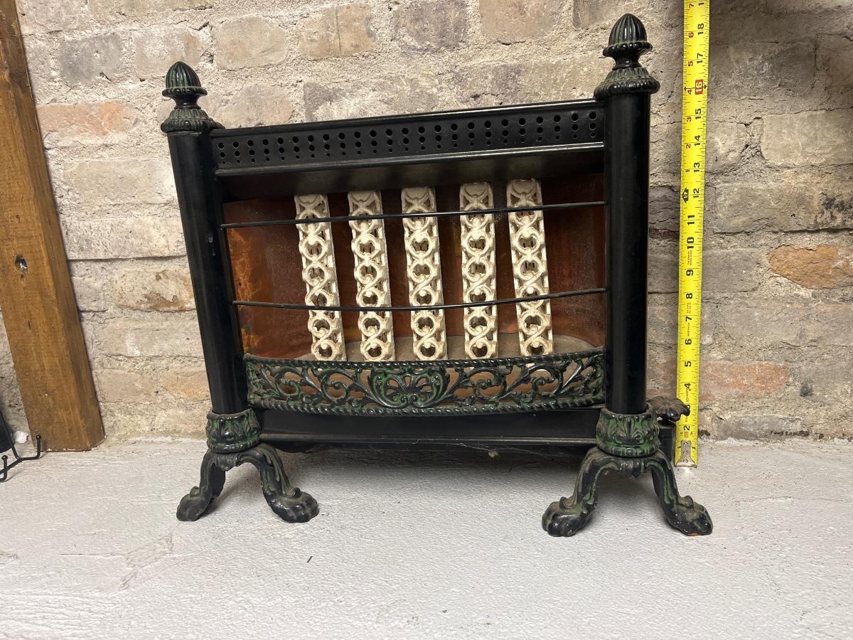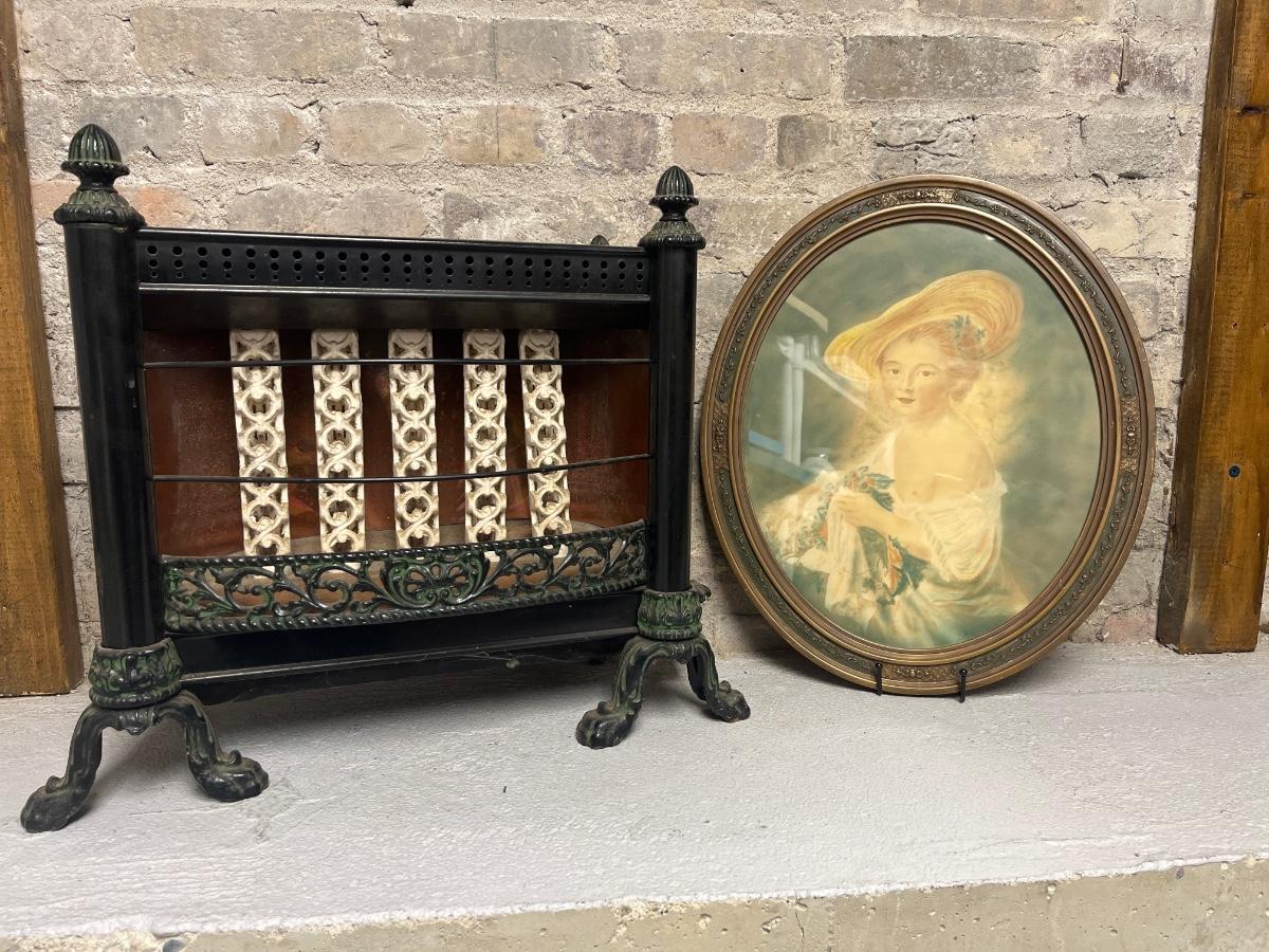 Cast iron gas heater - ceramic bars, copper backing. And an antique oval frame with lady print